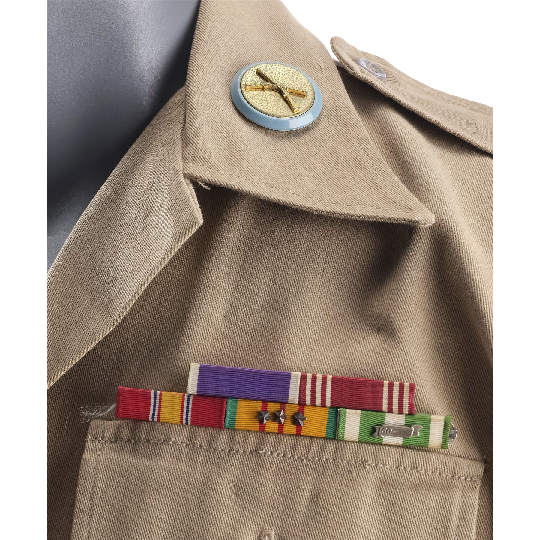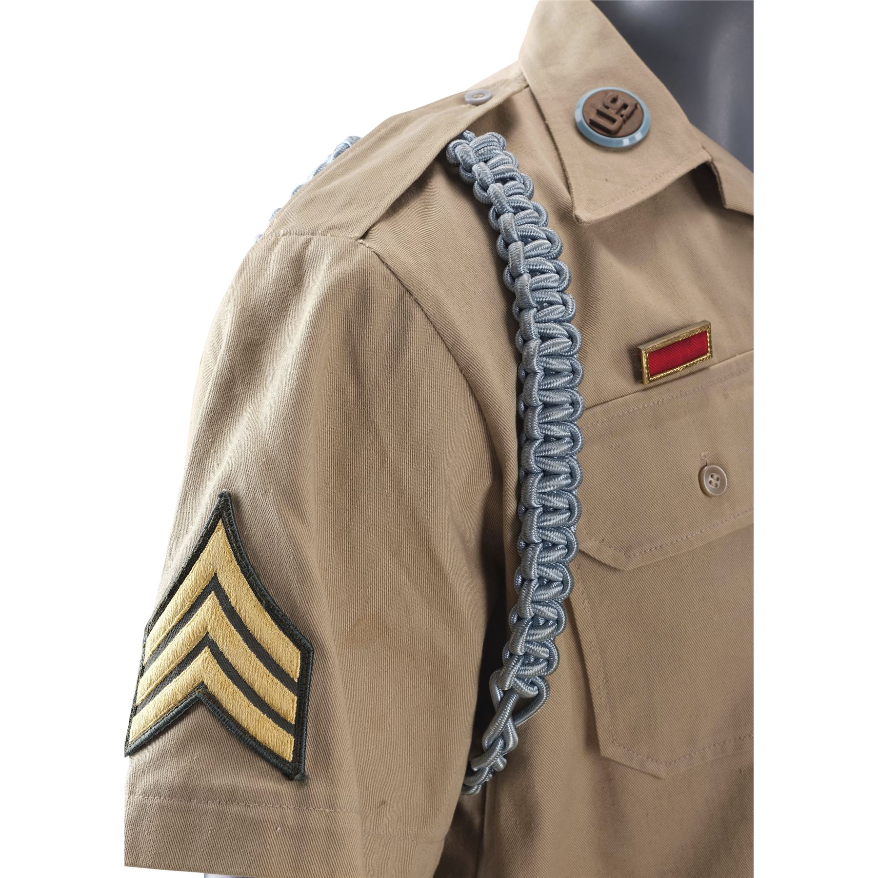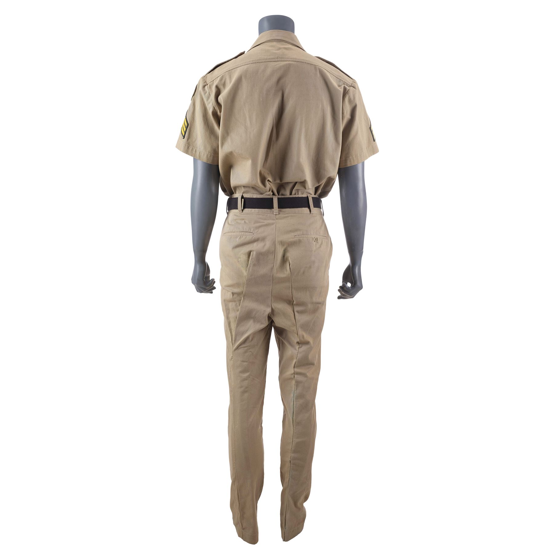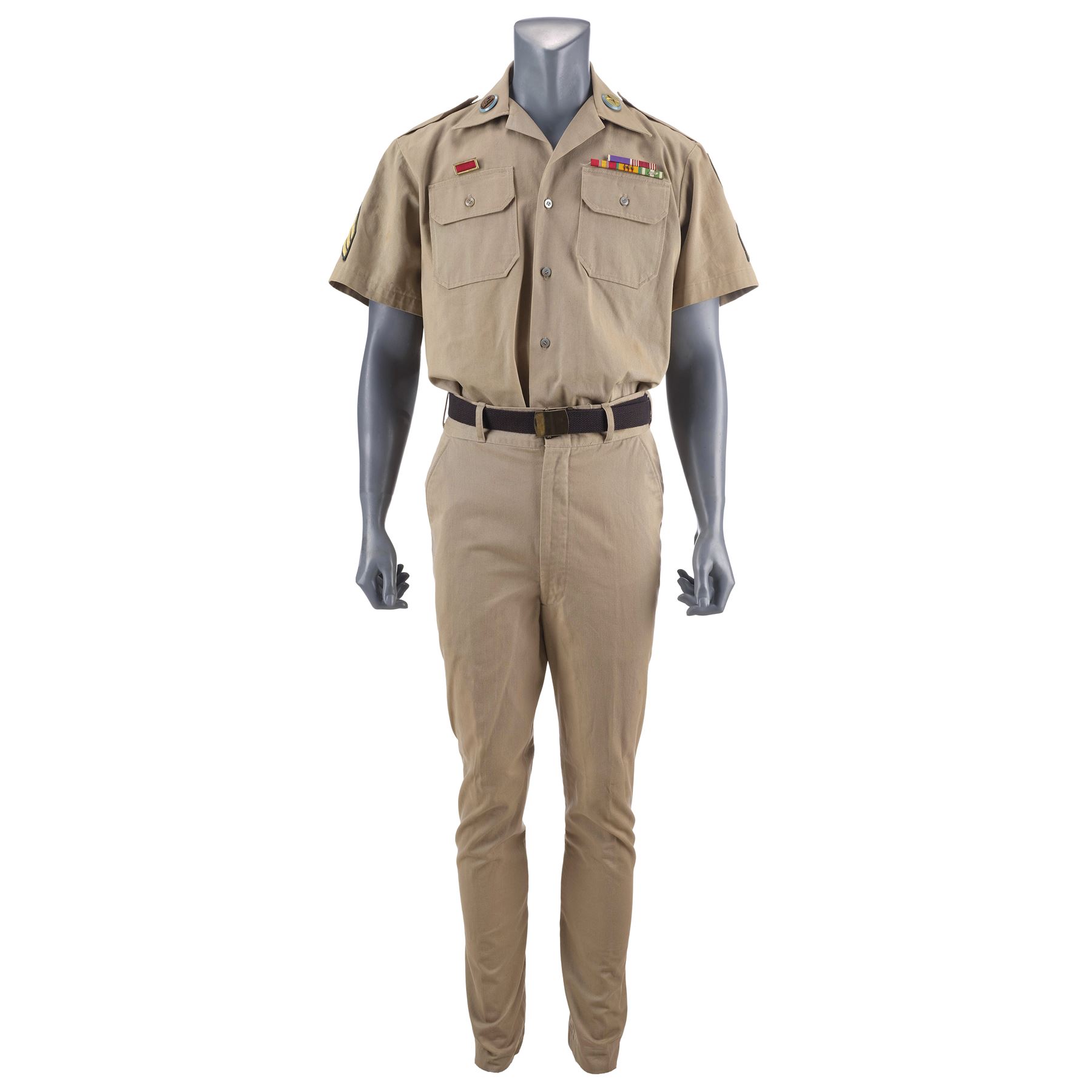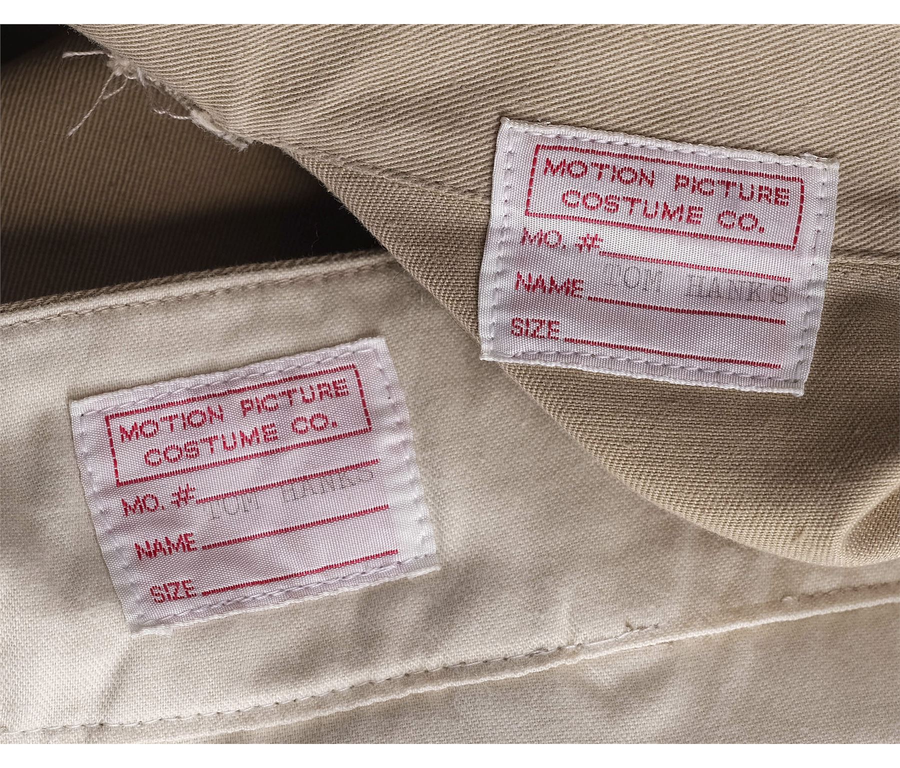 This lot consists of a a khaki polyester short-sleeve, button-up shirt decorated with rank insignias on its sleeves, pin-on epaulets, a light blue braid around the right shoulder, decorative bars and pins on left breast pocket, and rifleman pins marked "RK"; and a pair of khaki polyester pants marked "L" with a black nylon and metal buckle belt. This costume features Motion Picture Costume Co. labels, each marked "TOM HANKS." This lot exhibits minor fraying threads and tarnishing on the buckle.