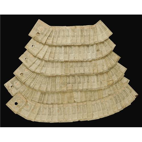 <B>128 Massachusetts 1780 Issues Hole Cancelled</B></I> This group contains various denominations of hole cancelled notes all from May 5, 1780. They are as follows: MA-279 $2 (20), MA-280 (17), MA-281 (15), MA-282 (8), MA-282 (49), MA-284 (17), MA-285 (2). All the notes grade a minimum of <B>Fine</B></I> with numerous examples grading higher. There will be no returns on this lot for any reason.
