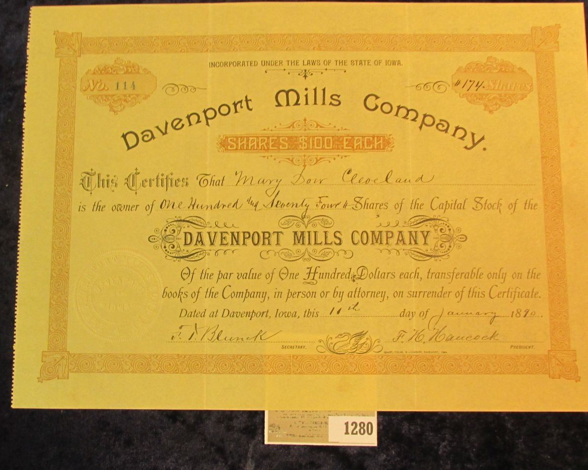 1280 _ No. 114 "Davenport Mills Company" dated 10th of January 1890, excellent condition and ready f