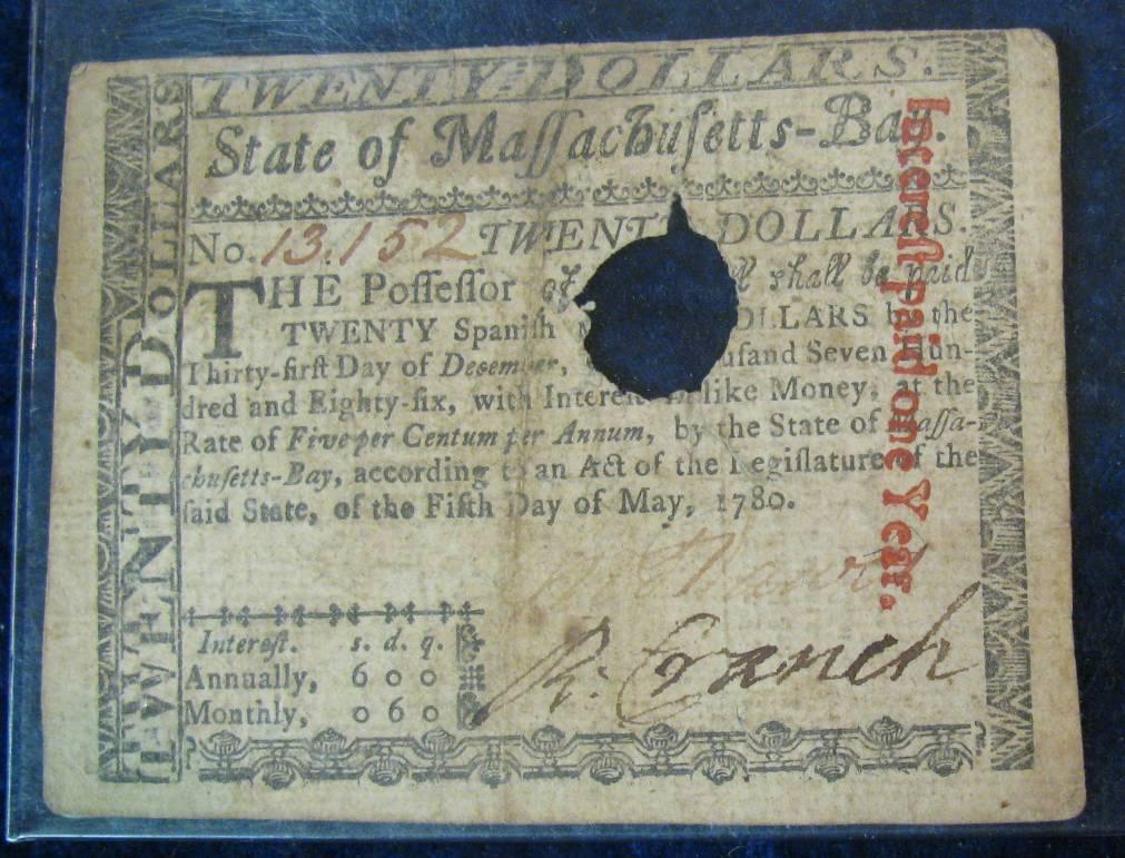1281. 1780 State of Massachusetts 20-Dollars. Colonial Currency, Hole Cancilled.
