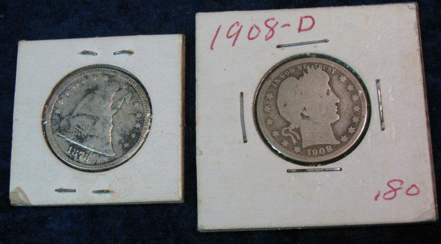 1285. 1878 P & 1908 D Silver U.S. Quarters. Fair to AG.