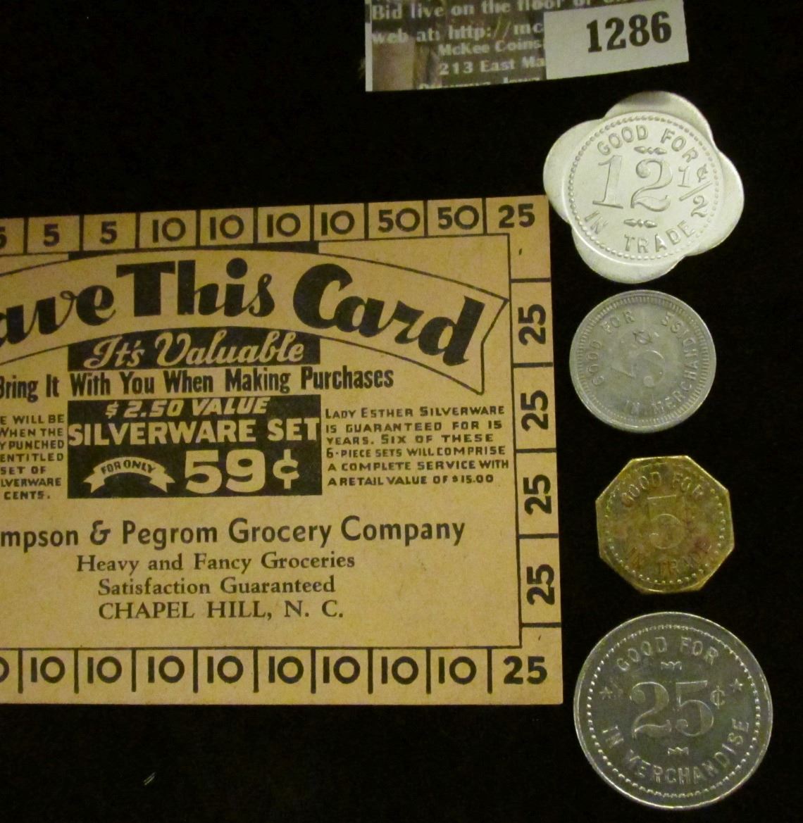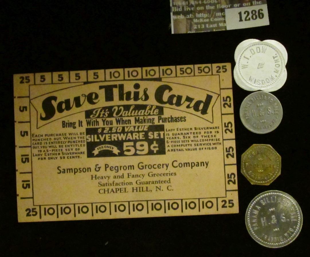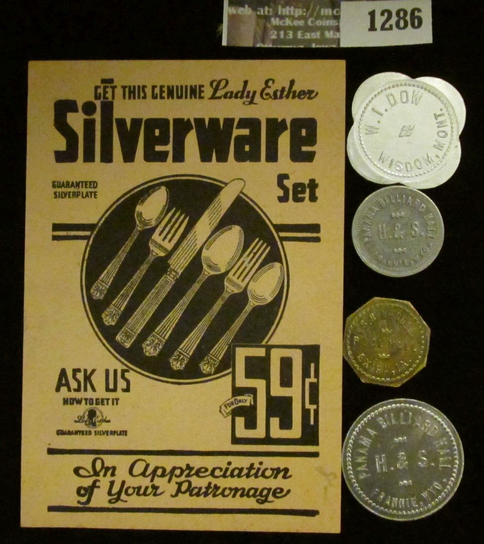 Original "Get This Genuine Lady Esther Silverware Set For Only 59c" Punch card; & (4) Different Good For Tokens from Wisdom, Mont., Exira, Ia., & Frannie, Wy.