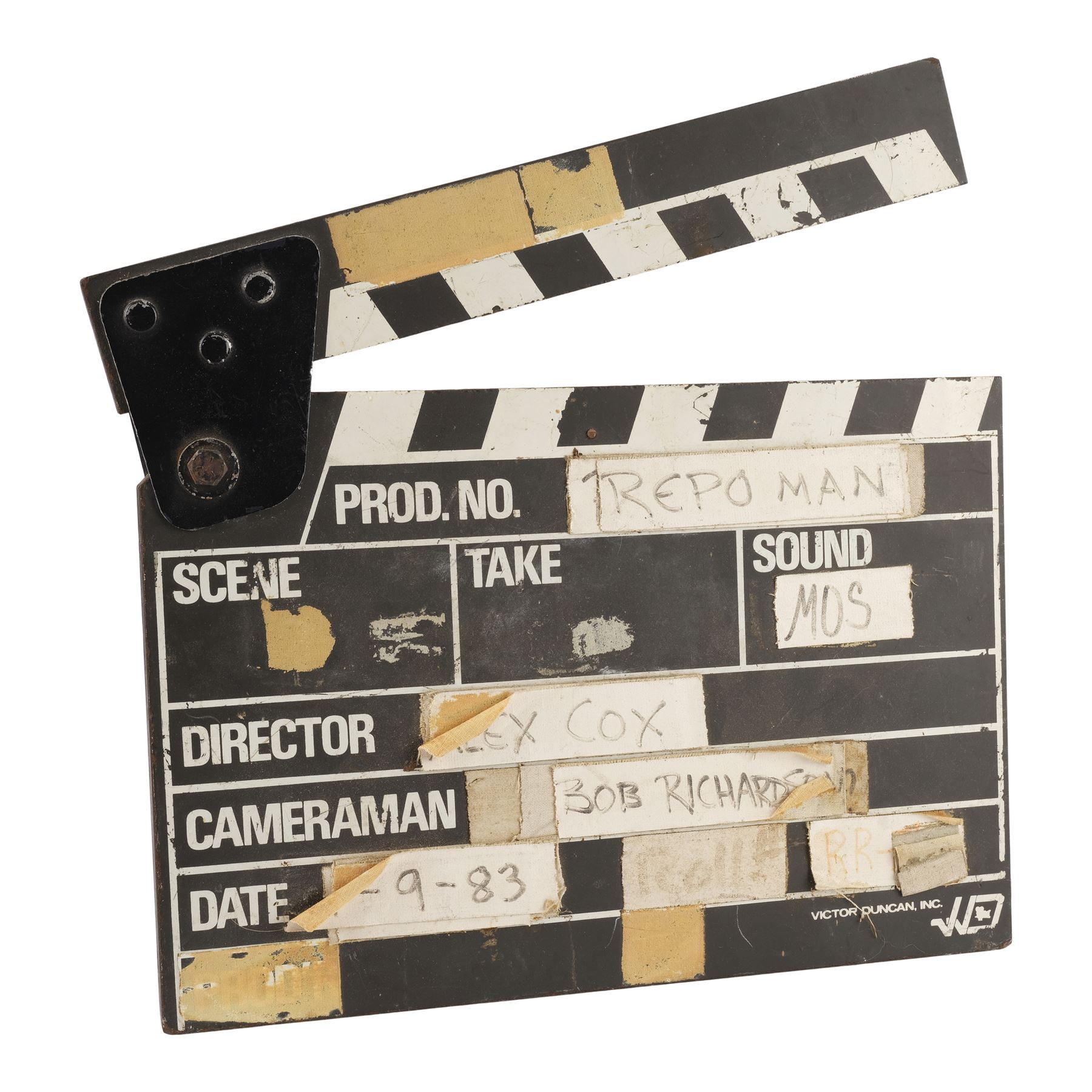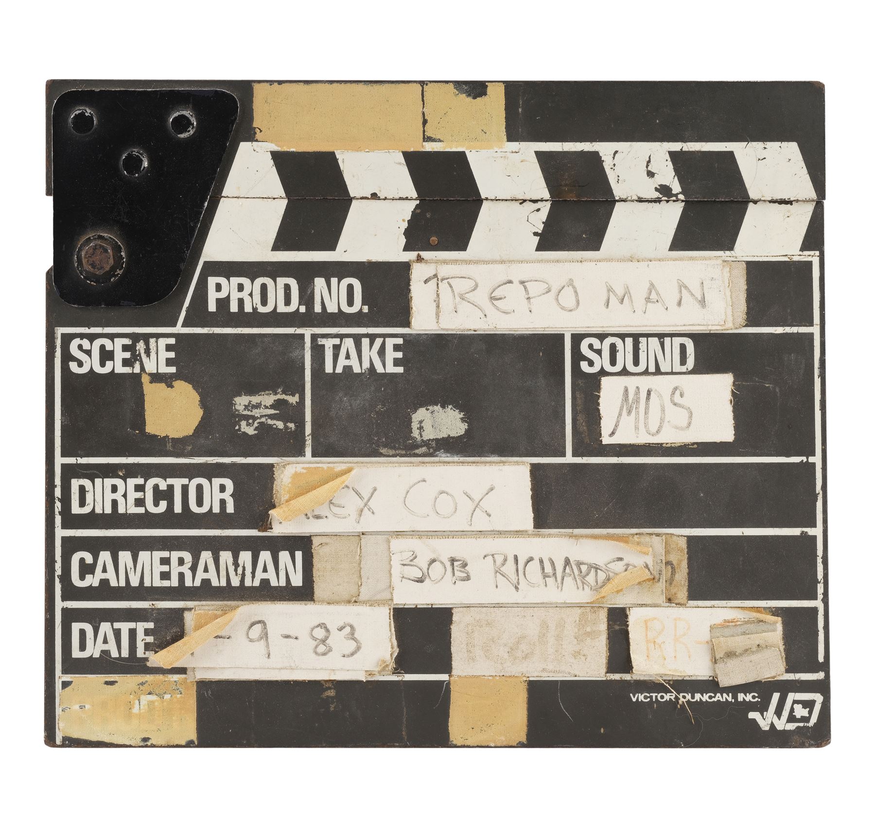 REPO MAN (1984) - Clapperboard - A clapperboard from the production of Alex Cox's Repo Man. Though Robby Muller was the cult classic's credited director of photography, three-time Academy Award& reg;-winning cinematographer Robert Richardson stepped in as a camera operator for additional photography during production.