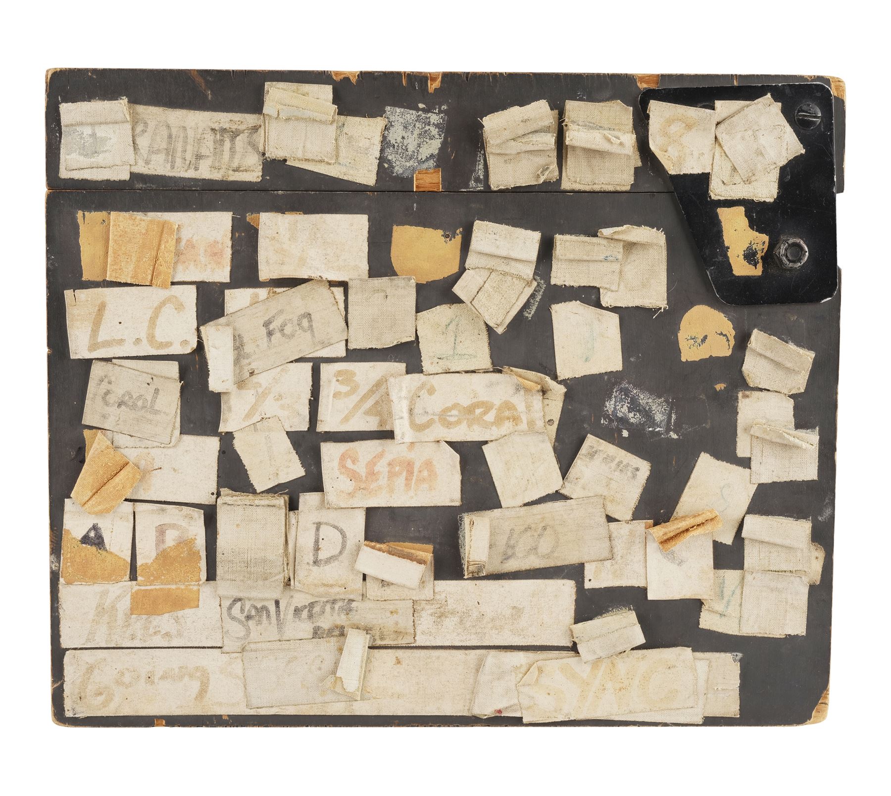 This wood Victor Duncan Inc. clapperboard labeled for director Cox, cameraman "Bob Richardson," and production number "Repo Man" is dated "9-83" with its roll number covered up. It is extensively applied on front and back with strips of tape swapped out or covered over between slates. The tape on the reverse features labels such as "Sepia," "San Vicente," and "Sync," indicating that this clapperboard was utilized extensively during production. The clapperboard exhibits peeling tape, paint flaking on the wood, stickiness, and rust on its metal hinge from age. Dimensions: 12" x 10" x 1.5" (30.5 cm x 25.5 cm x 4 cm)