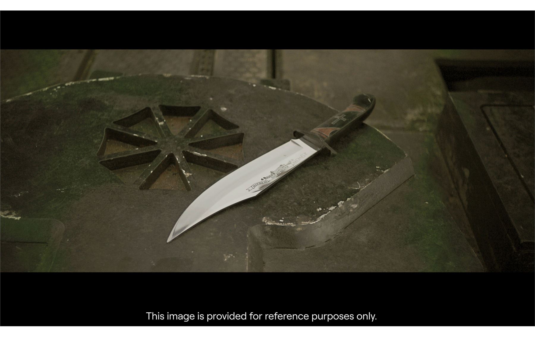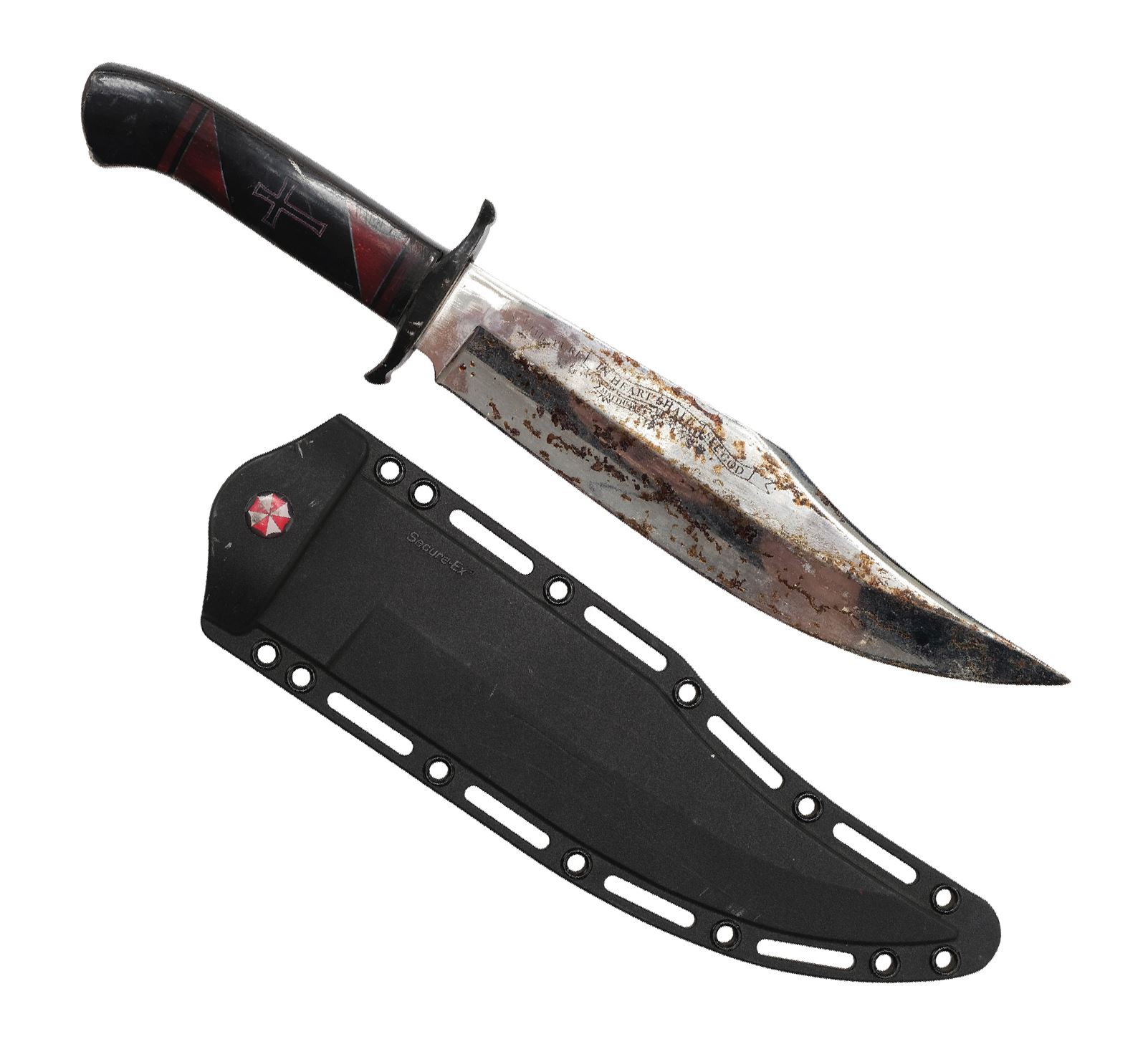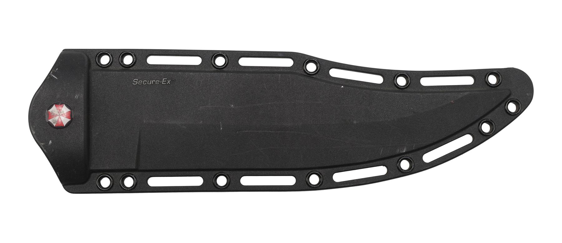 This lot consists of a metal Bowie knife and a black plastic Secure-Ex sheath, both with the Umbrella Corporation's logo engraved on them. The knife handle is painted with a cross and "For the Wages of Sin is Death" is engraved on the blade. Production intentionally distressed this dagger. This lot exhibits a weakened seam on the sheath. Dimensions: 15.25" x 3.25" x 1.25" (38.75 cm x 8.25 cm x 3 cm)