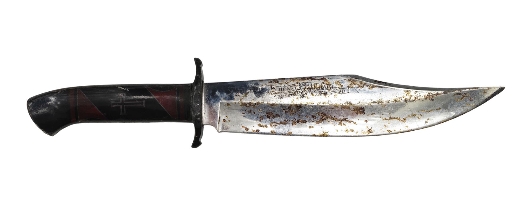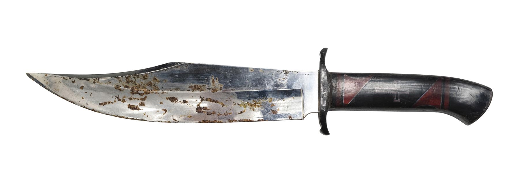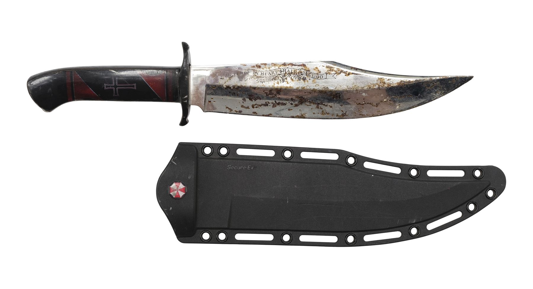 This lot consists of a metal Bowie knife and a black plastic Secure-Ex sheath, both with the Umbrella Corporation's logo engraved on them. The knife handle is painted with a cross and "For the Wages of Sin is Death" is engraved on the blade. Production intentionally distressed this dagger. This lot exhibits a weakened seam on the sheath. Dimensions: 15.25" x 3.25" x 1.25" (38.75 cm x 8.25 cm x 3 cm)