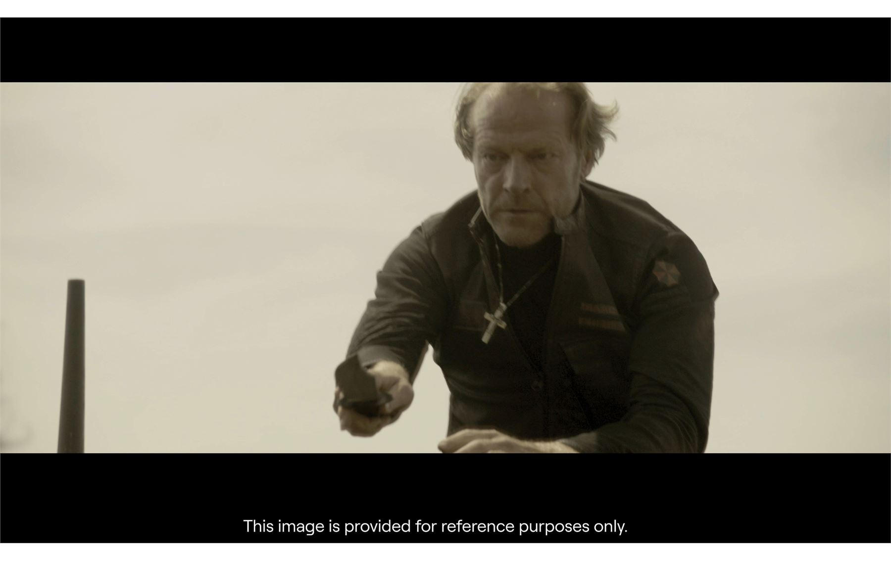 RESIDENT EVIL: THE FINAL CHAPTER (2016) - Clone Alexander Isaacs' (Iain Glen) Distressed Bowie Knife and Umbrella Company Sheath - Clone Alexander Isaacs' (Iain Glen) distressed Bowie knife from Paul W.S. Anderson's Resident Evil: The Final Chapter. Dr. Isaacs' clone wielded his knife against Alice (Milla Jovovich) when his convoy captured her.
