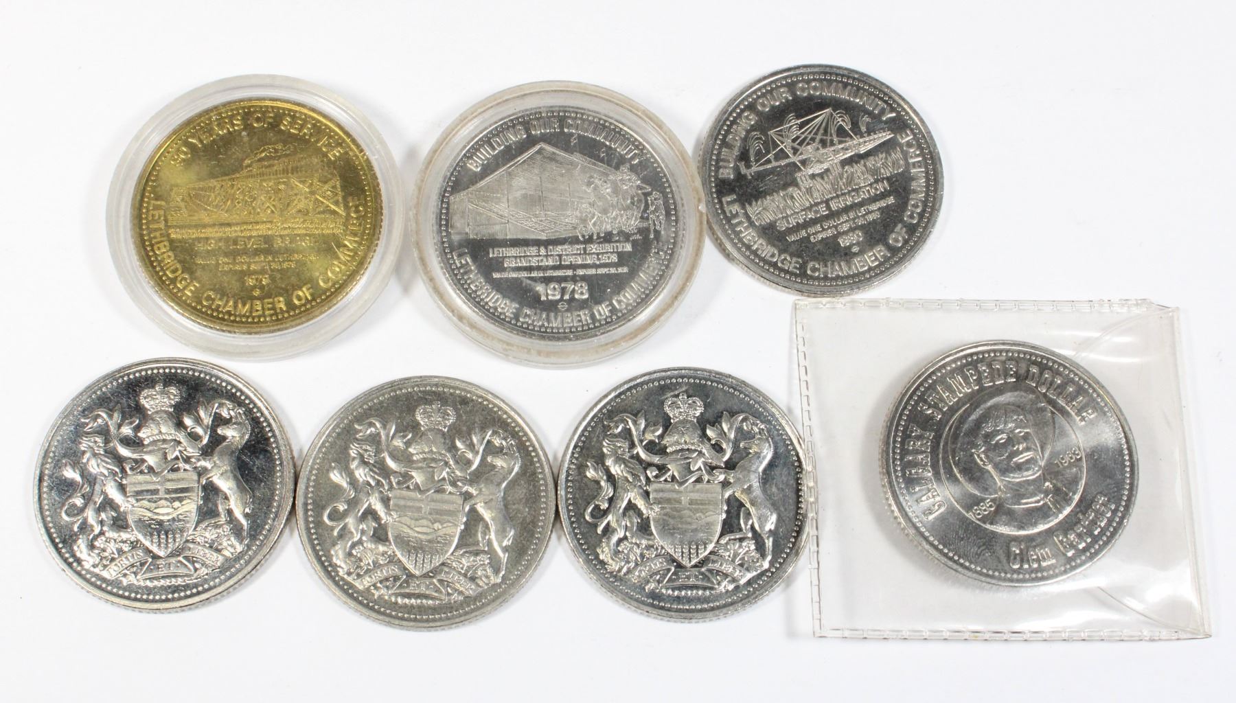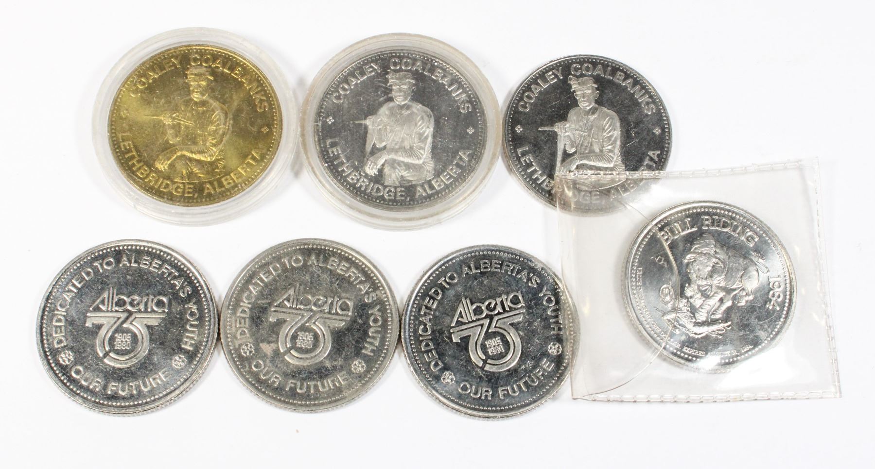 INCLUDES COALEY COALBANKS LETHBRIDGE ALBERTA 1978 1980 TOKEN VARIATIONS, CALGARY STAMPEDE DOLLAR 1984 AND ALBERTA 1980 75 ANNIVERSARY COIN TOKENS 1900'S CANADA CANADIAN