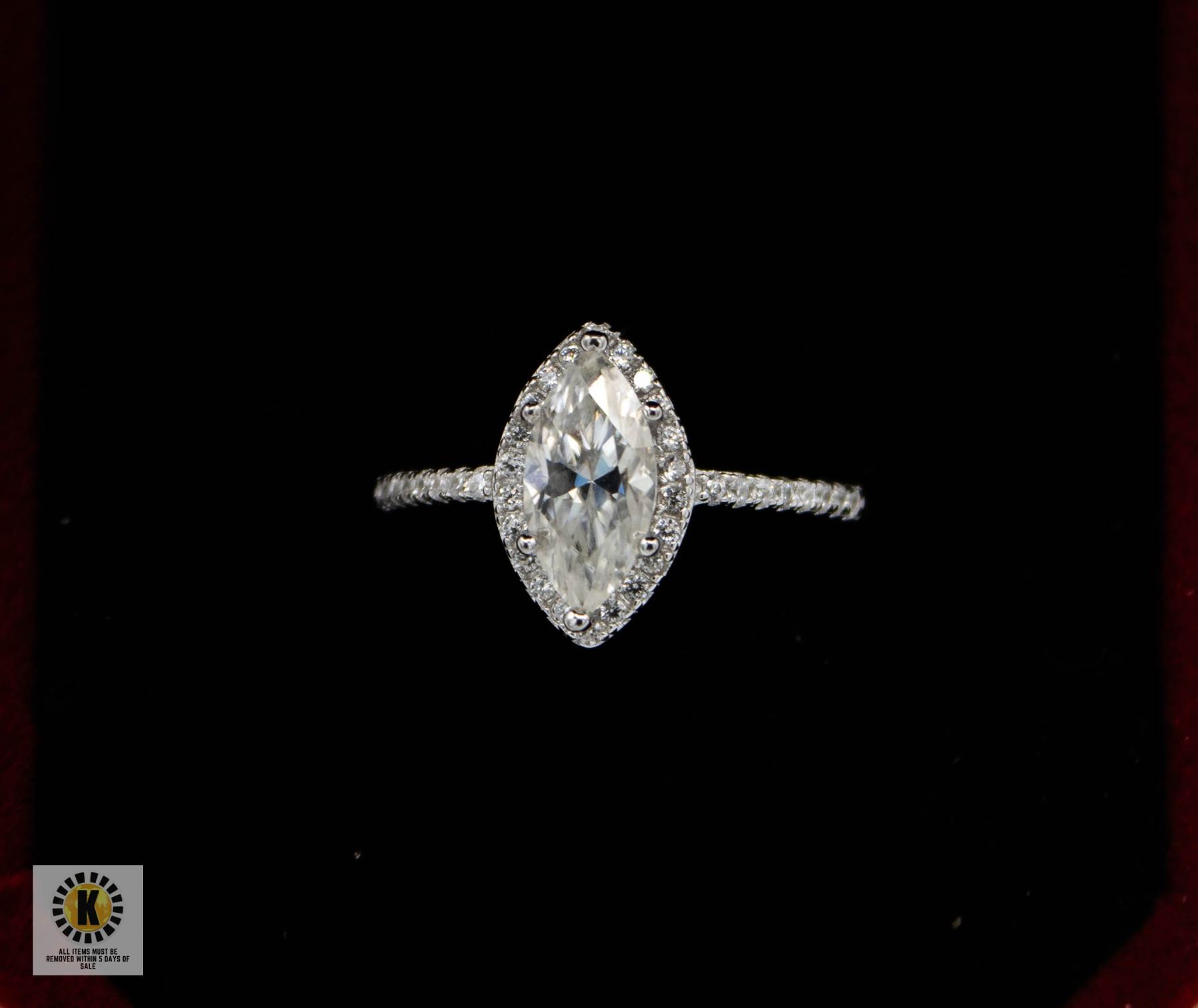 MOISSANITE STONE VVS D COLOR SET WITH 40 ROUND BRILLIANT CUT CUBIC ZIRCONIAS SET IN MARQUISE SHAPED HALO WITH SOME SET IN SHANKS SET IN 925 SILVER RING SIZE 6.5 RETAIL VALUE $825.00