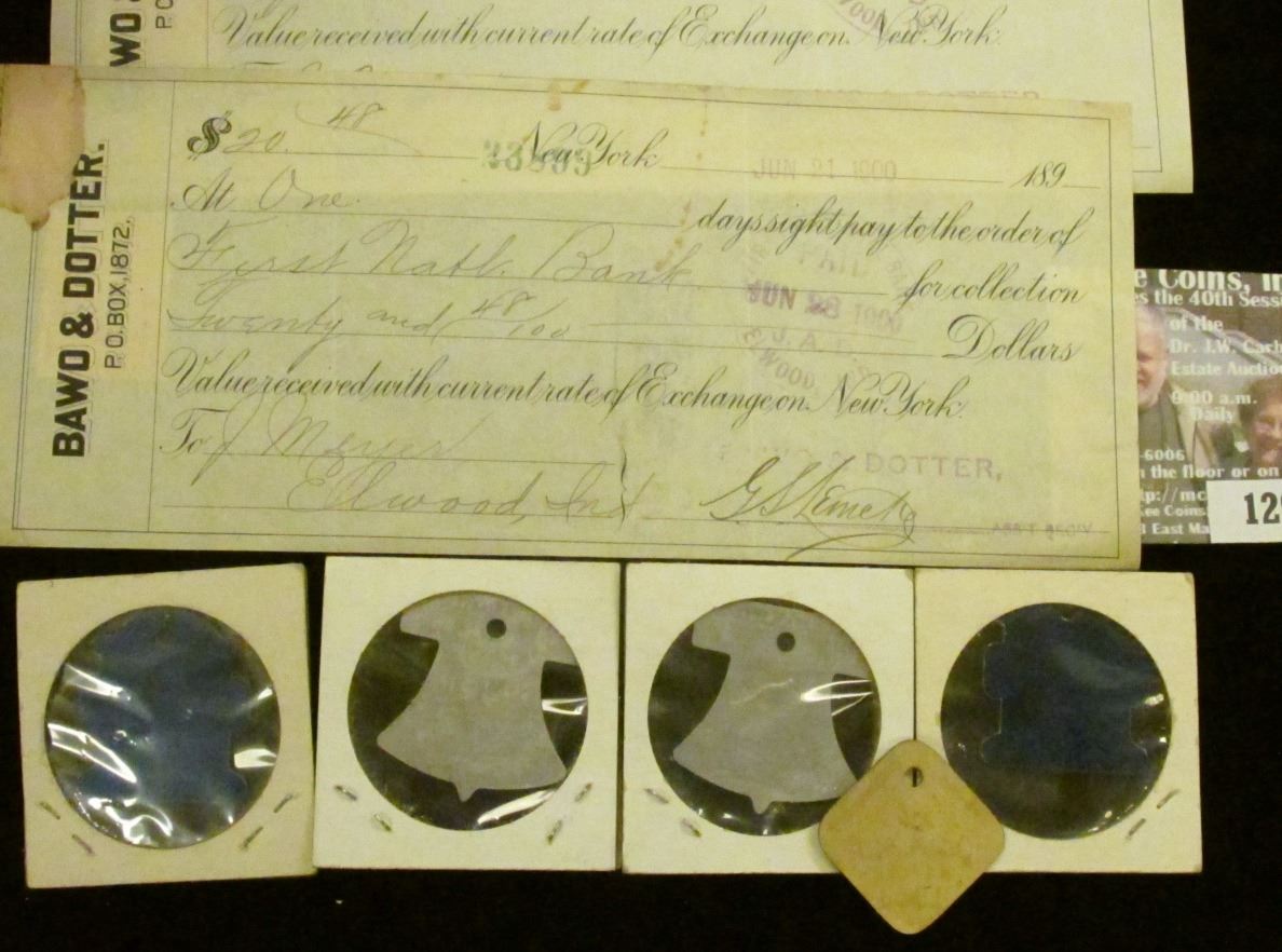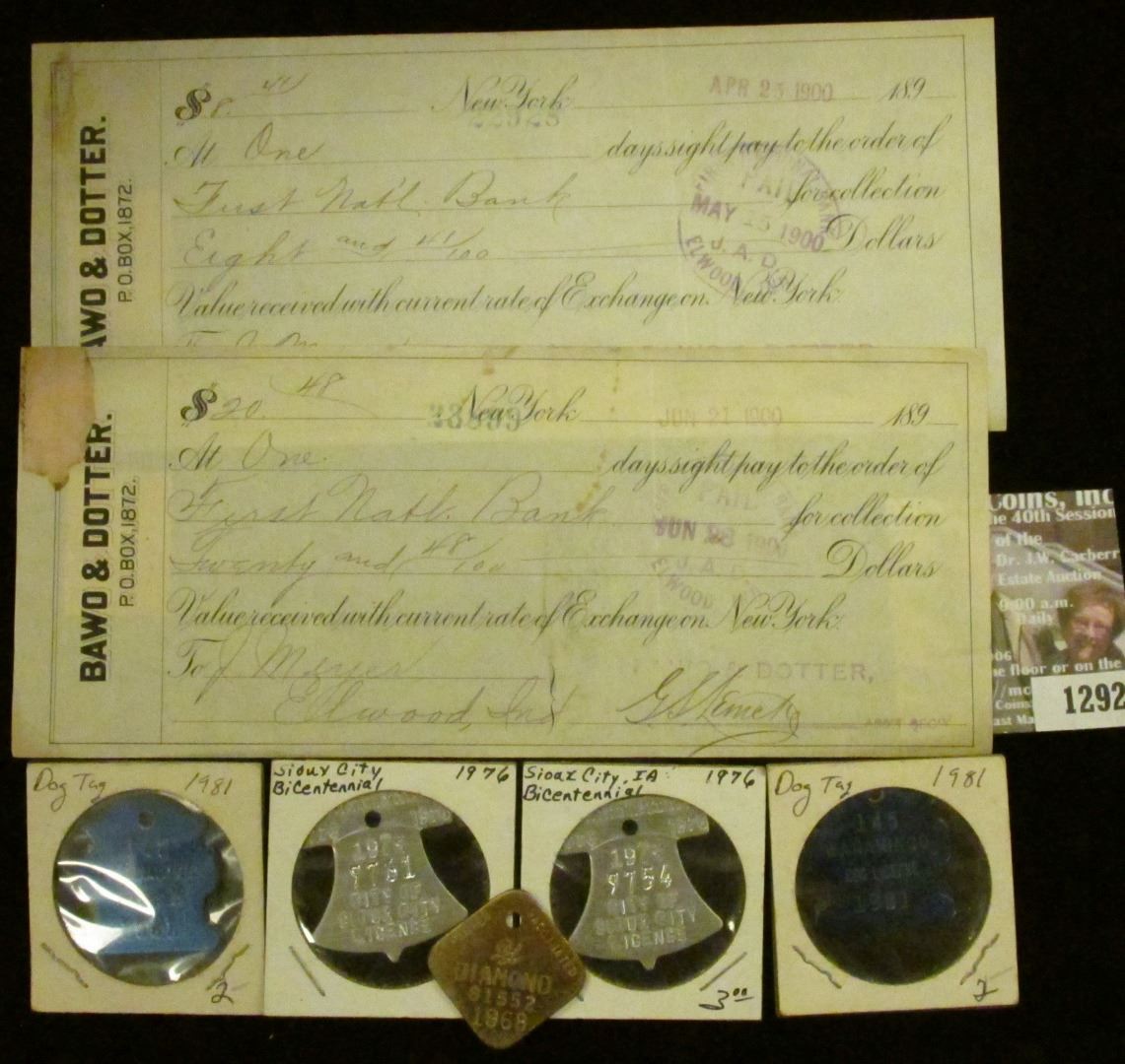 Pair of 1900 era Sight Drafts "Bawd & Dotter…New York", both with Documentary Stamps; & (5) Old Metal Dog Tags.