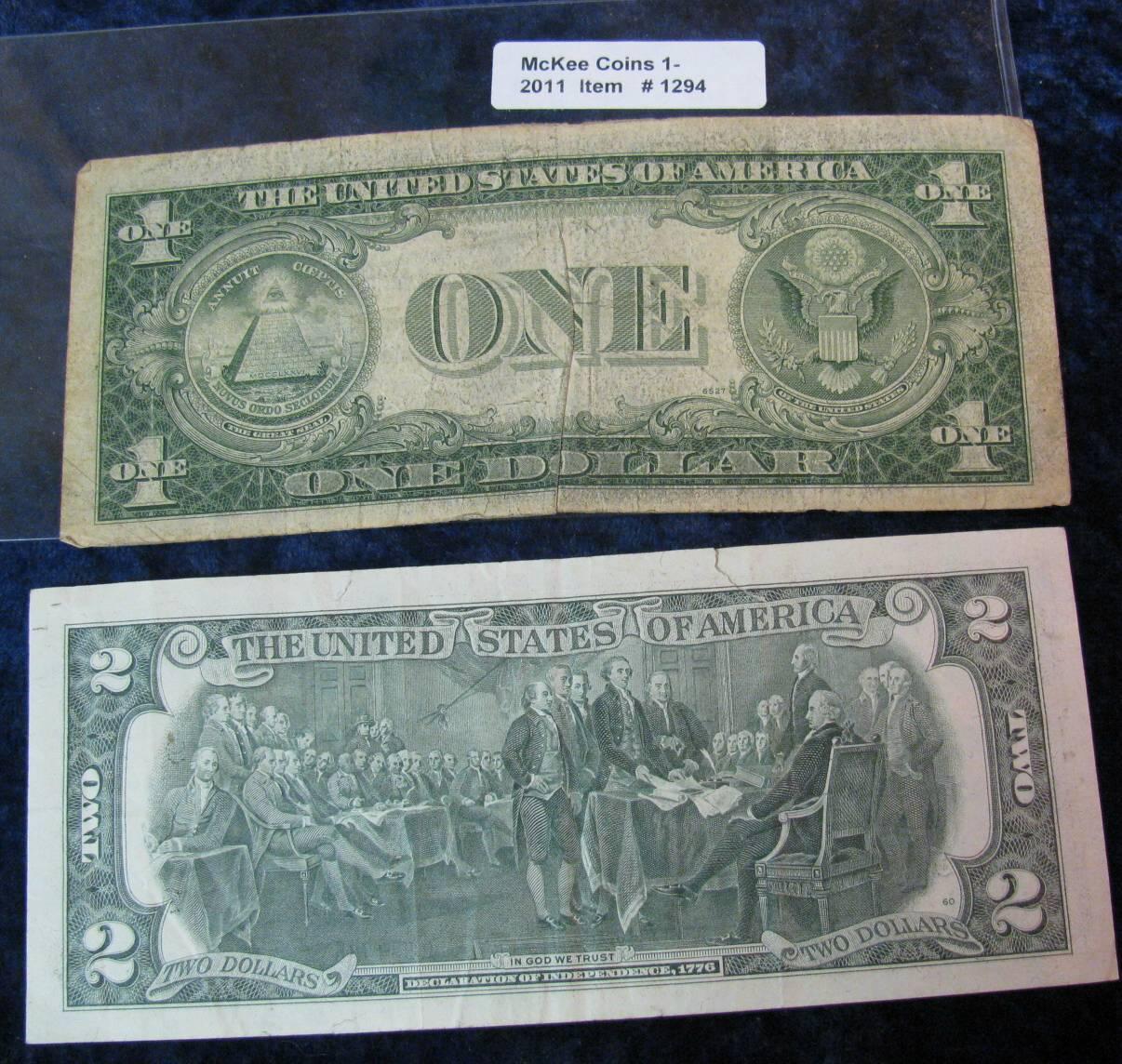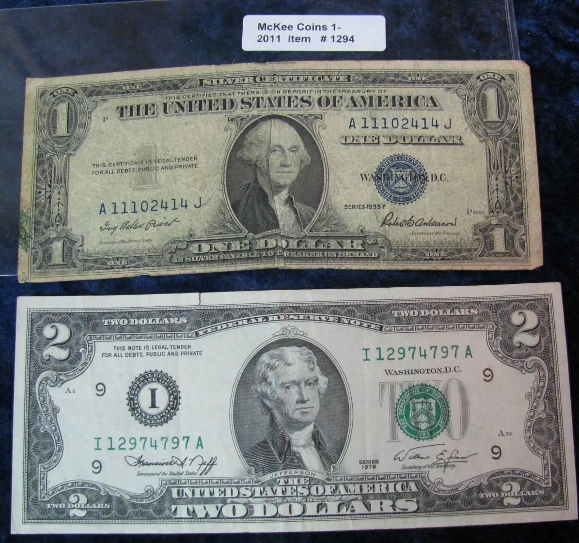 1294. Series 1935F 1-Dollar & 1976 $2. Federal Reserve Note. F, AU.