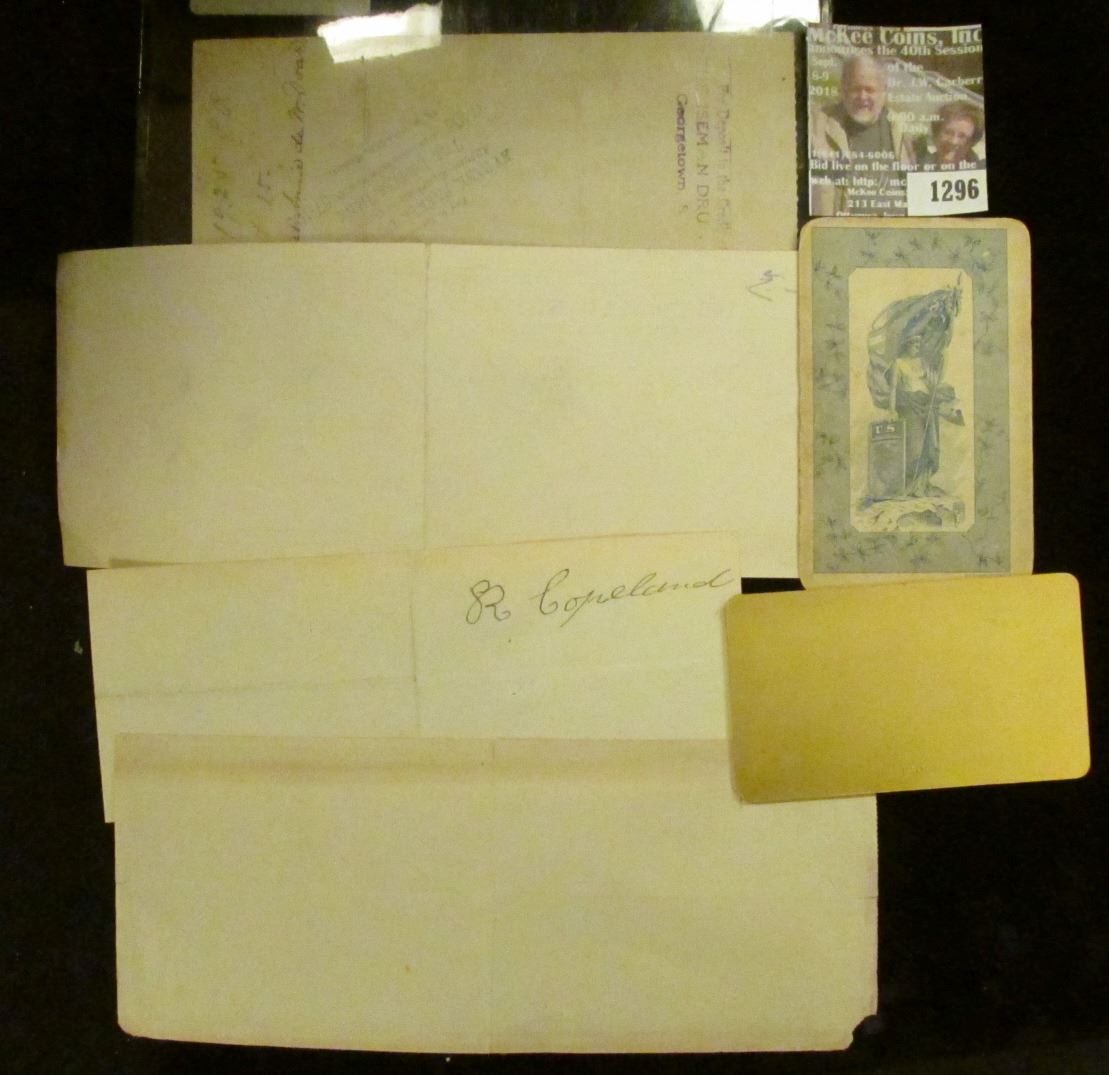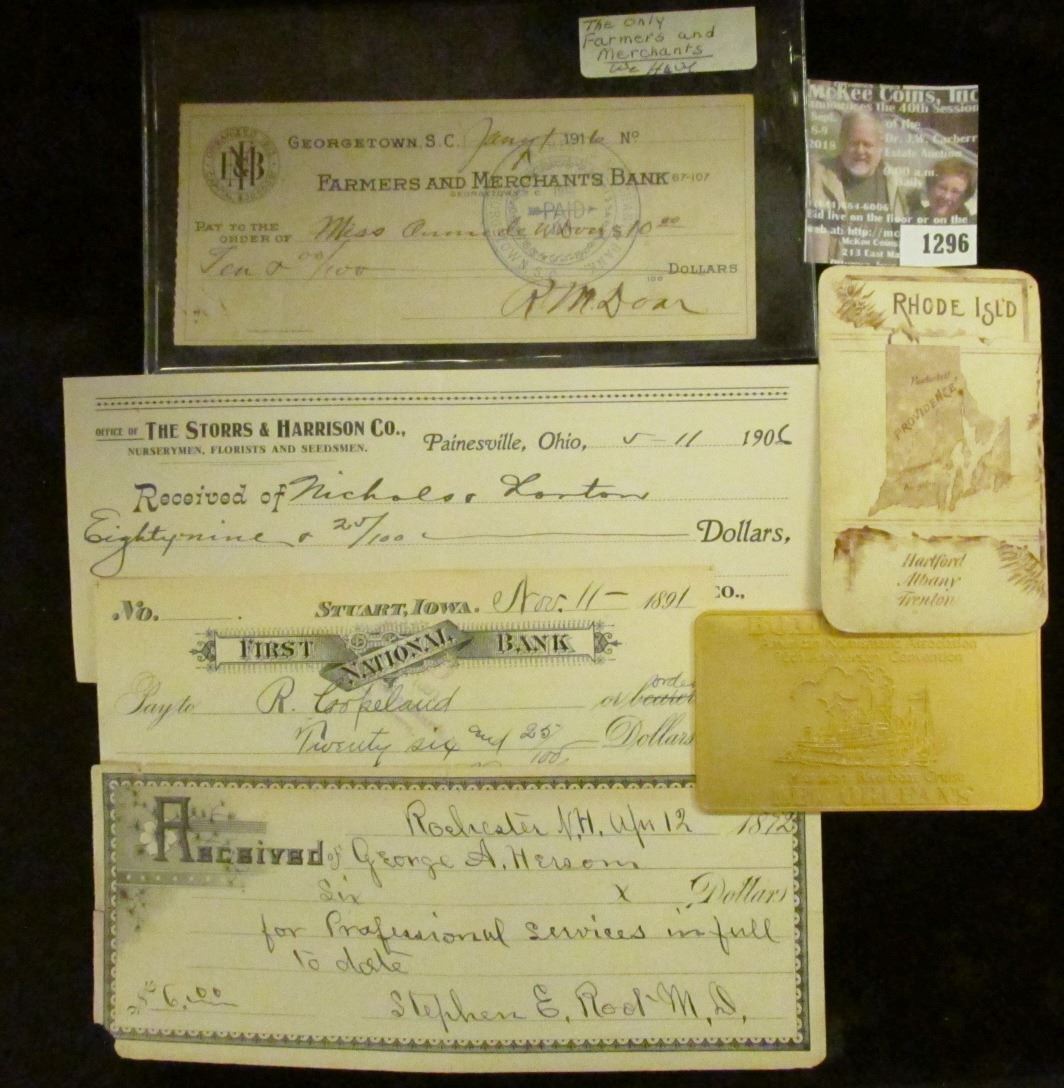 1892 Receipt "Rochester, N.H." issued and signed by "Stephen E. Rool, M.D."; 1916 Check "Farmers and Merchants Bank Georgetown, S.C."; Rhode Island Map Card; 1891 Check Stuart, Iowa "First National Bank"; 1906 Check "The Storrs & Harrison Co., Painesville, Ohio"; & 90th Anniversary Convention Gold Boarding Pass for the American Numismatic Association on the Mississippi Riverboat Cruise New Orleans.