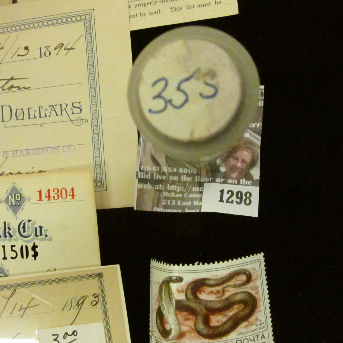 Receipt "Agent for the Troy Steam Laundry Dayton, Ohio Works"; 1894 Receipt from Plainsville, Ohio; 1893 Receipt with pair of Dogs vignette from Perry, Ohio "The L. Green & Son Co.; 1898 Check with Pink Documentary Stamp from Paulding, Ohio "The Paulding Deposit Bank Co."; couple of other pieces of early Ohio memorabilia; couple of old stamps; & a solid date roll of 1935 S Lincoln Cents in a plastic tube.
