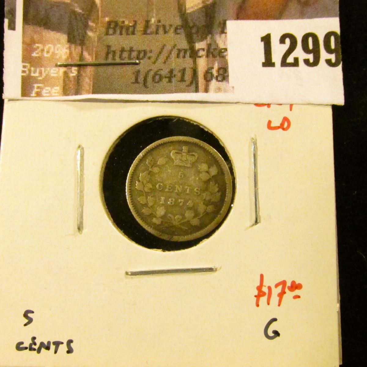 1299 . 1874 crosslet 4 large date Canada Five Cent Silver, G, value