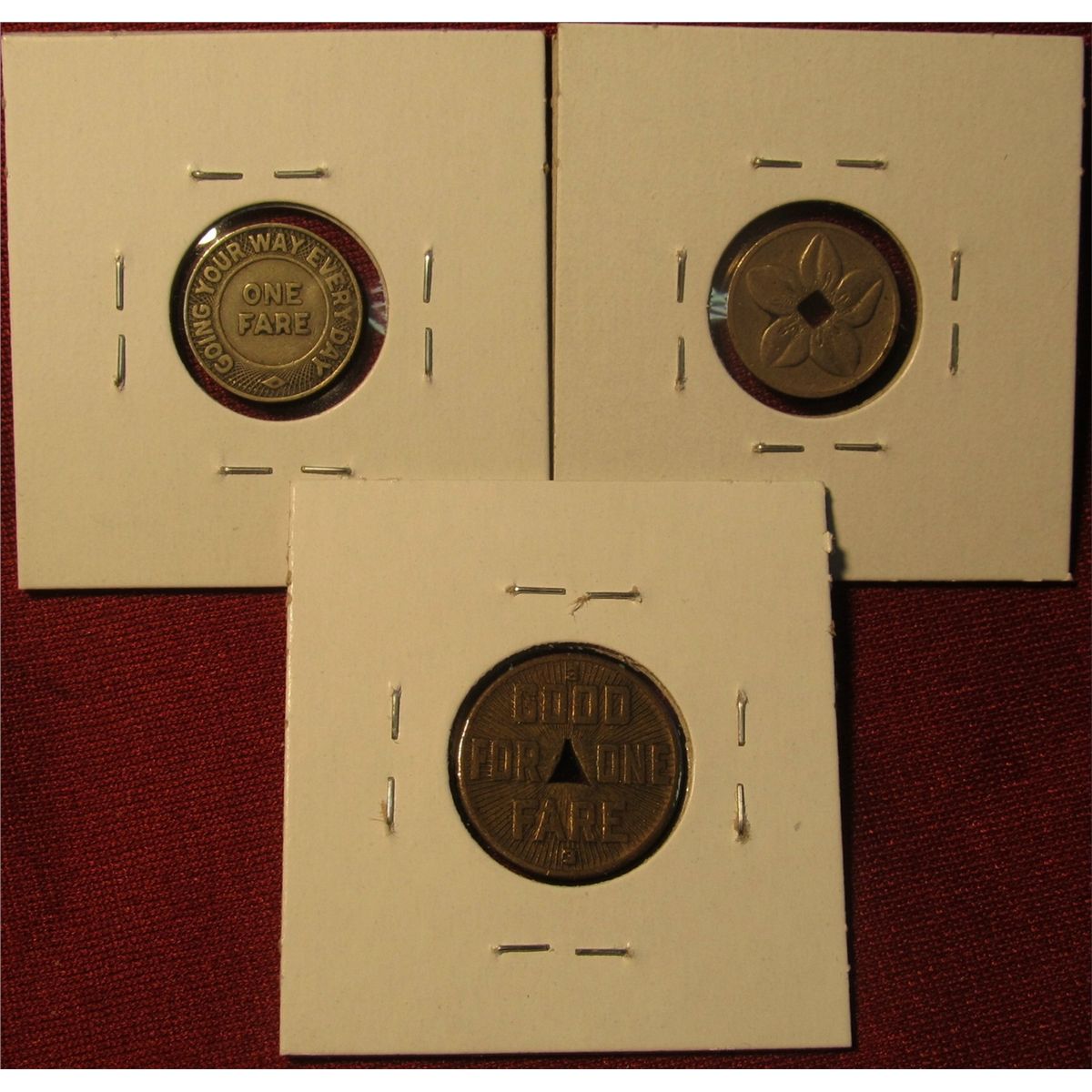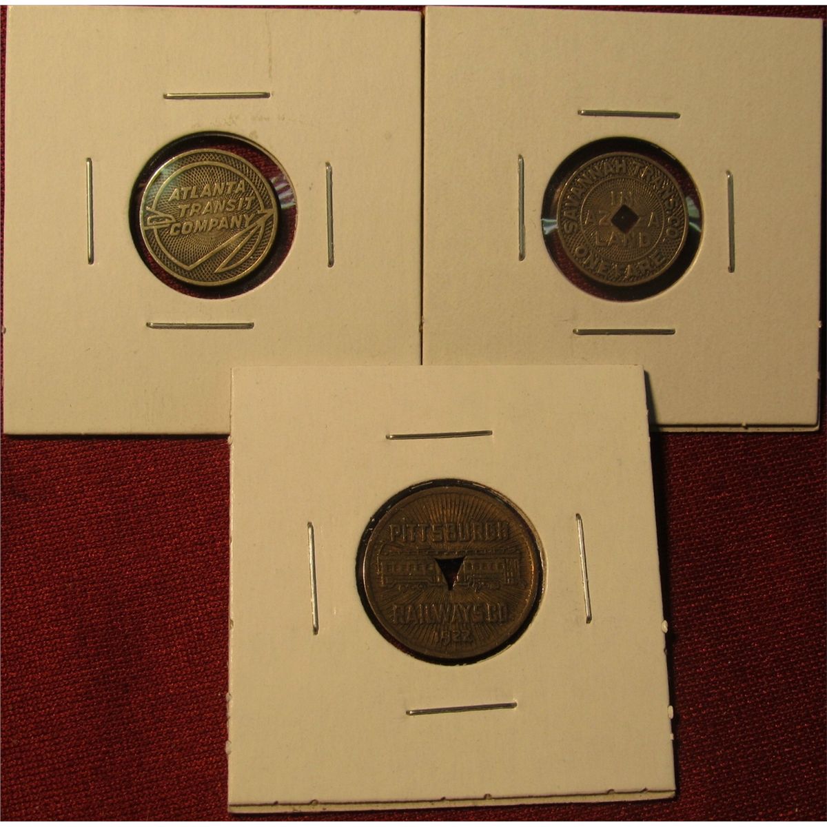 1299. 3 Transit tokens – Atlanta Transit Company, Savannah Trans. Co (features an azalea bloom), & PittsBU rgh Railways Co. 1922