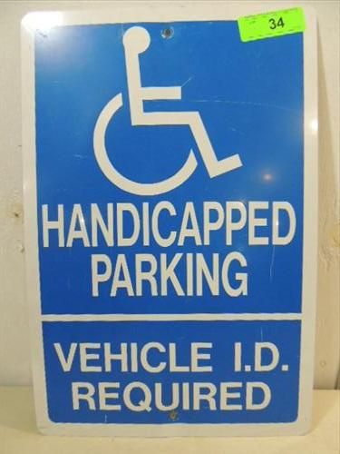 12X18 BLUE & WHITE METAL HANDICAPPED PARKING SIGN. AS SHOWN. VIEW PICTURE FOR DETAIL.