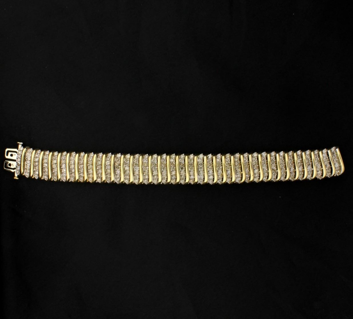 In 10K yellow gold it is 7 inches long and contains 12cts of champagne diamonds-great cut & color! 45.7g