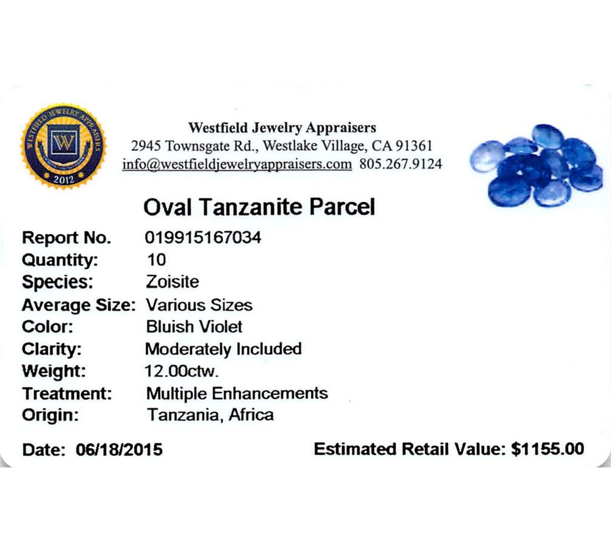 Ten oval mixed cut natural tanzanites exact total weight 12.00ct., clarity is moderately included, type I, medium dark, very slightly grayish, bluish violet color, (GIA bV 6/3), cut is good. Transmitting light with a minimum of distortion, transparent. Naturally occurring internal & external characteristics are present. Color grade is an average for the group. Tanzanite is a very rare gemstone that is only found in the country of Tanzania. Originally discovered in 1967. Tiffany & Company, named the stone Tanzanite. It is found in the Usumburu Mountains that border the Umba Valley of northern Tanzania. Tanzanite occurs in gray, brown, violet, blue, reddish-purple, & green. The gem is interesting because of its exceptional pleochroism. Rotated in different directions a tanzanite will exhibit multiple changes of color. Tanzanite has a low tolerance to ultrasonic cleaning, and should not be cleaned using this method. Westfield Appraised at $1,155.00.