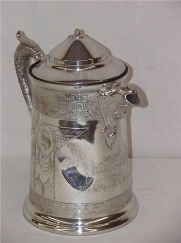 12" SILVER PLATED FIRE PRESENTATION WATER PITCHER BY WEBSTER SILVERPLATE CO. - PRESENTED "COMPLIMENTS OF LOGAN HOOK and LADDER CO. #1 AUBURN NY TO MR. and MRS. W.L. SELOURR - DENTS and FINIAL MISSING;