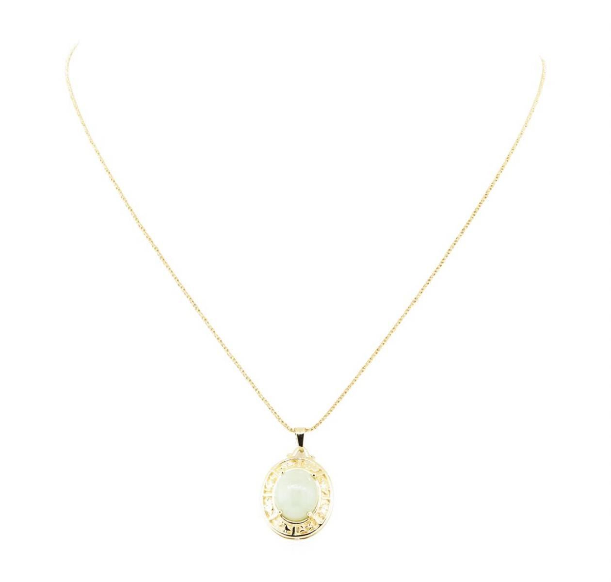 12mm x 10mm Cabochon Jade Pendant with Chain - 14KT + 18KT Yellow Gold