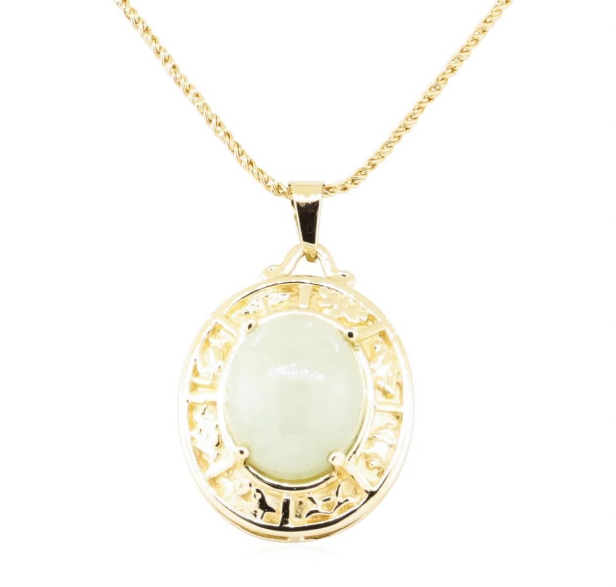 One oval pendant cast from 14KT yellow gold with an attached 18KT yellow gold sixteen inch long twisted chain featuring: 14KT and 18KT yellow gold weighing 6.7 grams containing one piece of jade measuring 12mm by 10mm.