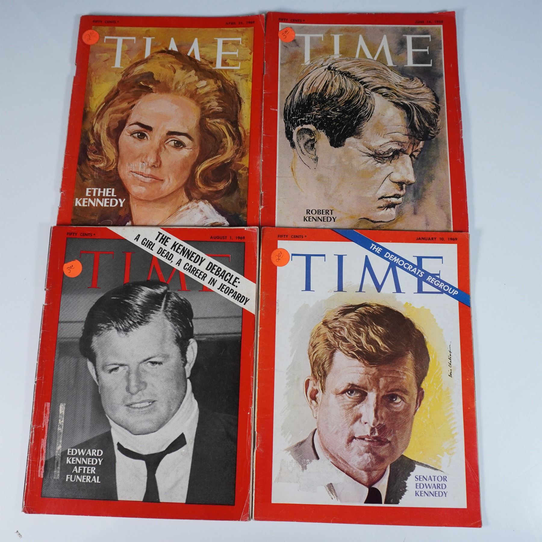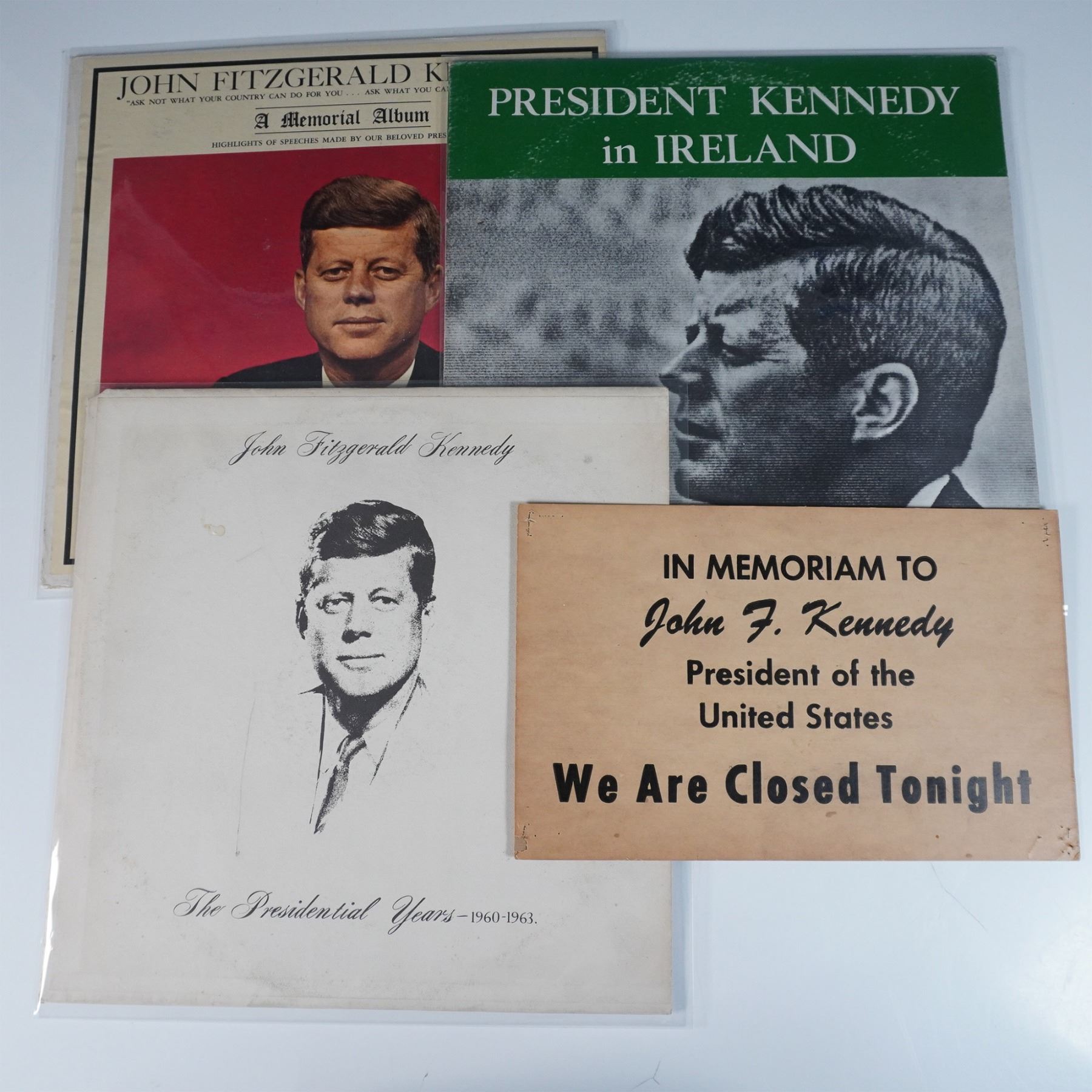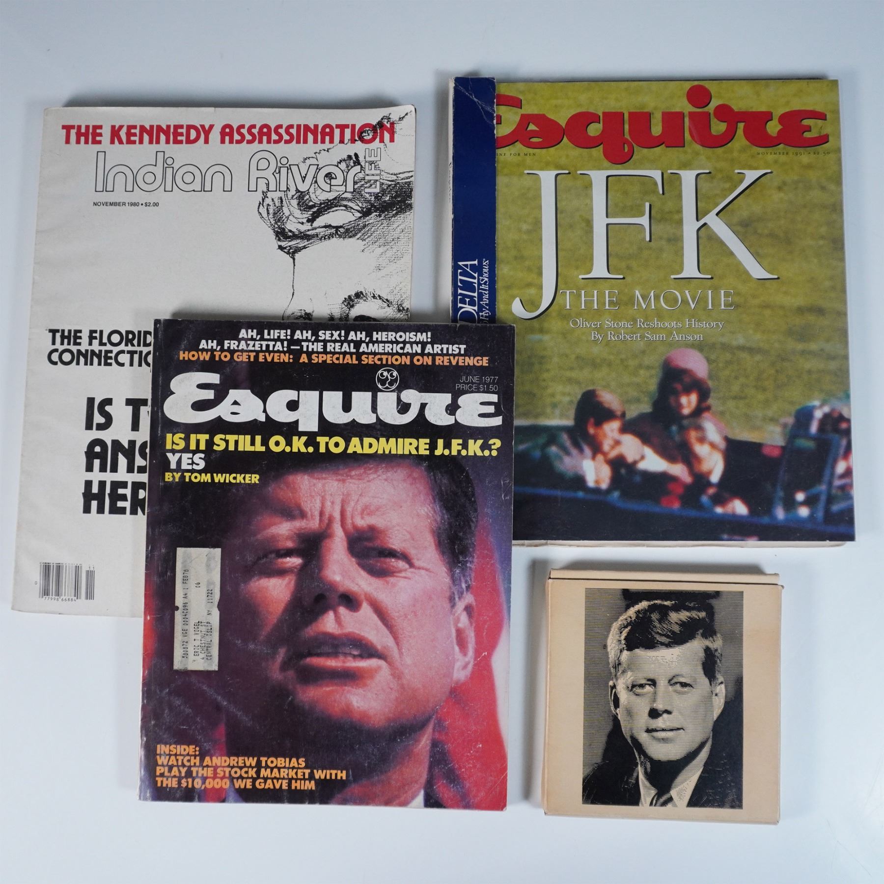 A collection of 12 vintage John F. Kennedy memorabilia items, including magazines, vinyl records, and historical publications. Features notable issues such as Esquire and TIME magazines covering JFK and the Kennedy family, along with records including John Fitzgerald Kennedy: A Memorial Album and President Kennedy in Ireland. Also includes an "In Memoriam" sign and a vintage 8MM film Man and President, distributed by Movie Newsreels. A unique historical lot commemorating one of America's most influential presidents. The dimensions of the collection measures: 13"H.