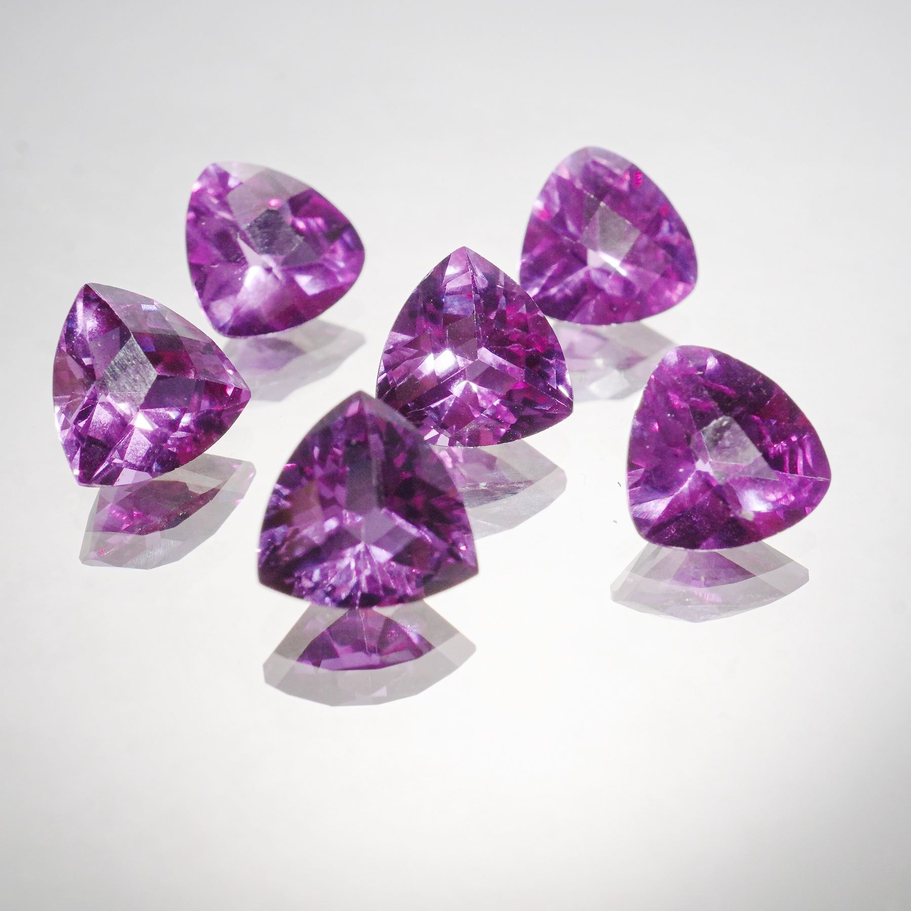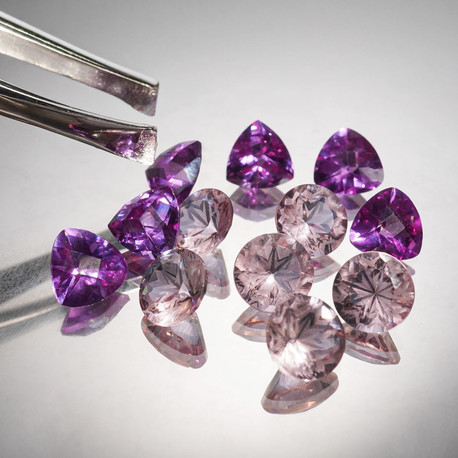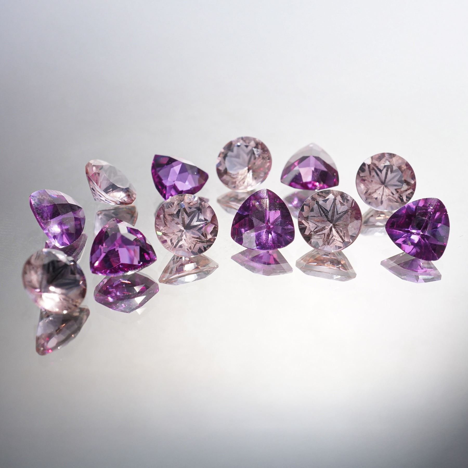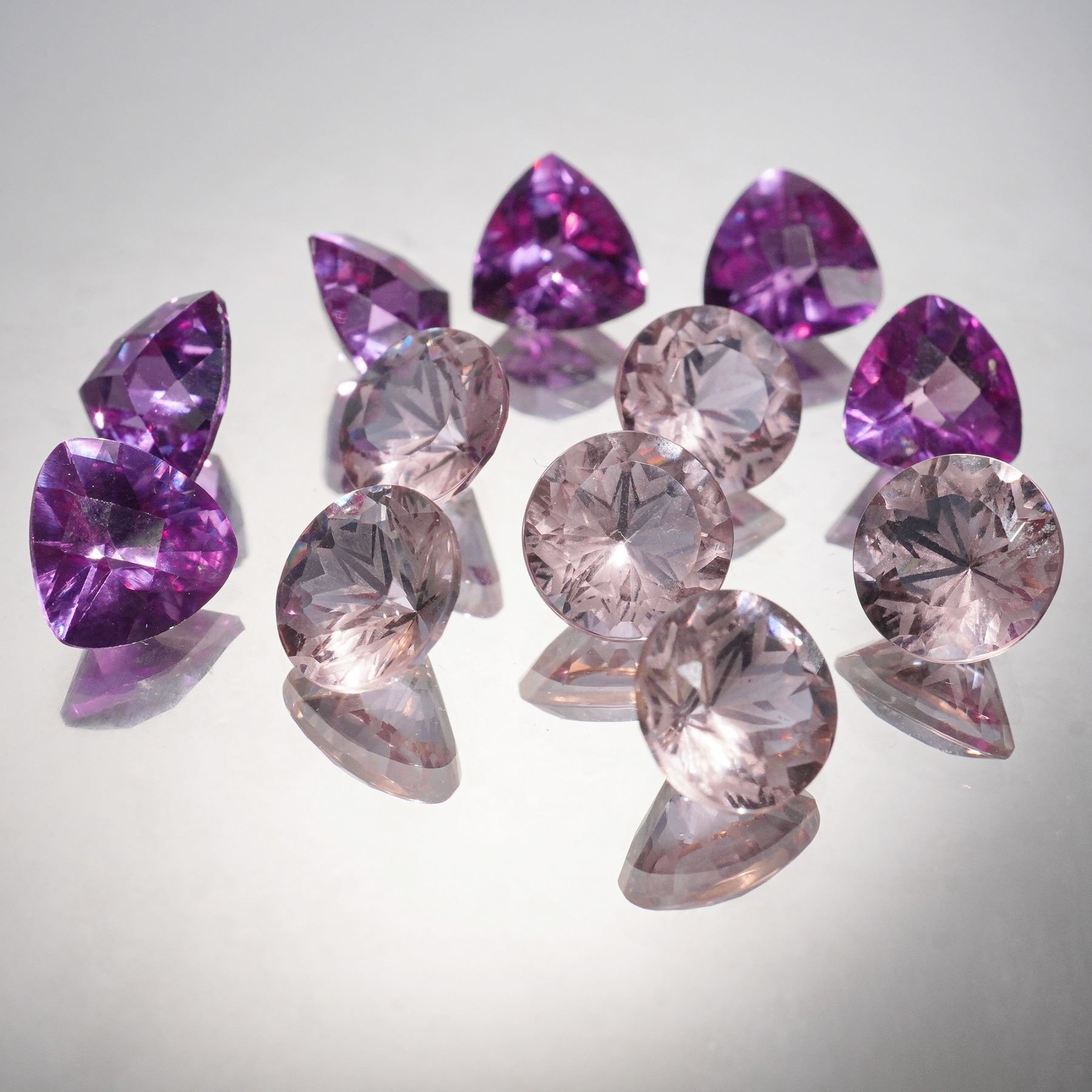 A group of twelve loose simulated gemstones, each measuring 8mm and housed in individual presentation cases labeled with identifying details. The lot includes six round-cut pale lavender stones marked as 1.40 carat simulants and six vivid purple trillion-cut stones marked as 2.25 carat lab-created Alexandrite simulants. All are finely faceted with excellent brilliance and clarity, ideal for setting in jewelry or for study.