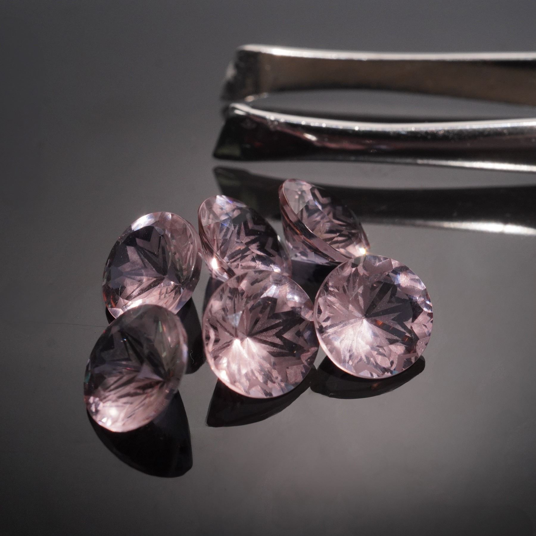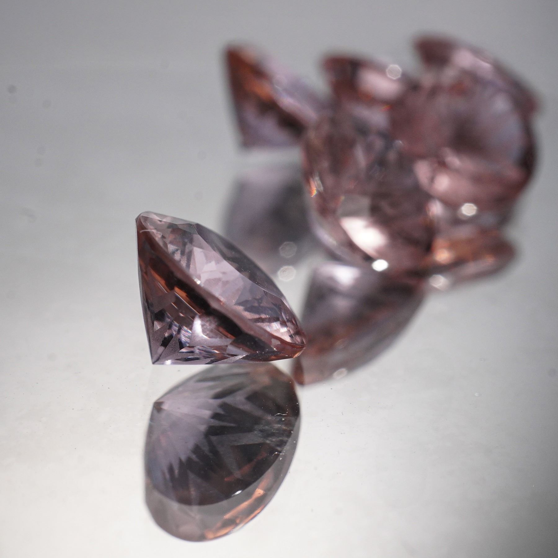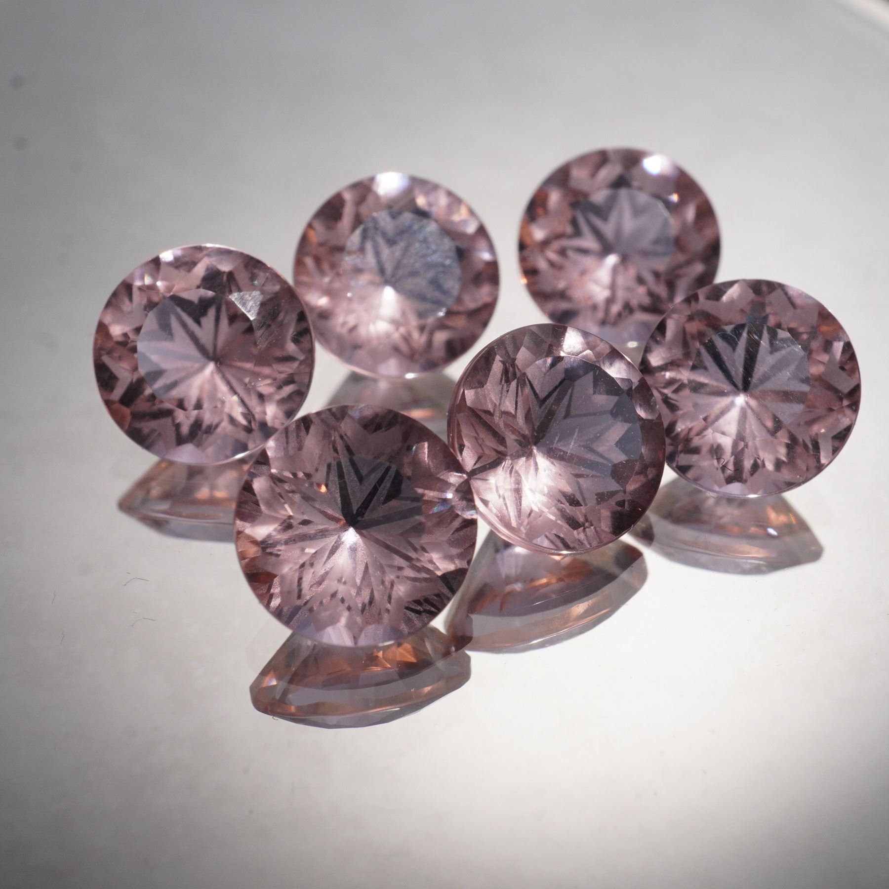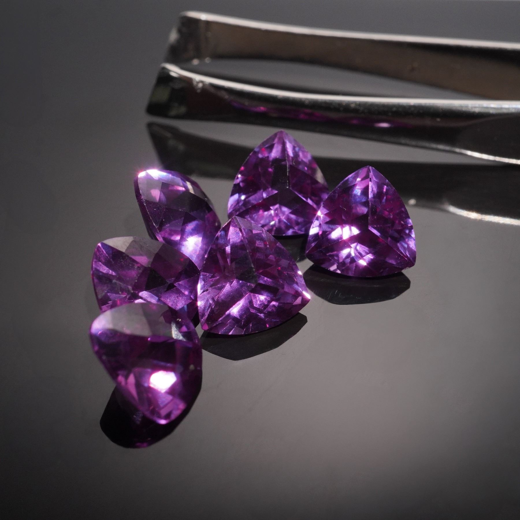 A group of twelve loose simulated gemstones, each measuring 8mm and housed in individual presentation cases labeled with identifying details. The lot includes six round-cut pale lavender stones marked as 1.40 carat simulants and six vivid purple trillion-cut stones marked as 2.25 carat lab-created Alexandrite simulants. All are finely faceted with excellent brilliance and clarity, ideal for setting in jewelry or for study.