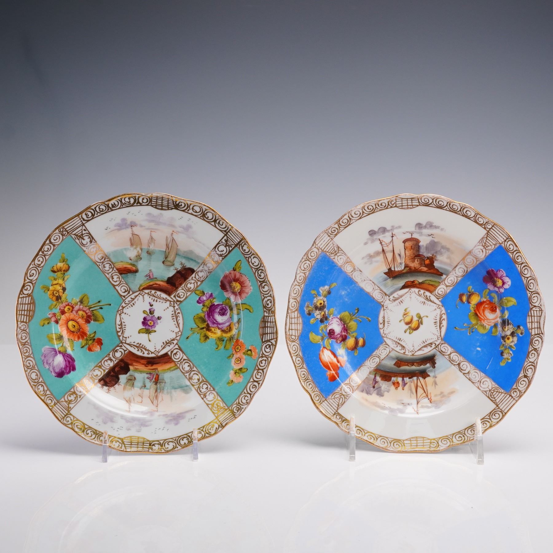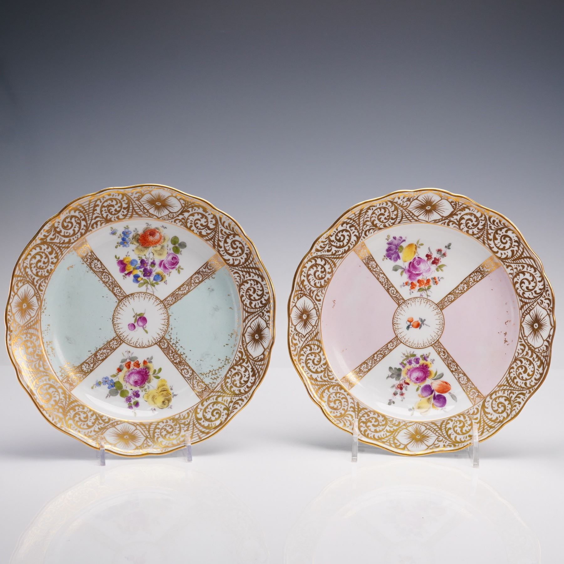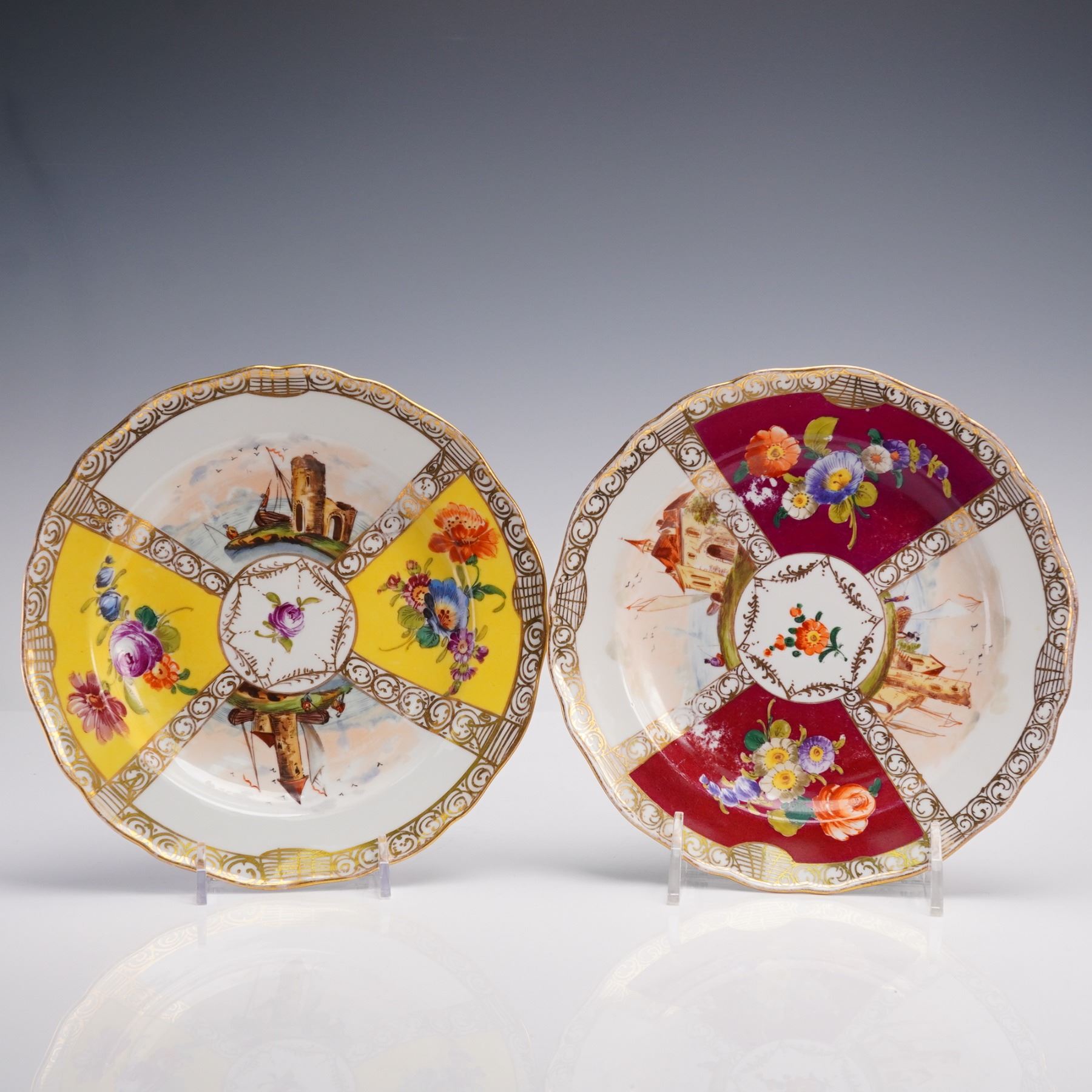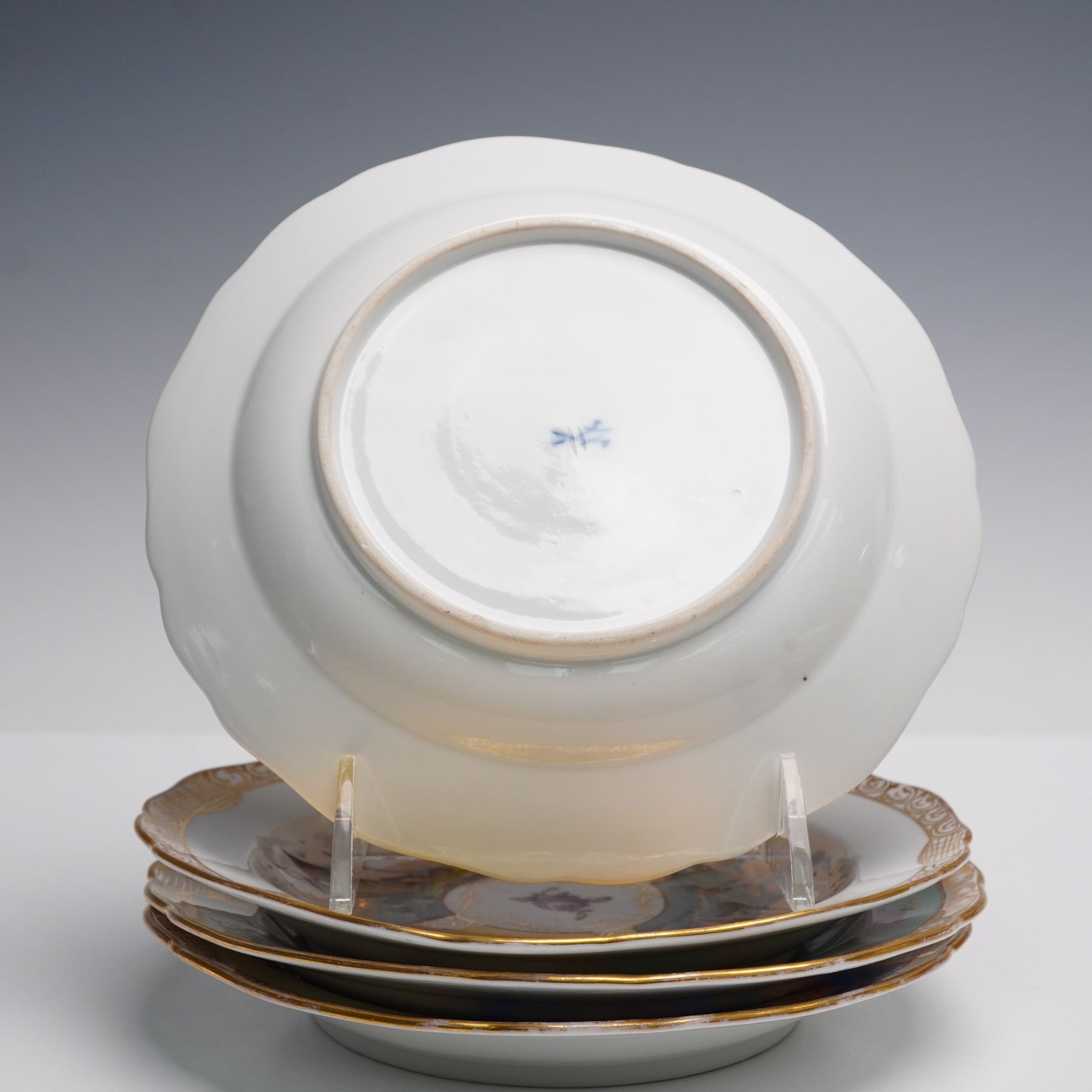 This lot features a 12-piece set of Meissen porcelain plates and bowls, each adorned with vibrant floral and scenic designs. These factory seconds display the characteristic craftsmanship of Meissen, though with etched lines through the backstamp, indicating their status as seconds. The pieces feature a mix of beautiful patterns, from detailed floral motifs to picturesque landscapes, highlighted by intricate gilt borders. These items reflect Meissen's legacy of fine porcelain craftsmanship, despite their factory seconds status.