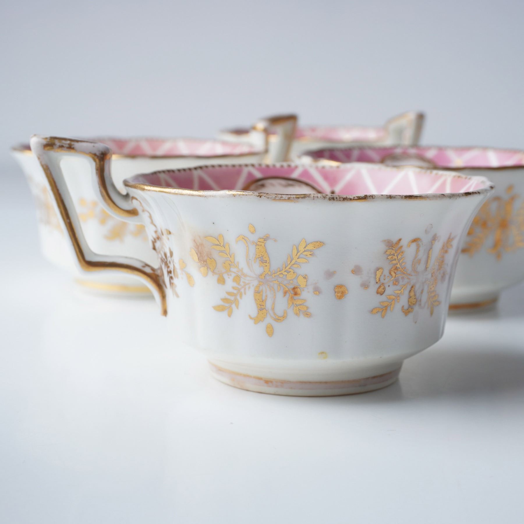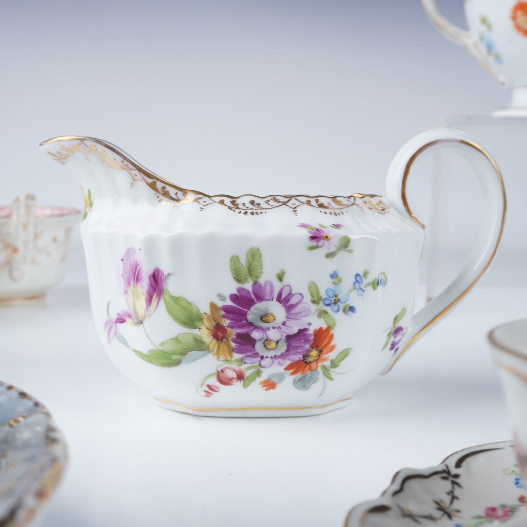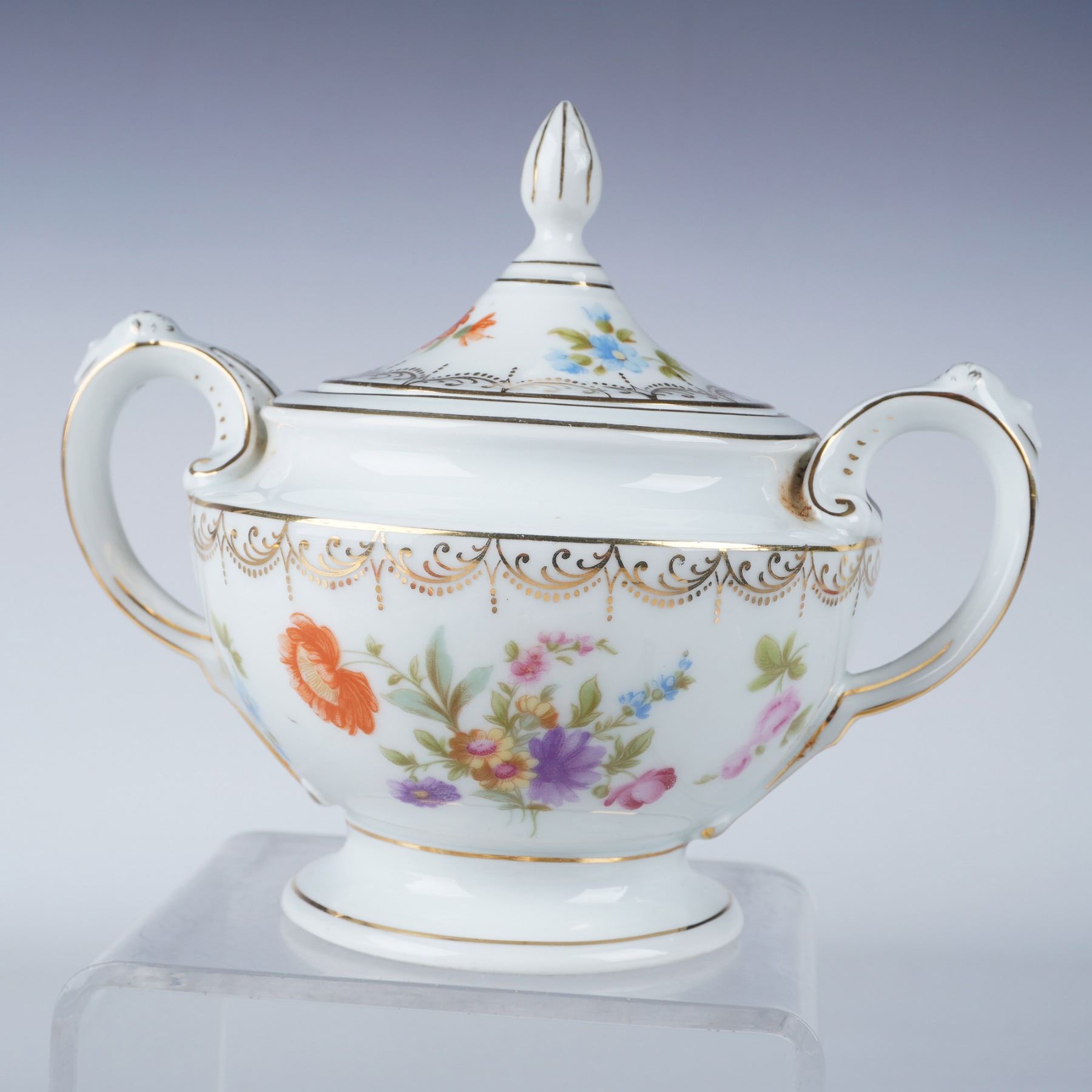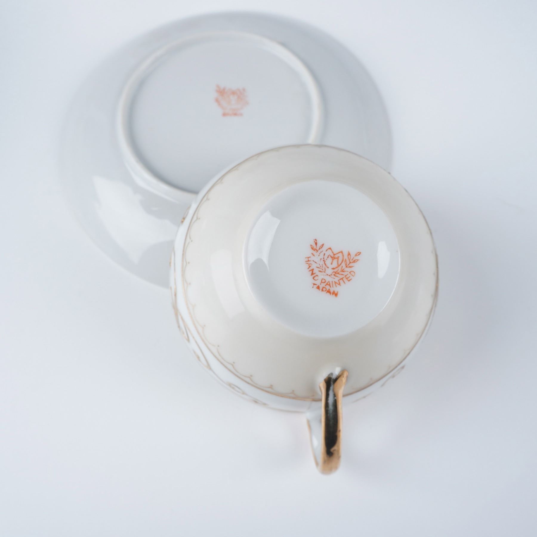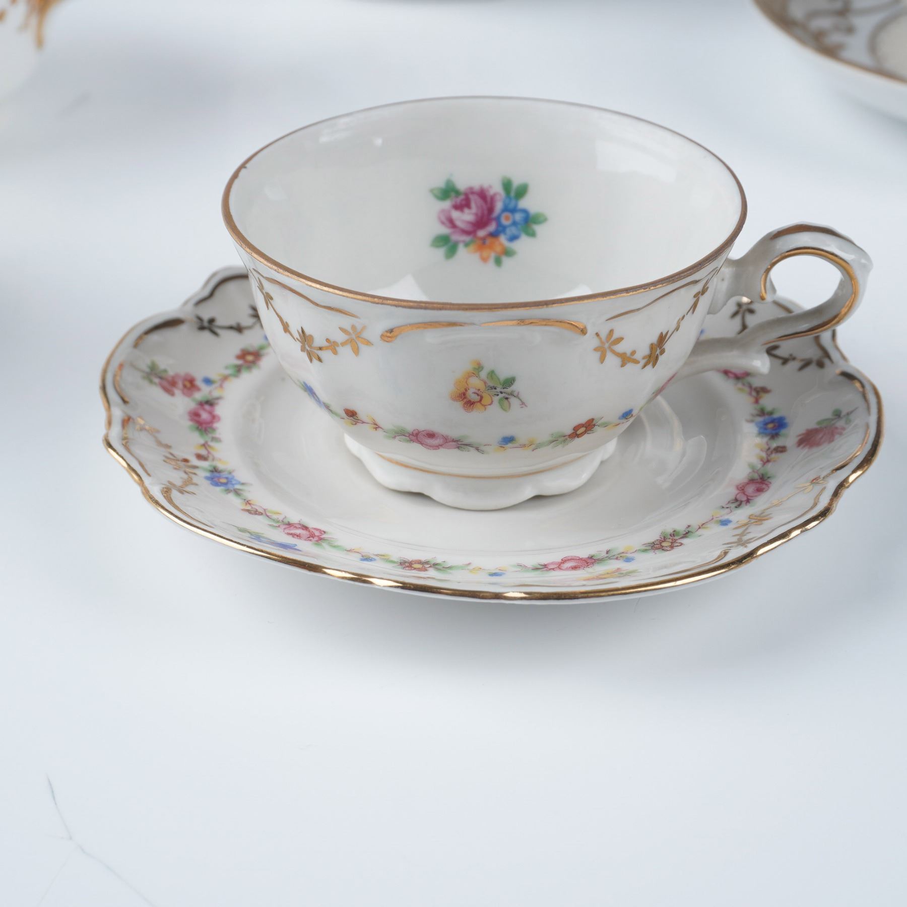 This 12-piece mixed china tea set includes four unmarked tea cups, a Rosenthal covered sugar bowl (measuring 5.5"H), a German creamer with floral designs, a large unmarked cup with matching saucer, a Bavarian cup and saucer, and a delicate Made in Japan cup and saucer. The set showcases a variety of styles, from intricate floral patterns to bold gold accents. The largest saucer measures 7" in diameter, complementing the eclectic charm of this collection.