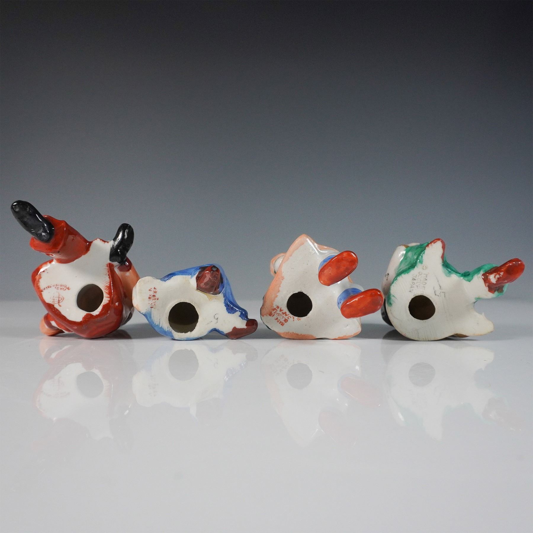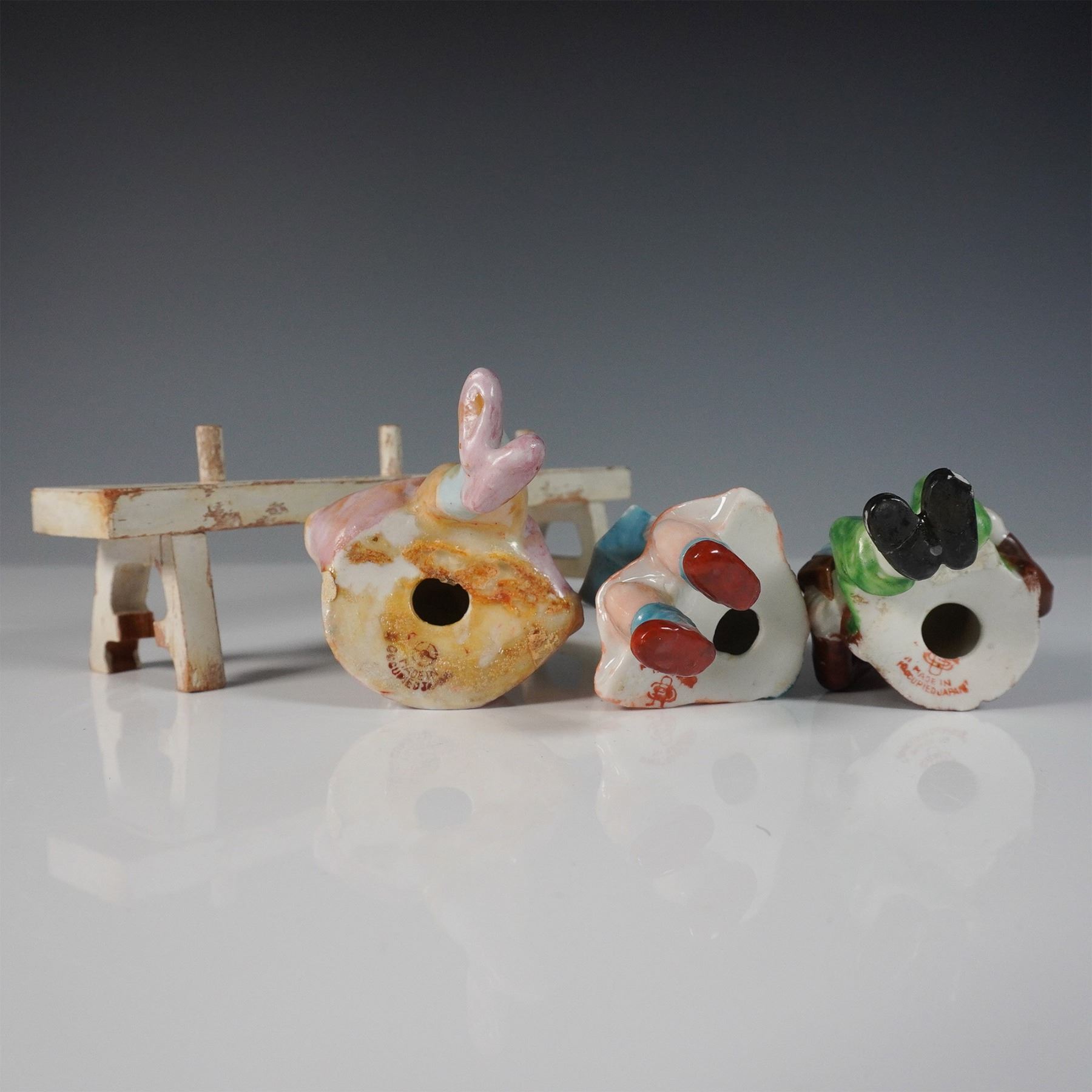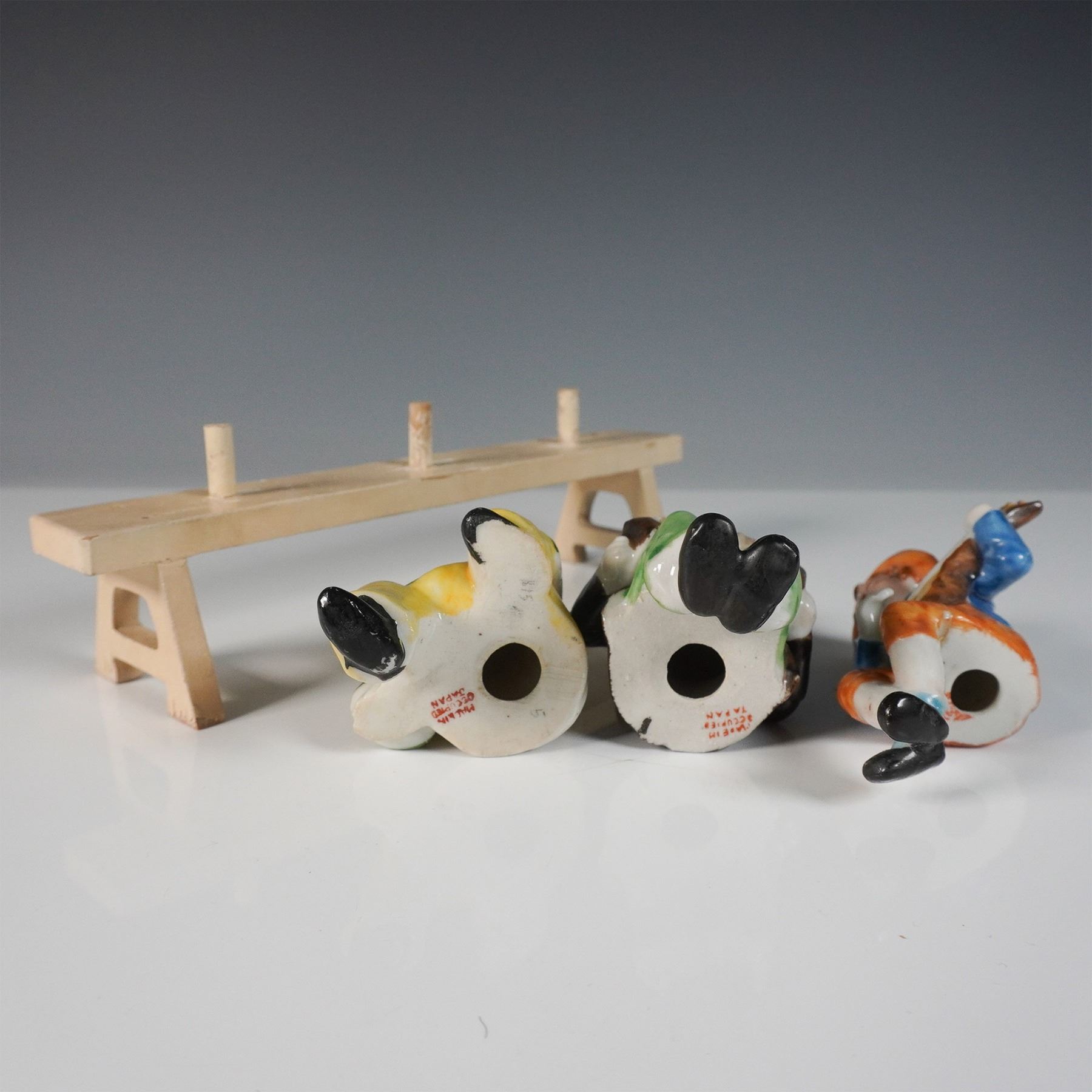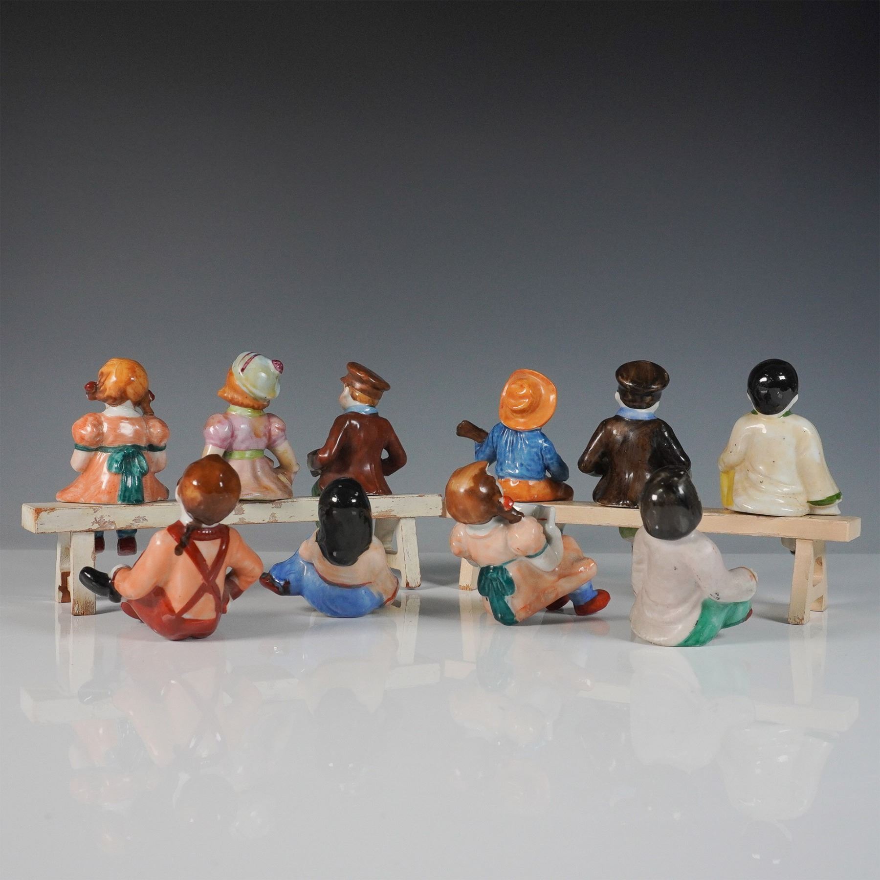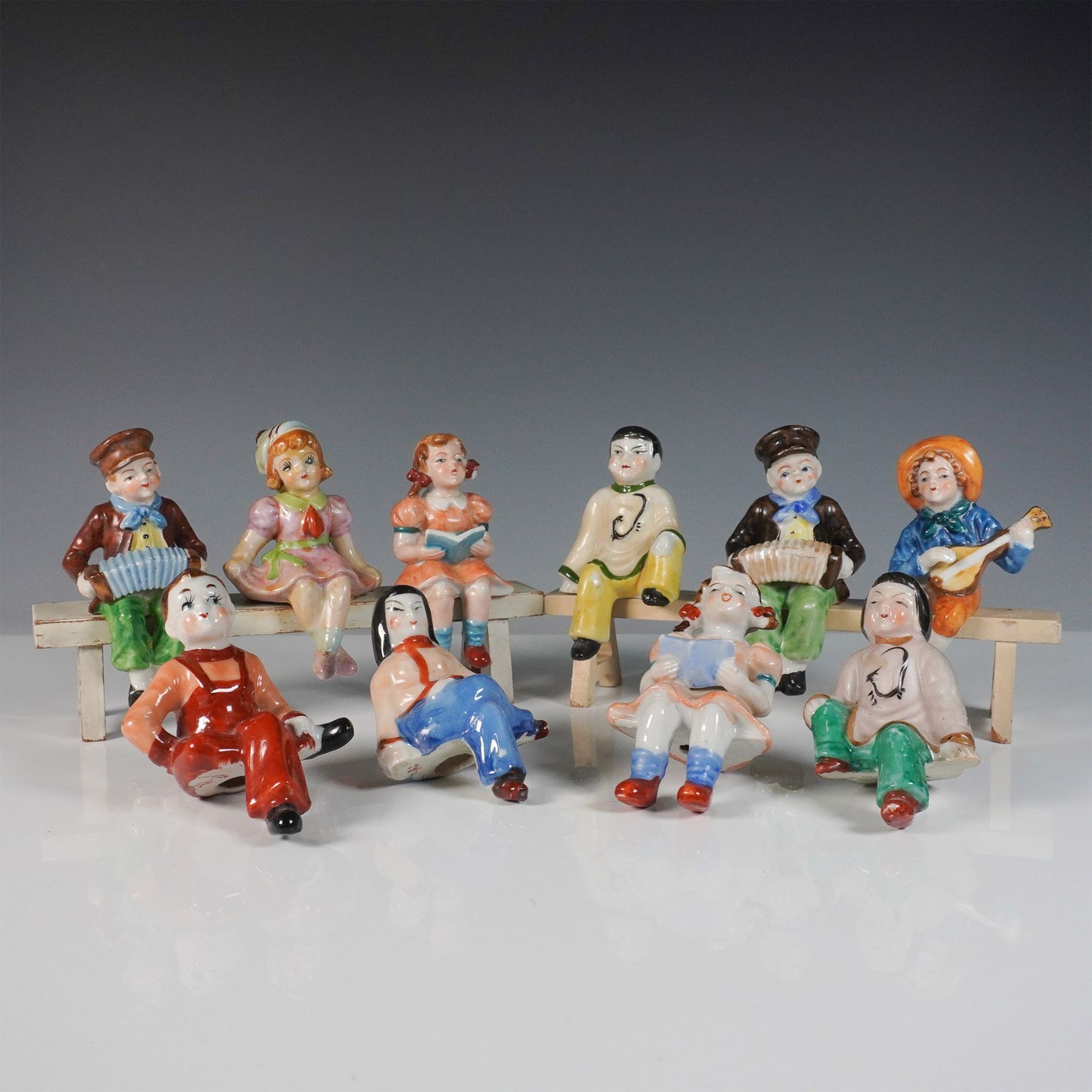 A charming collection of ten hand-painted porcelain figurines, all marked "Occupied Japan." This set features a variety of characters, including musicians playing instruments such as an accordion, mandolin, and drum, as well as seated villagers. Each figure is finely detailed with vibrant colors and expressive features, seated on or around two wooden benches. These post-World War II Japanese export pieces showcase the craftsmanship and whimsical style characteristic of Occupied Japan porcelain.