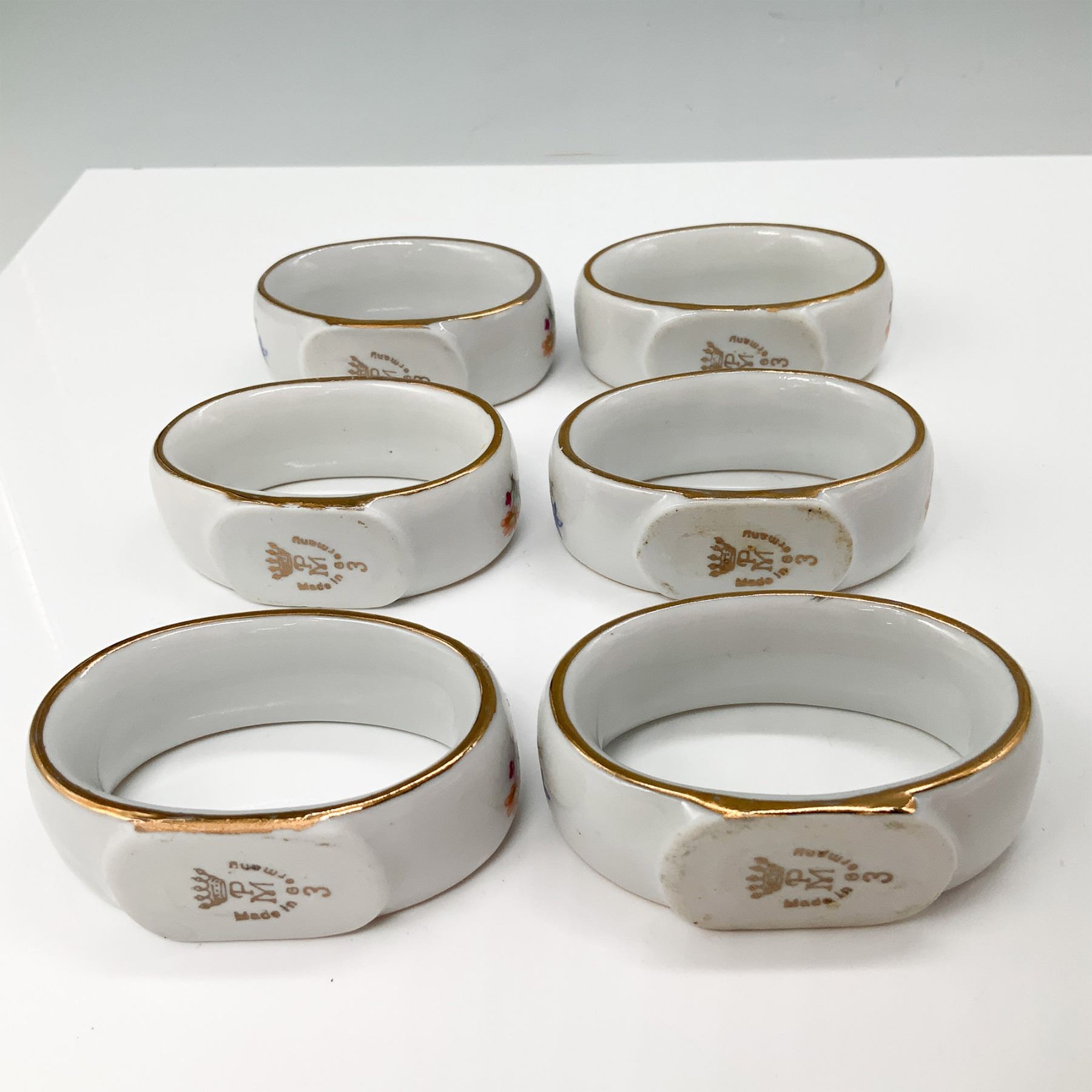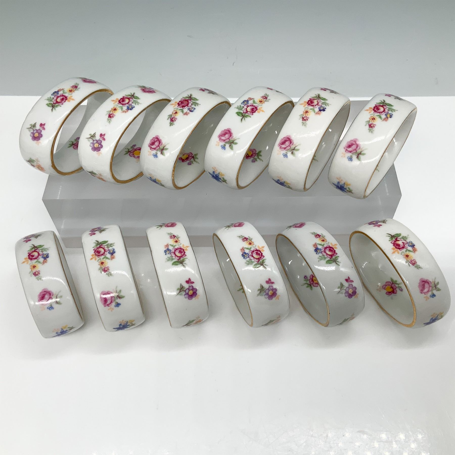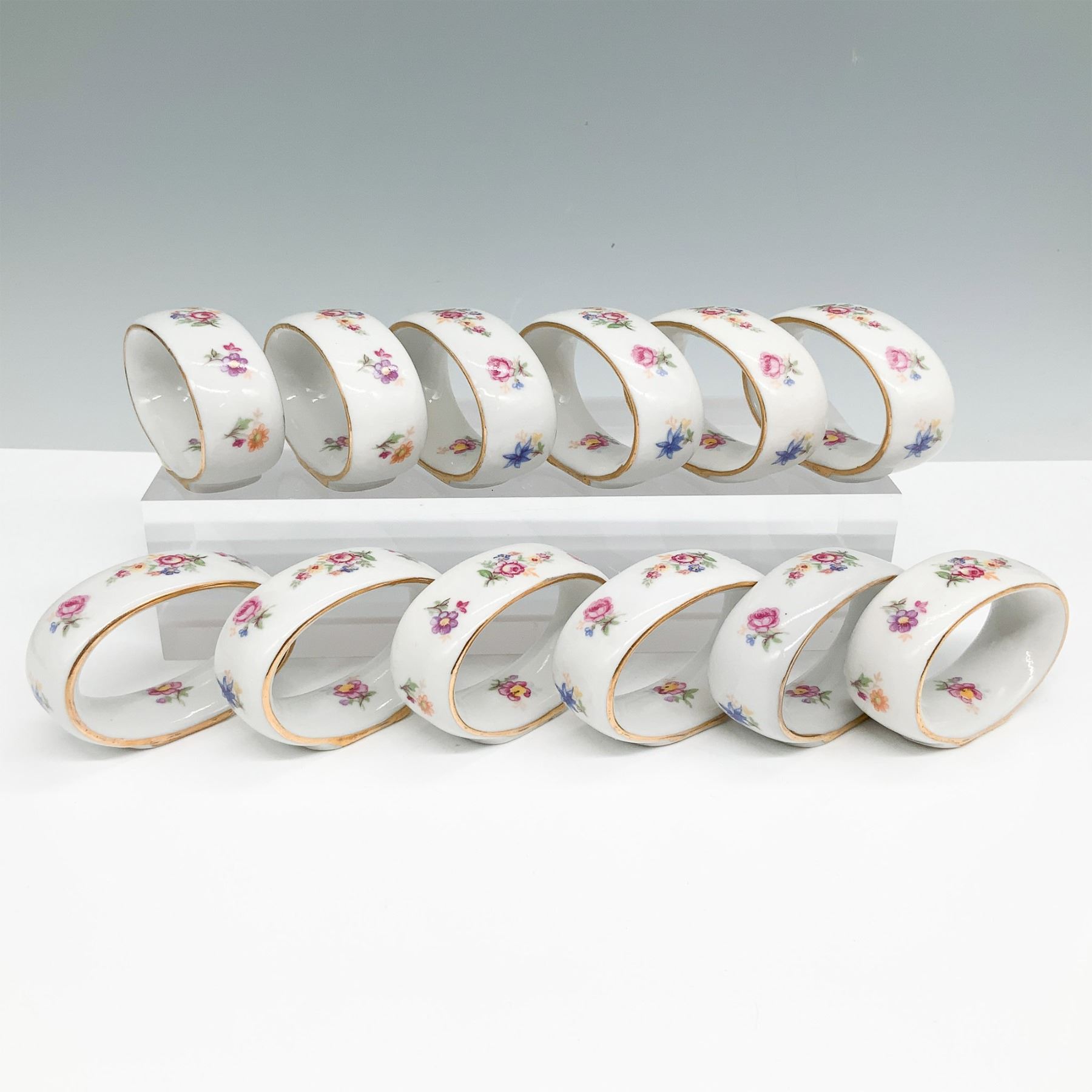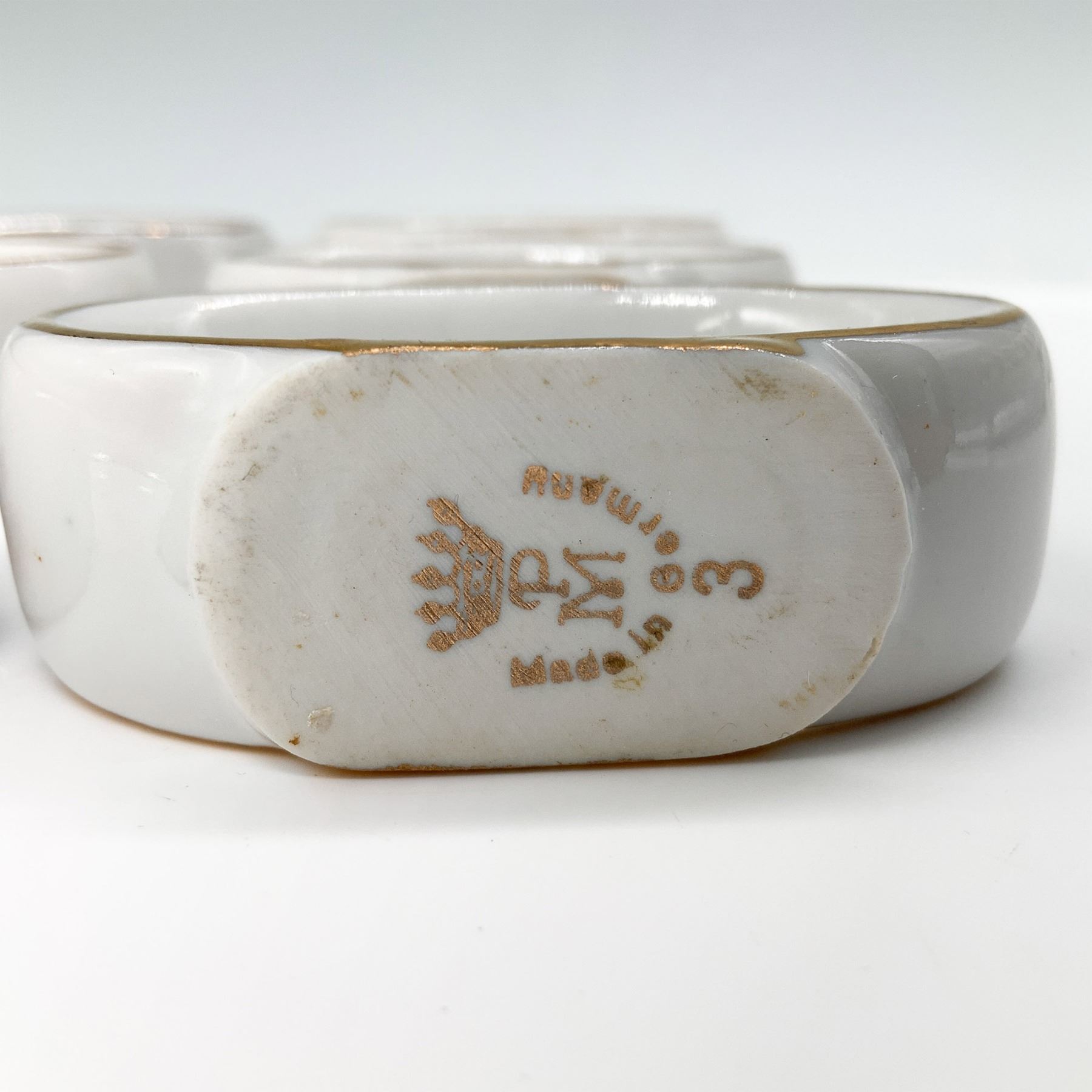 Set of 12 P. Martinroda Germany porcelain napkin rings featuring an elegant floral pattern with multicolored flowers and gold trim. Each piece showcases delicate craftsmanship with detailed hand-painted accents. Marked on the base with the PM Martinroda Germany backstamp. A fine addition to any table setting or porcelain collection.