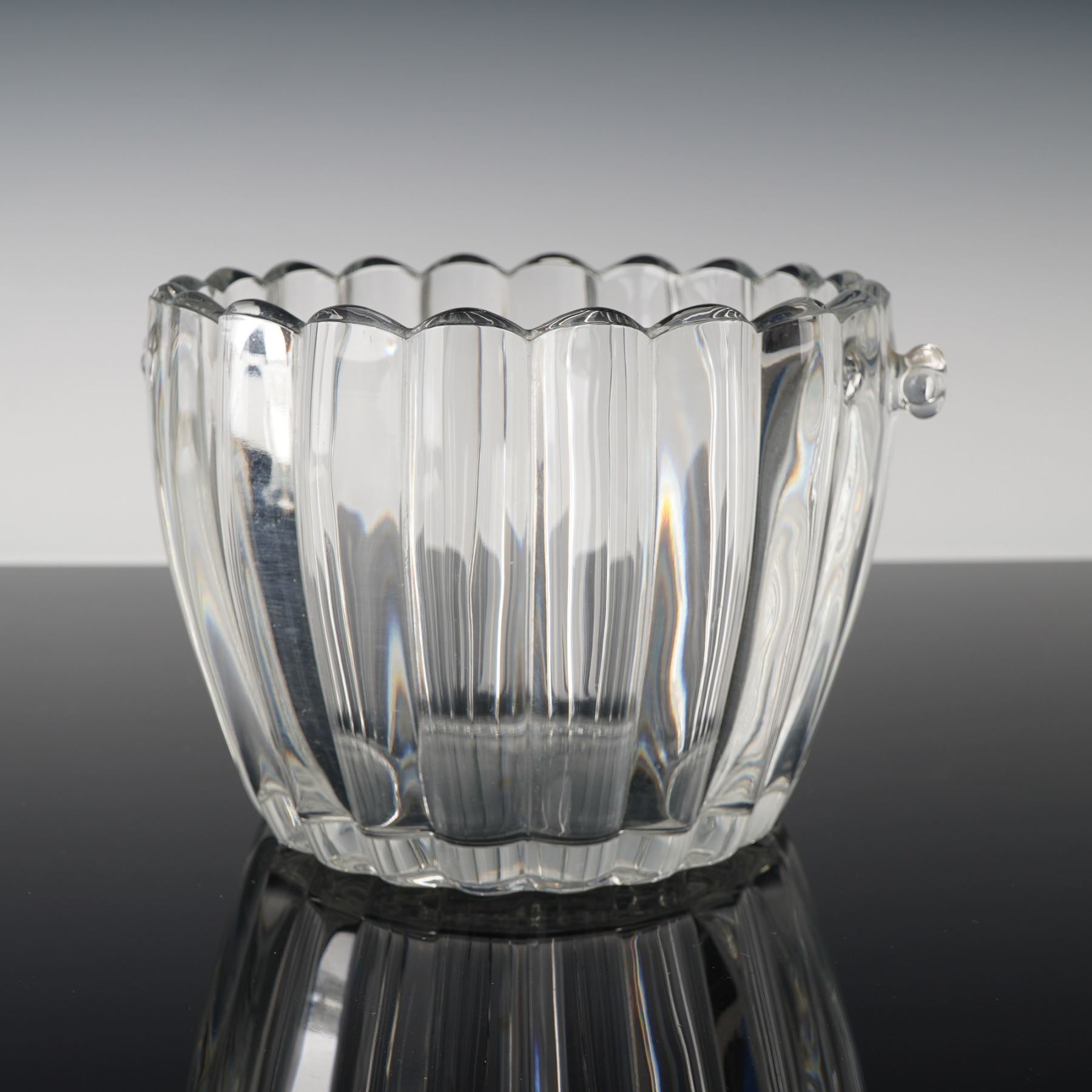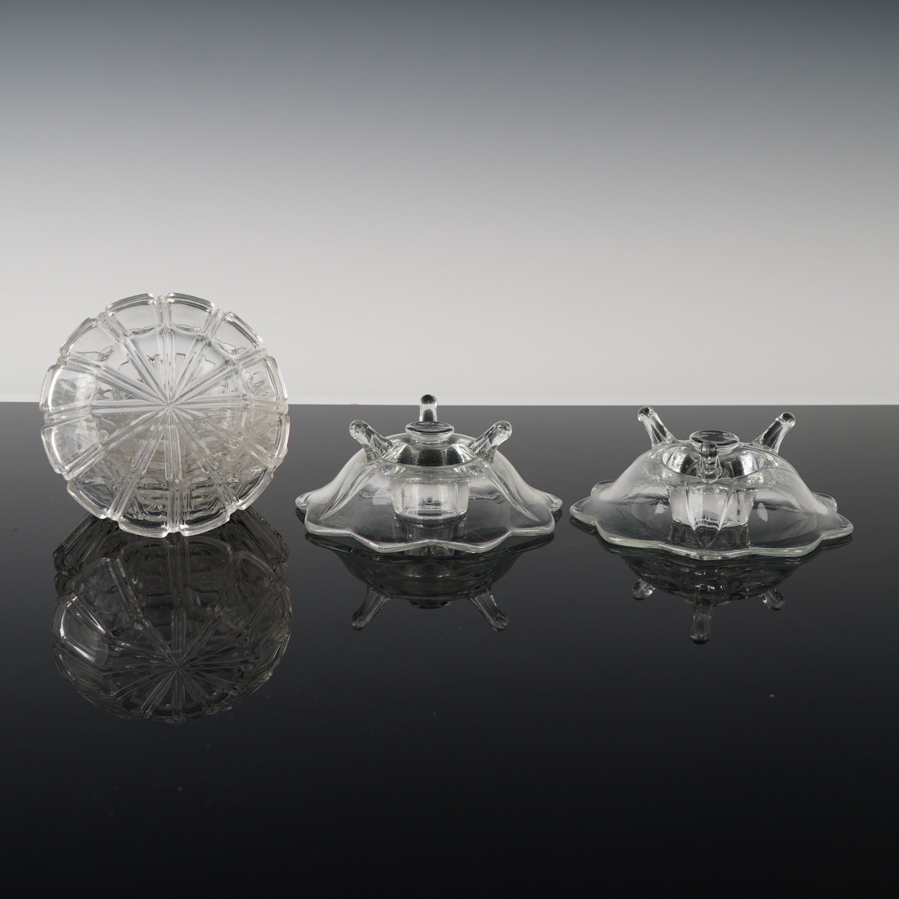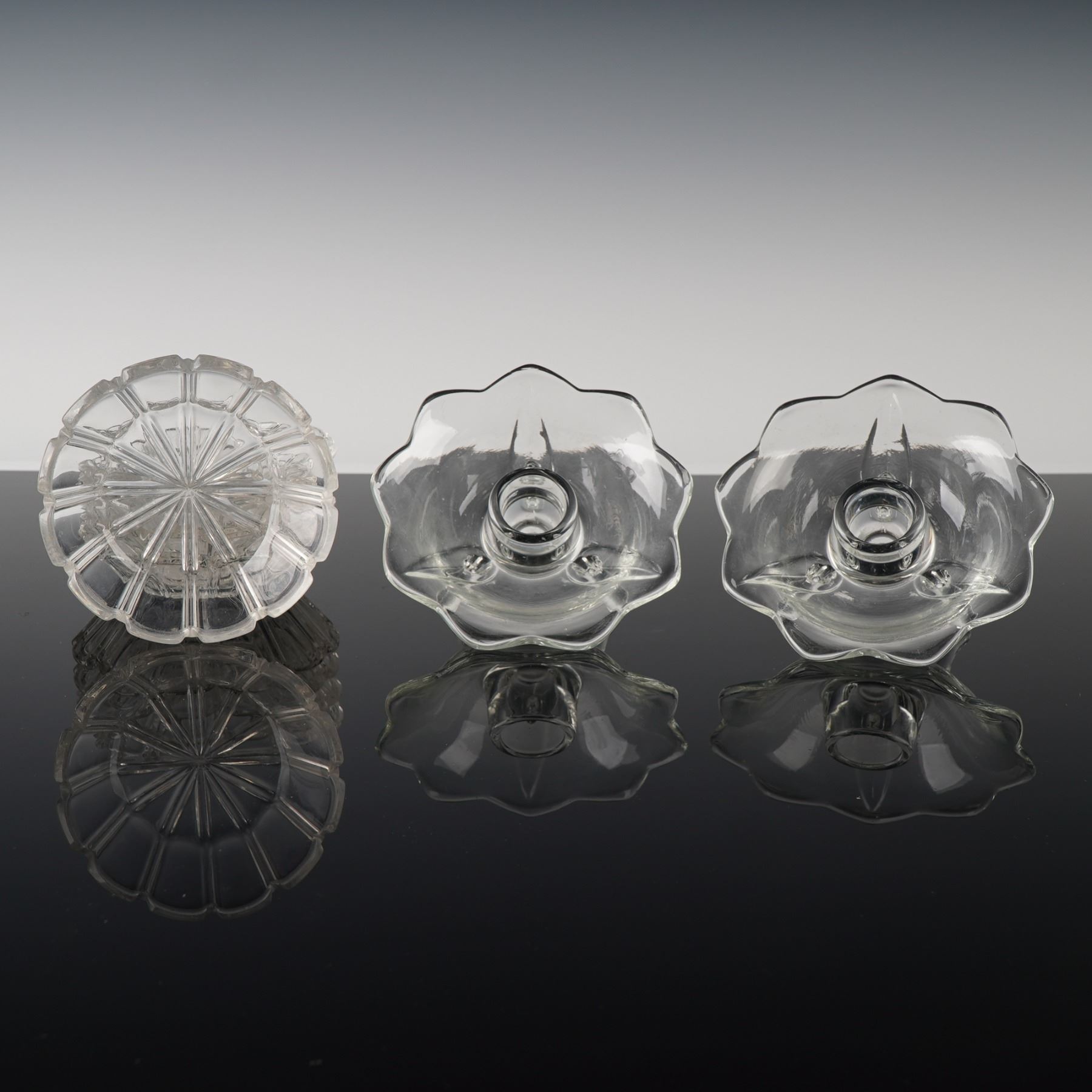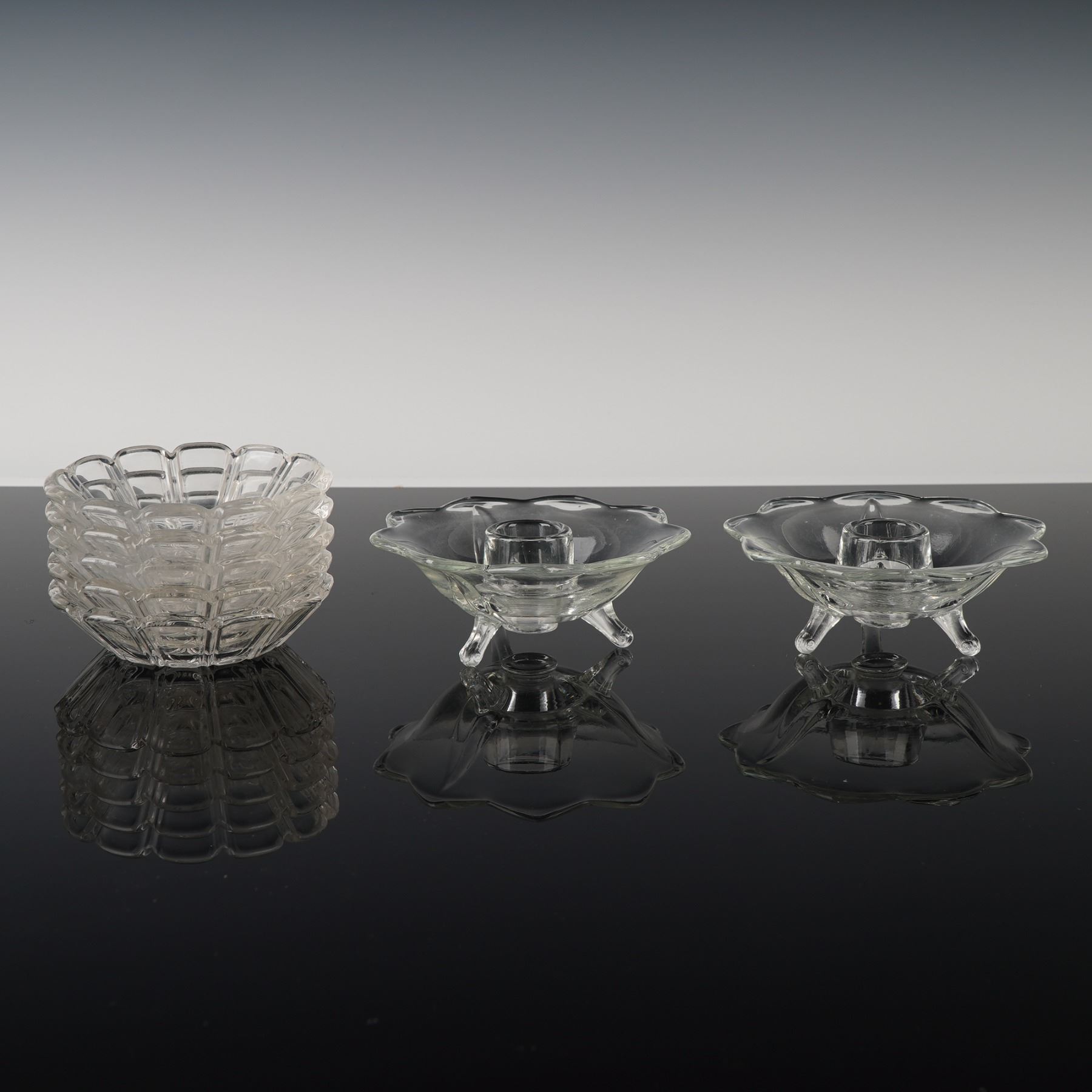 A 12-piece grouping of assorted clear pressed glassware, including a paneled glass bowl with scalloped rim and applied knob handles. Also featured are two matching candleholders, five small nut dishes with scalloped edges, one saucer, and three handled cups. The collection showcases a variety of classic molded patterns with ribbed, floral, and geometric designs, well-suited for vintage-style entertaining or display.