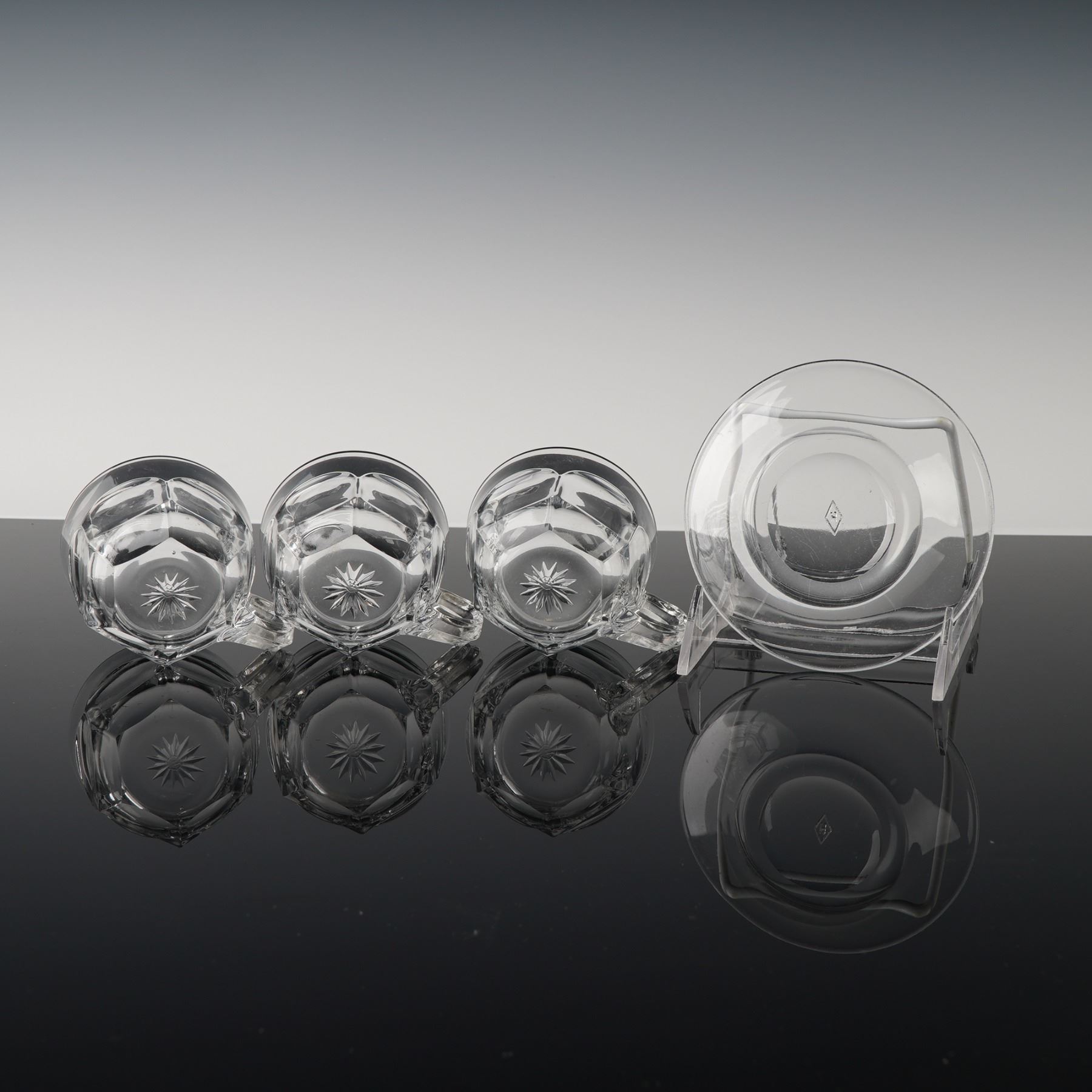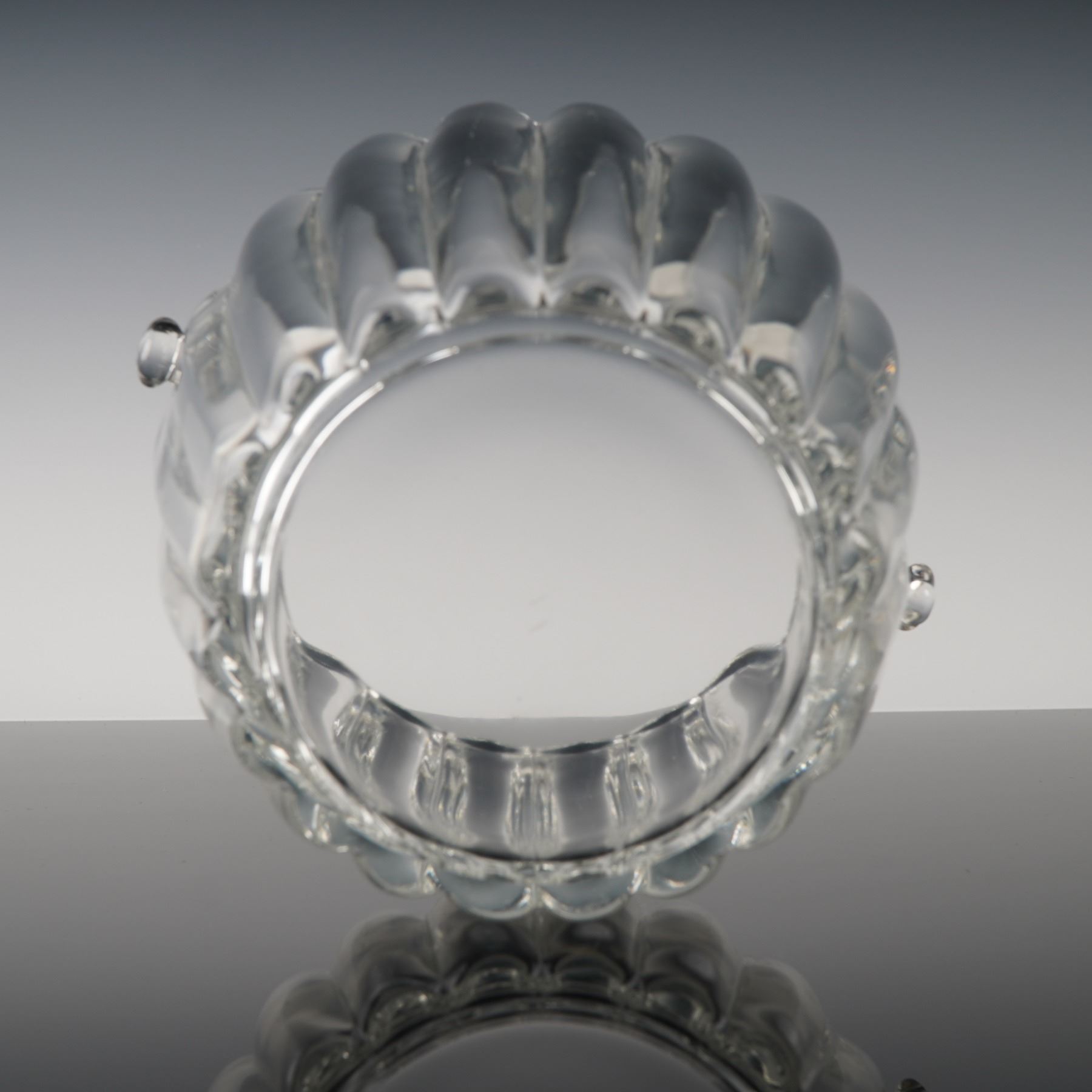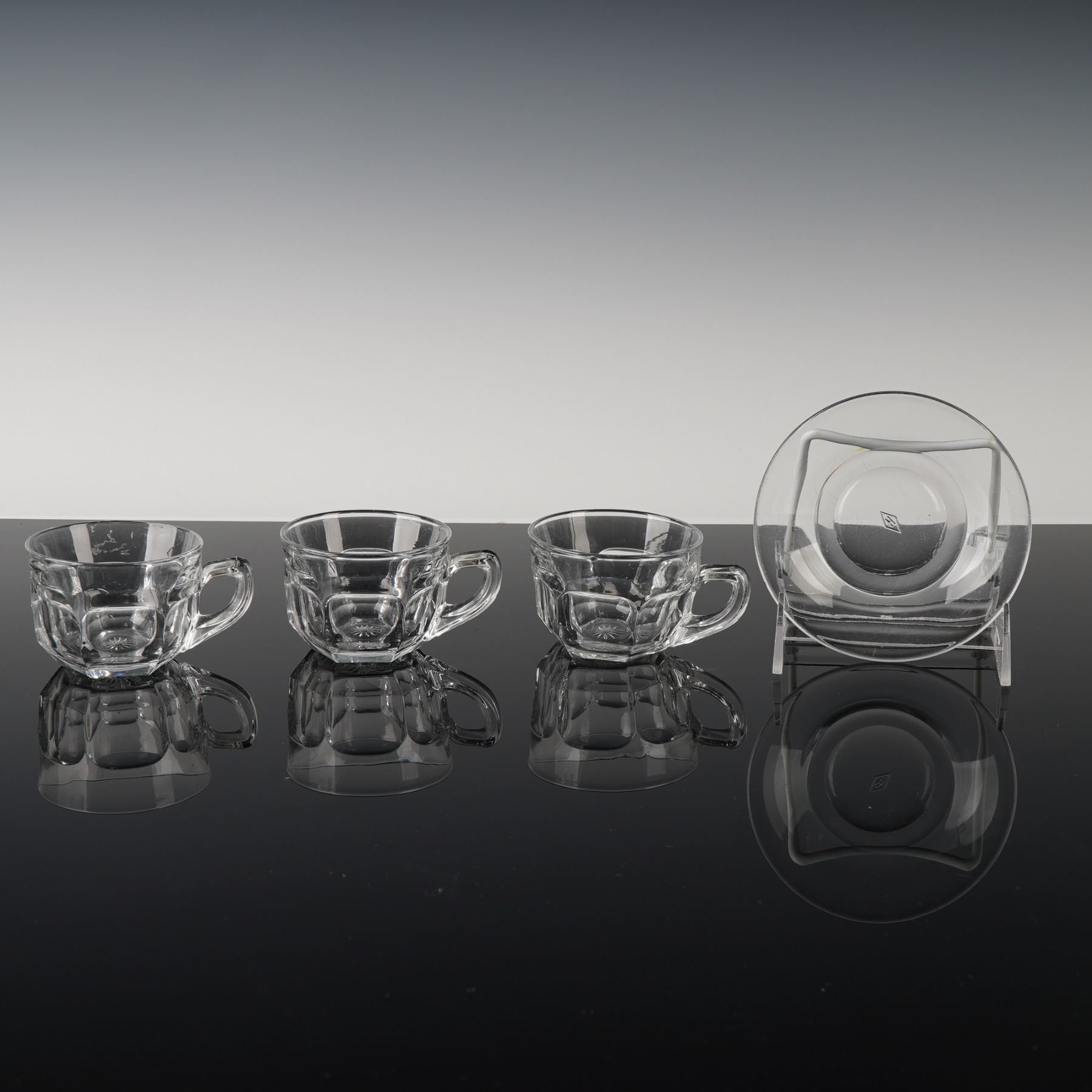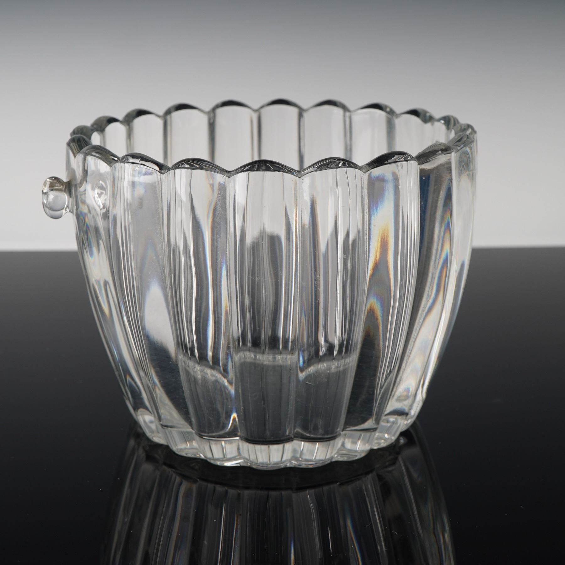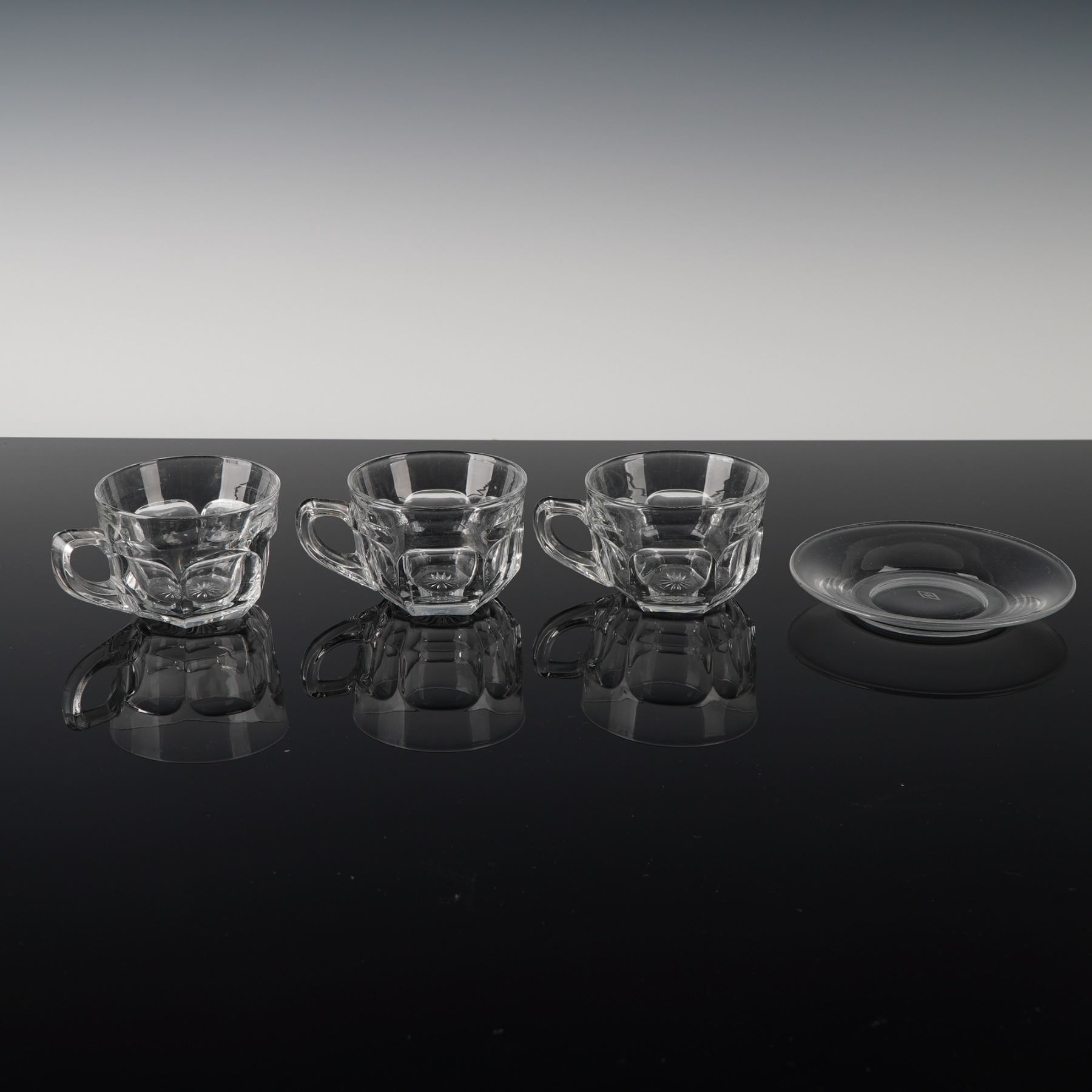 A 12-piece grouping of assorted clear pressed glassware, including a paneled glass bowl with scalloped rim and applied knob handles. Also featured are two matching candleholders, five small nut dishes with scalloped edges, one saucer, and three handled cups. The collection showcases a variety of classic molded patterns with ribbed, floral, and geometric designs, well-suited for vintage-style entertaining or display.
