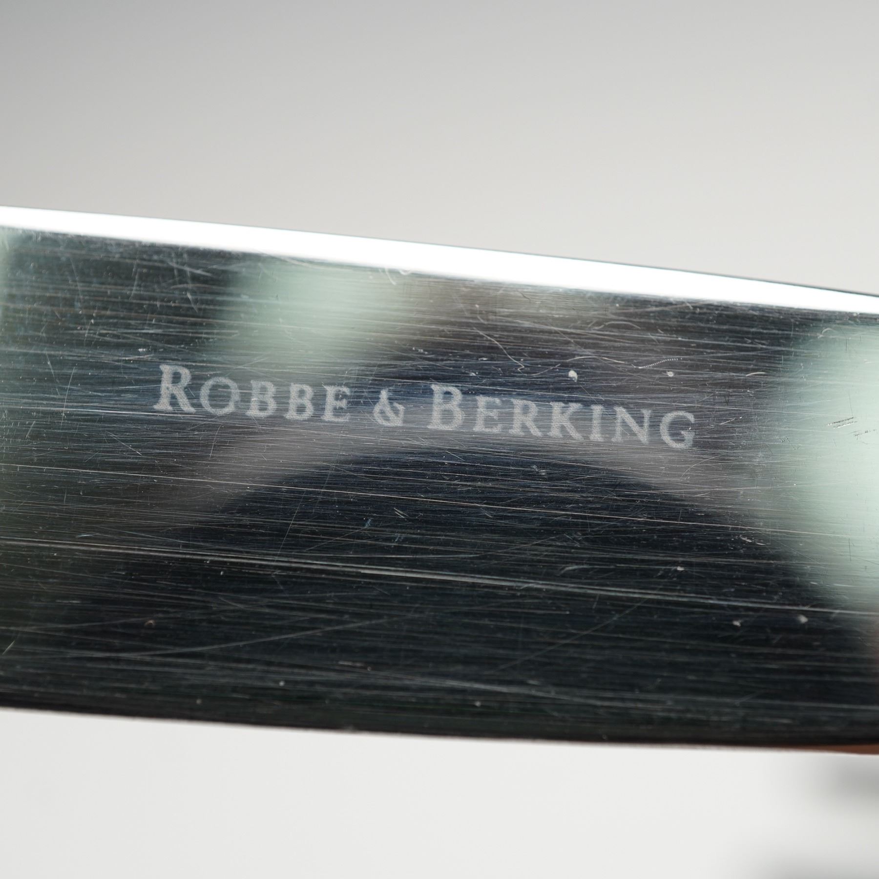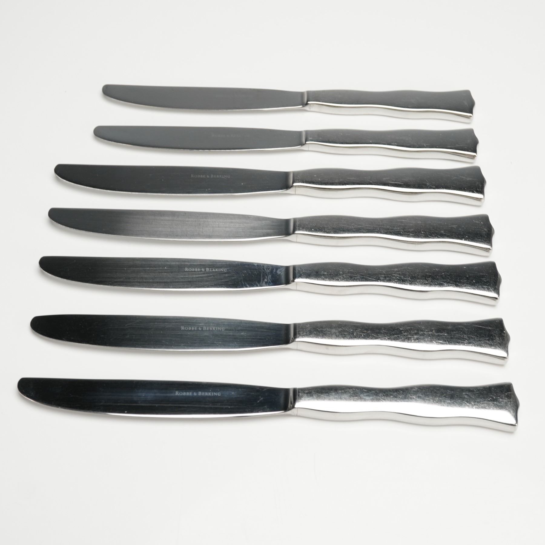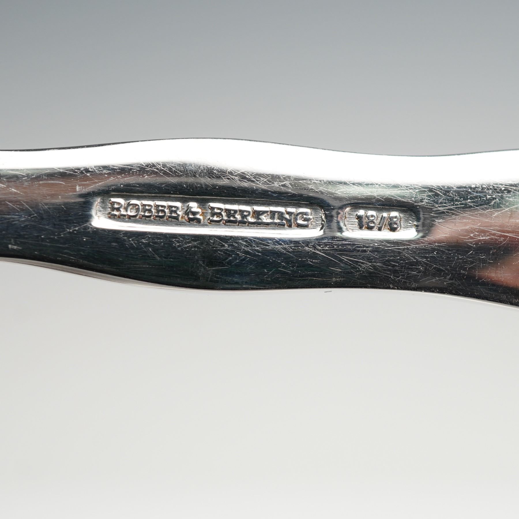 Collection includes one cake fork, three soup spoons, one coffee spoon, two butter knives, and five dinner knives, all shaped with the pattern's distinct wavy handles that give every piece a flowing outline. Robbe and Berking backstamp. Marked 18 / 18.