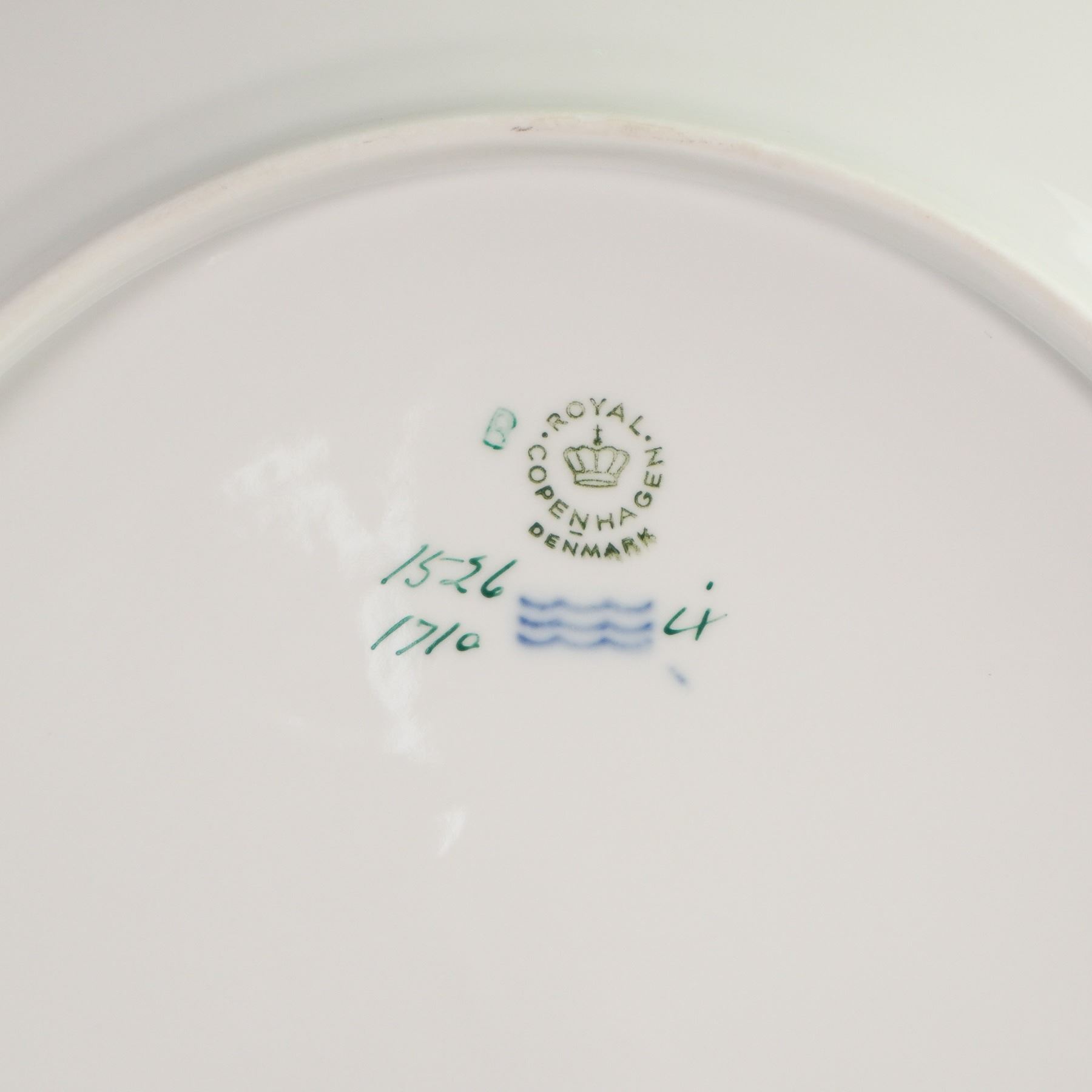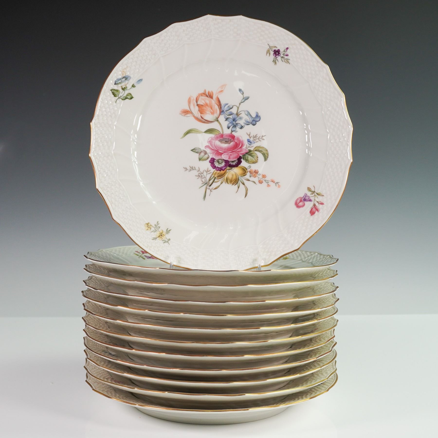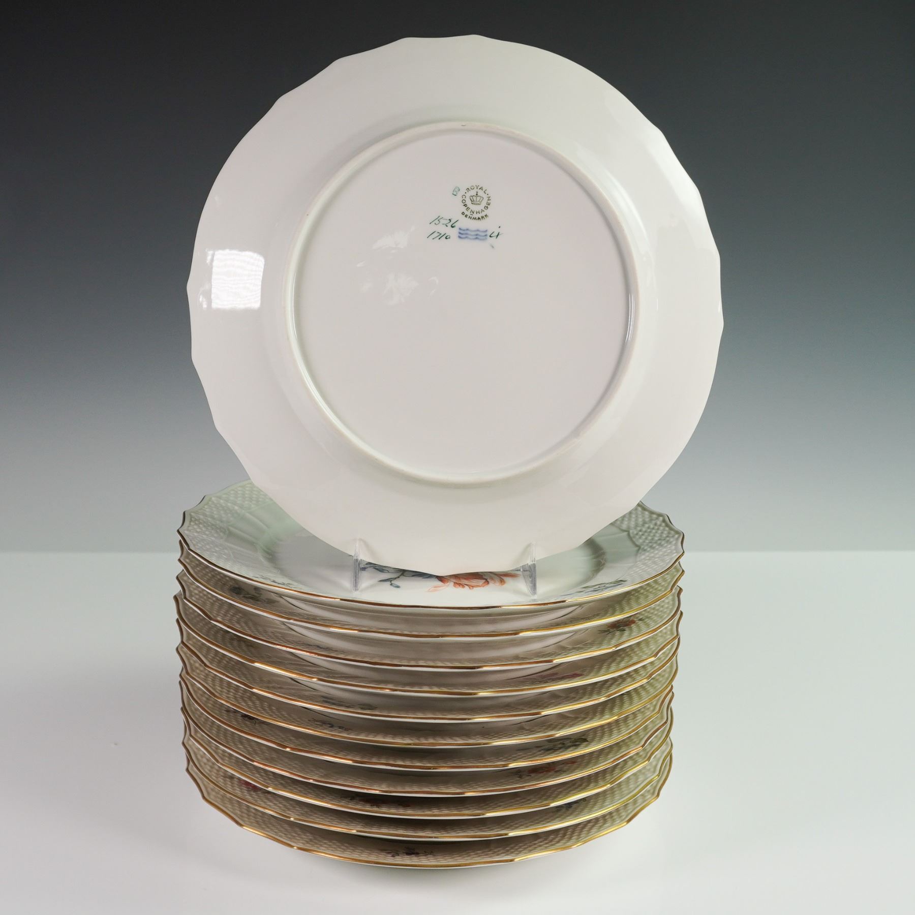Set of twelve Royal Copenhagen porcelain dinner plates in the Frijsenborg pattern. Each plate features a finely hand-painted central floral bouquet with additional sprigs near the rim, bordered by a molded basketweave edge and finished with scalloped gilt-trimmed rims. All plates bear the Royal Copenhagen backstamp with three-wave mark and painter's initials.