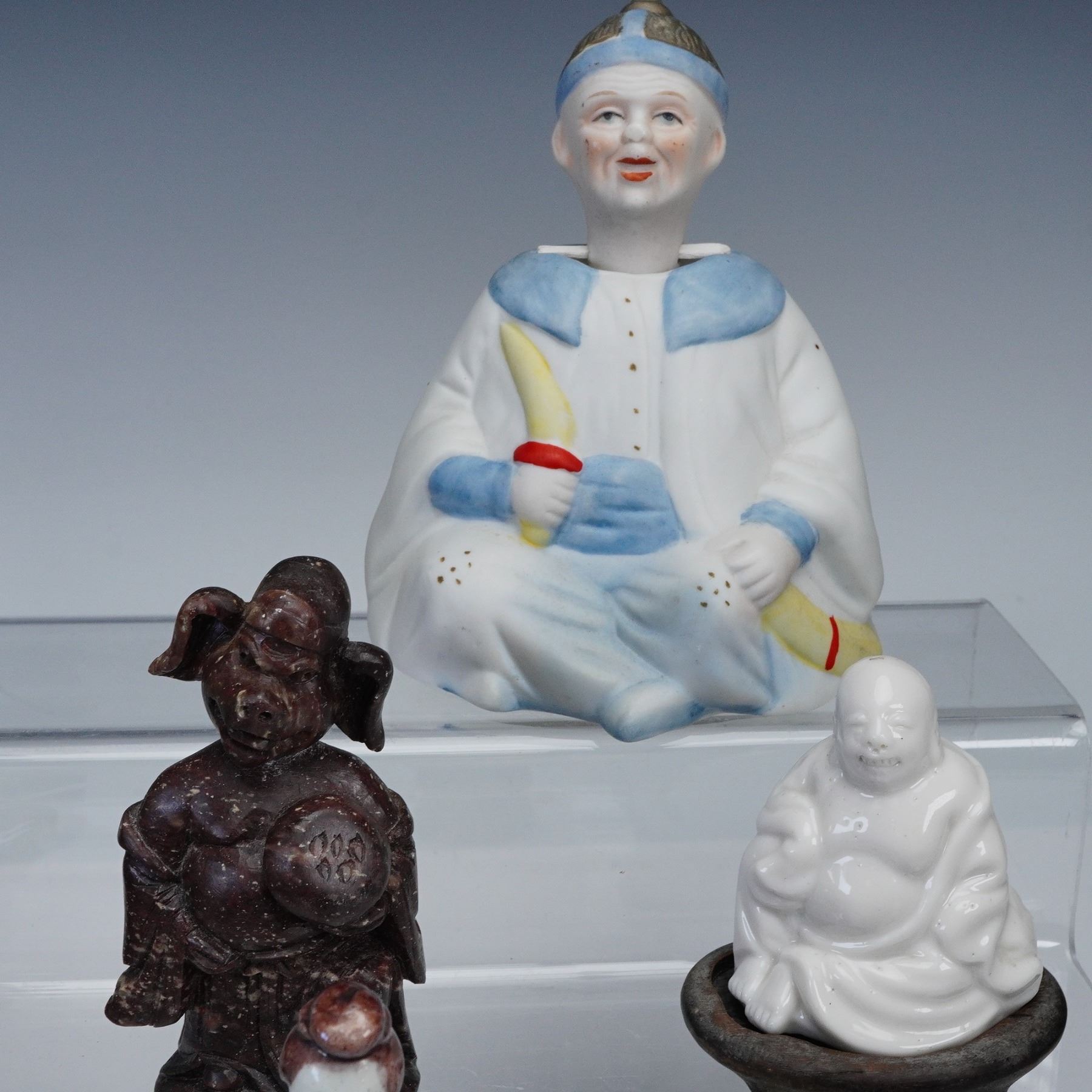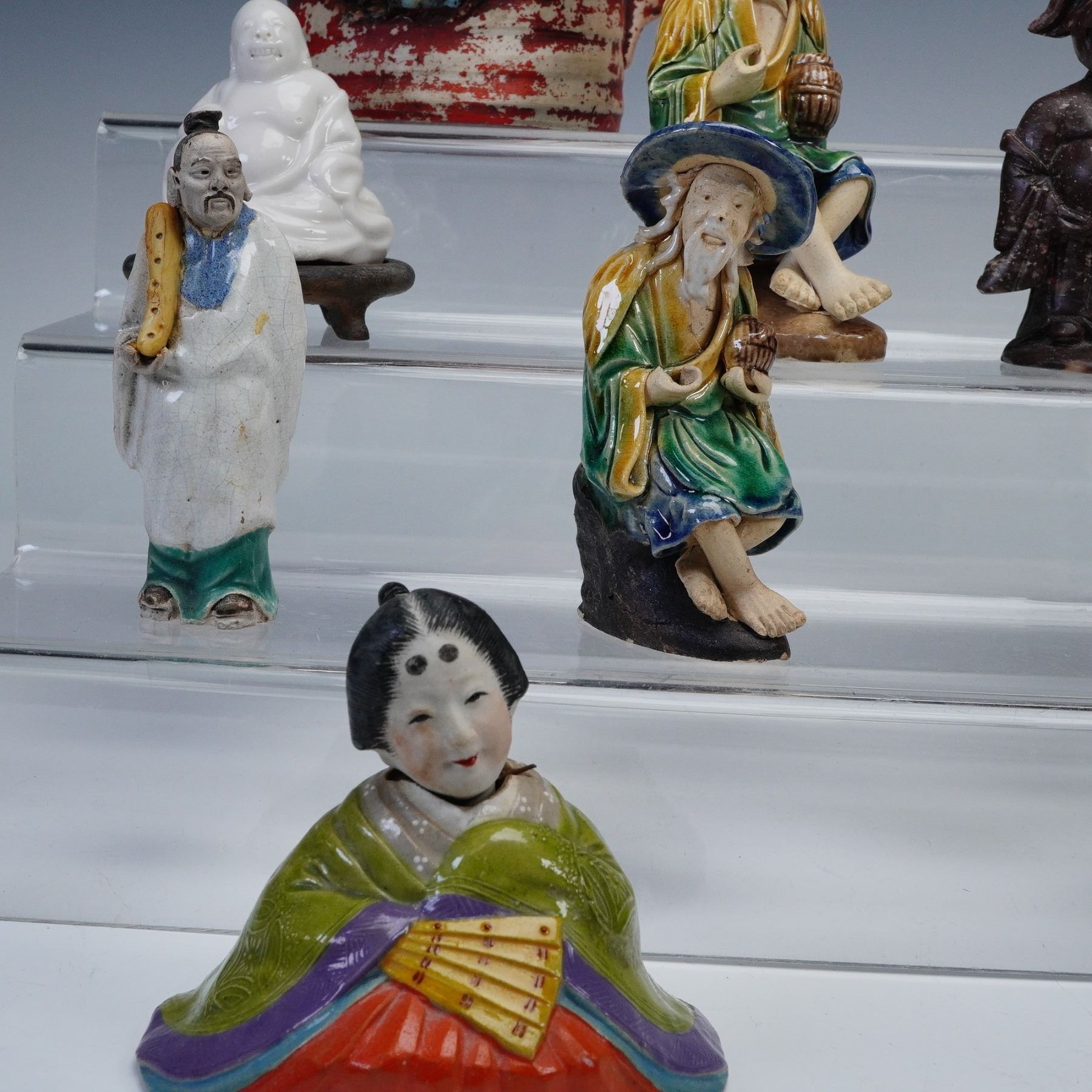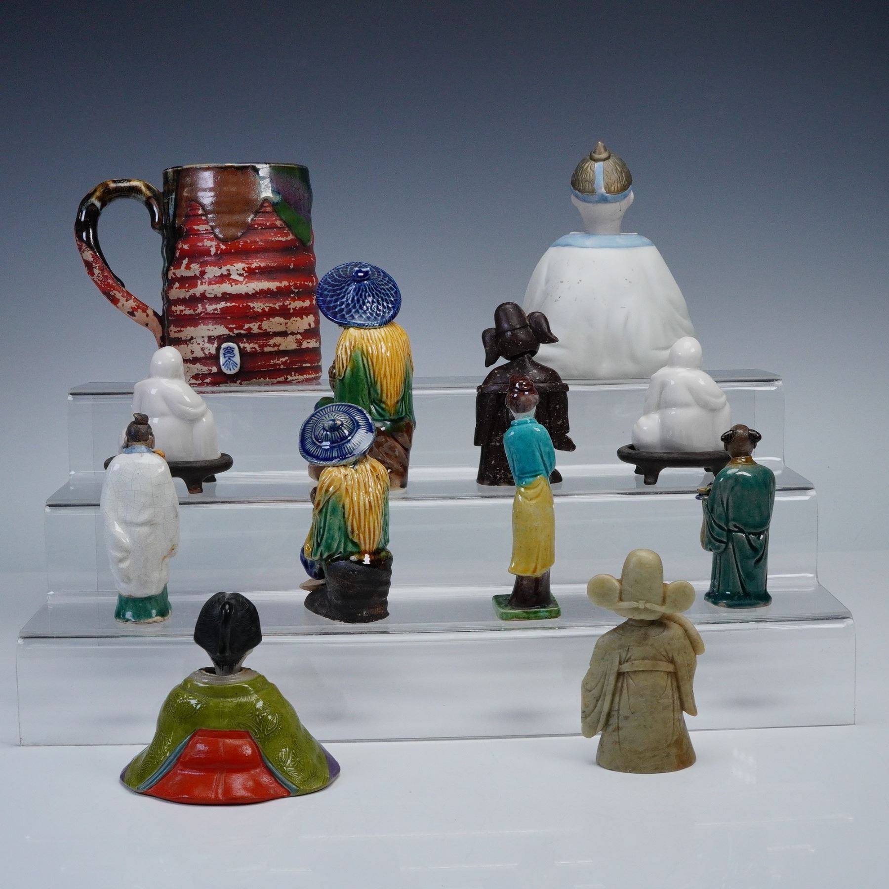 Decorative objects including a Sumida Gawa mug with applied figural decoration, four glazed mud men figurines in various poses, two porcelain laughing Buddha figures on stands, two carved stone bobble head figures, two porcelain nodders in colorful attire, and one polychrome ceramic figurine in traditional dress holding a fan.