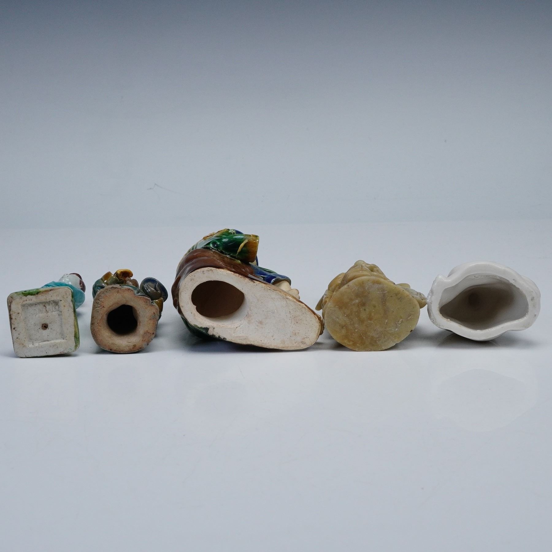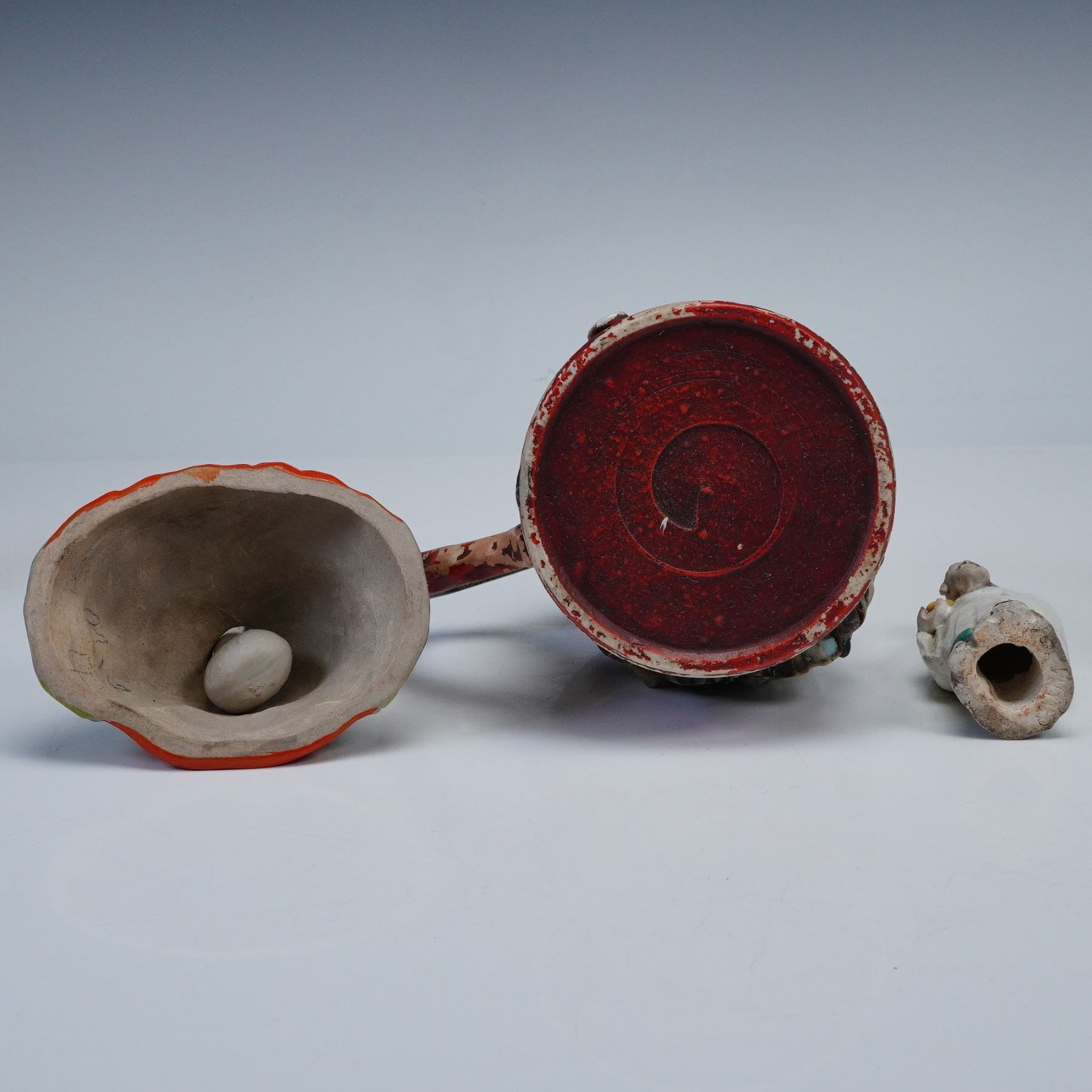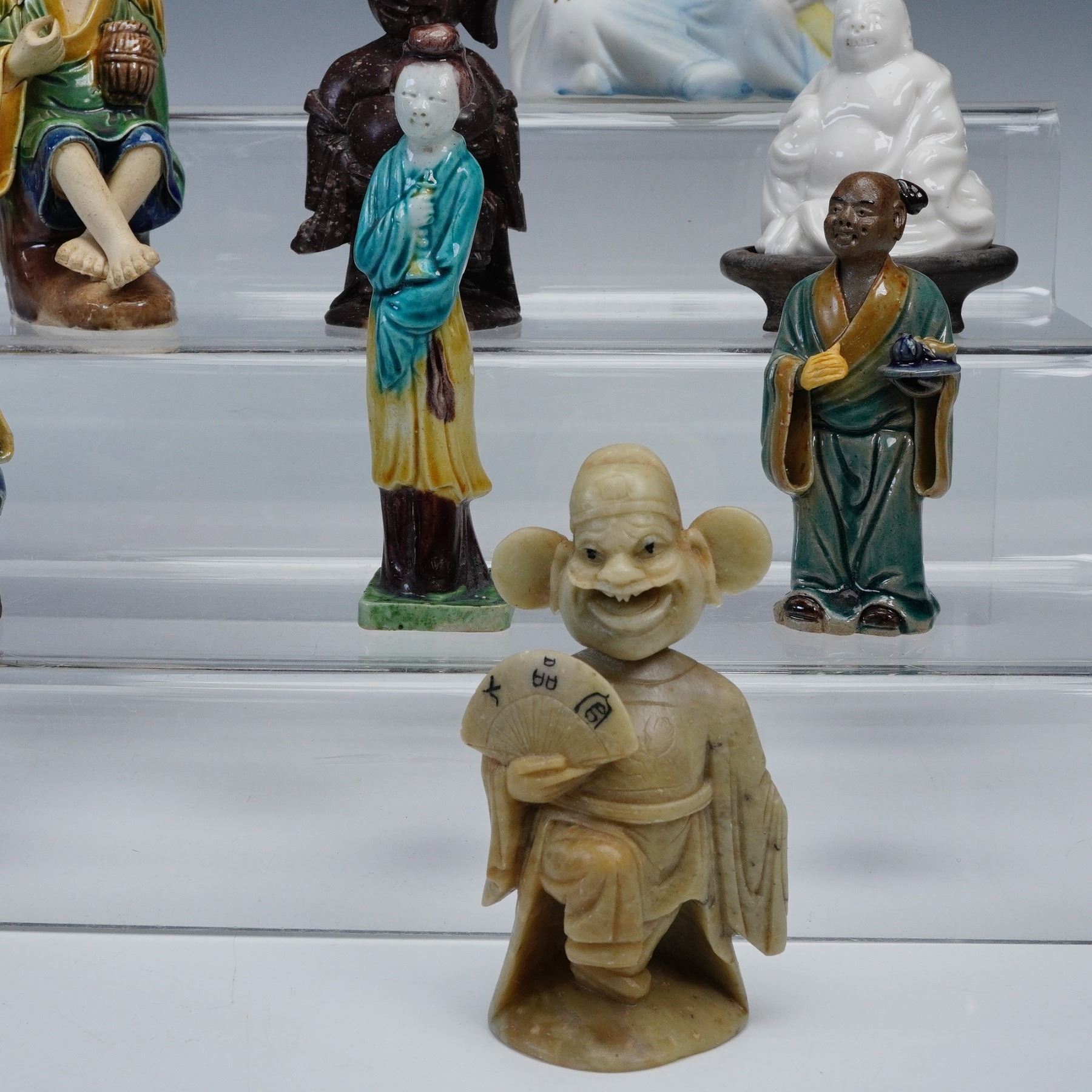 Decorative objects including a Sumida Gawa mug with applied figural decoration, four glazed mud men figurines in various poses, two porcelain laughing Buddha figures on stands, two carved stone bobble head figures, two porcelain nodders in colorful attire, and one polychrome ceramic figurine in traditional dress holding a fan.