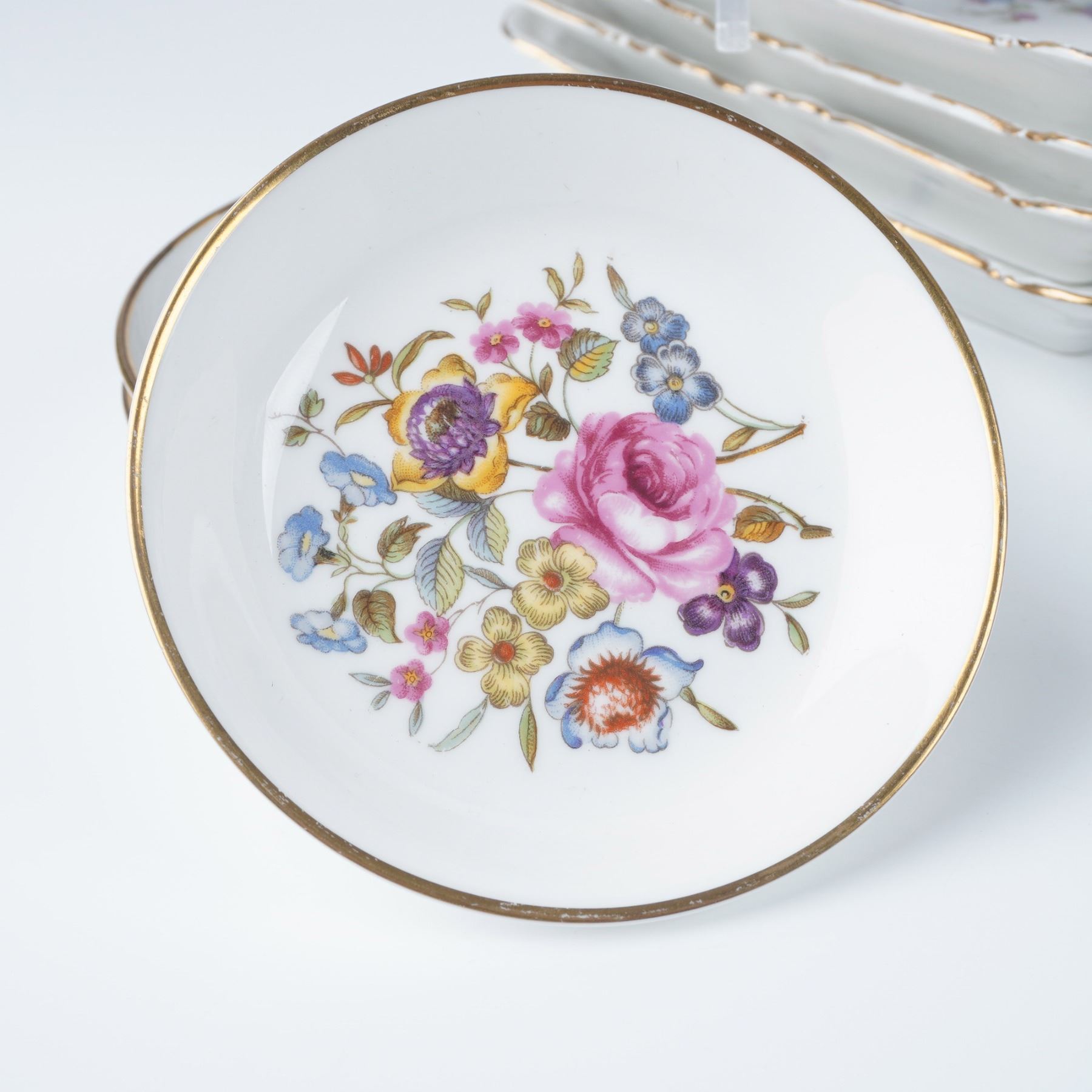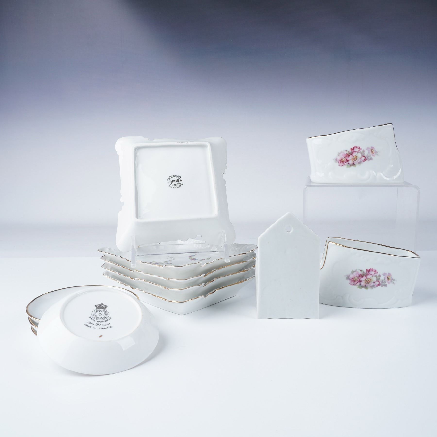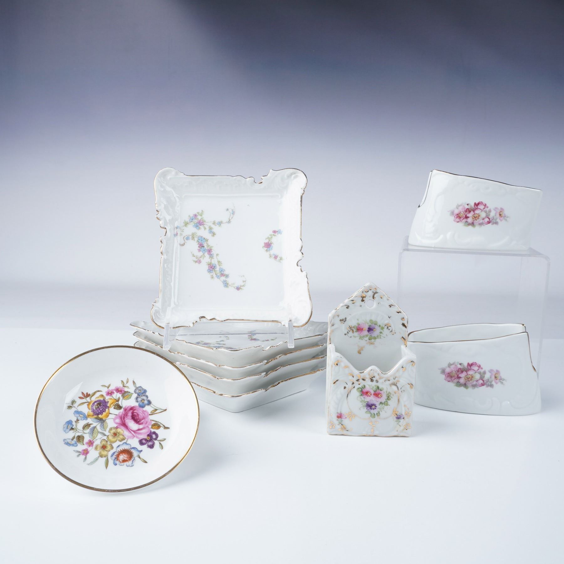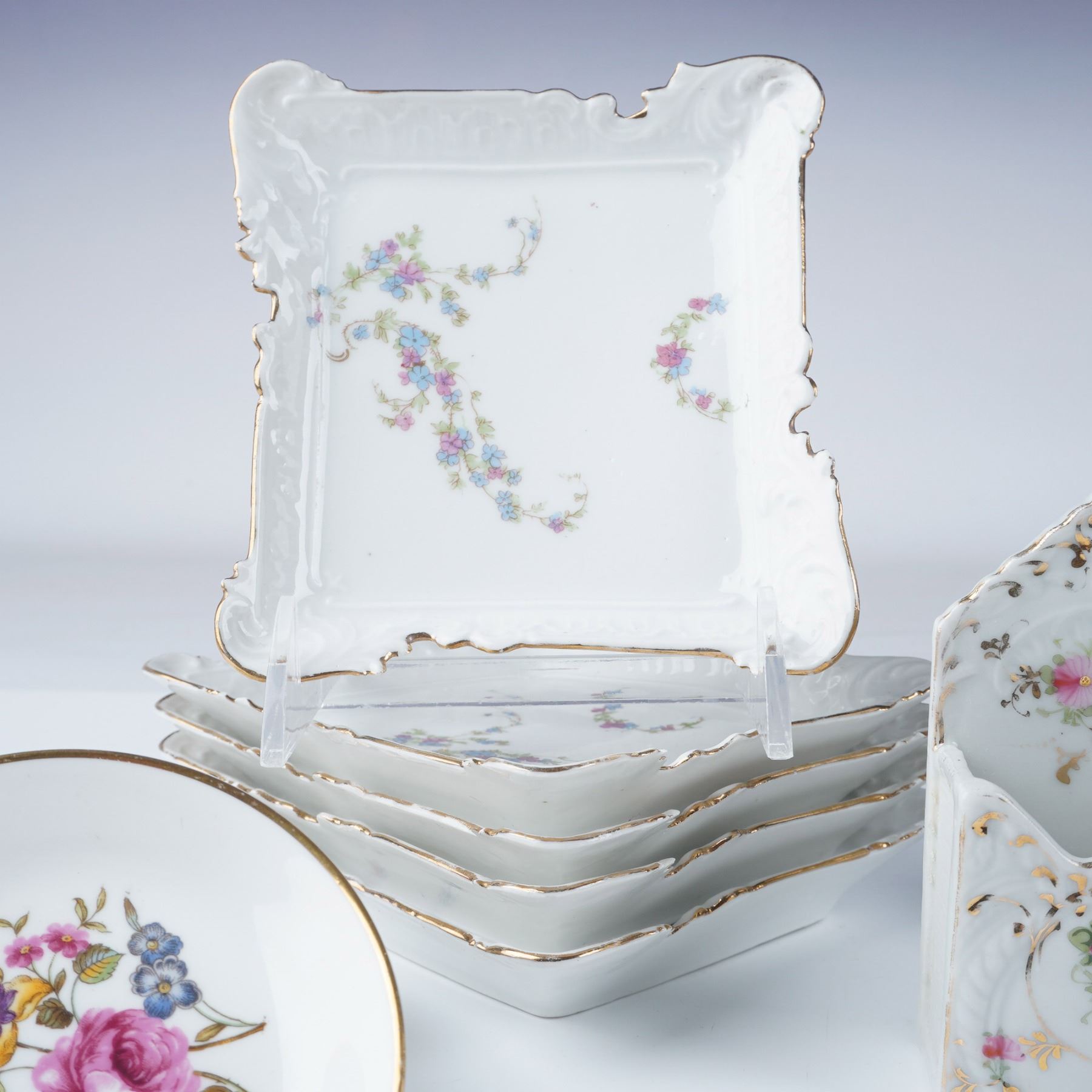 A 12-piece collection of porcelain tableware featuring floral motifs and gold trim, including four small round dishes, five square dishes, a decorative wall pocket, and a pair of spoon rests. The set includes backstamps from Carlsbad China (Austria), Royal Worcester (England), and Gerold Porzellan (West Germany), representing a mix of European porcelain craftsmanship. Each piece highlights fine craftsmanship and vintage charm, making this an excellent addition to any collection or display. Tallest item: 4.25"H.