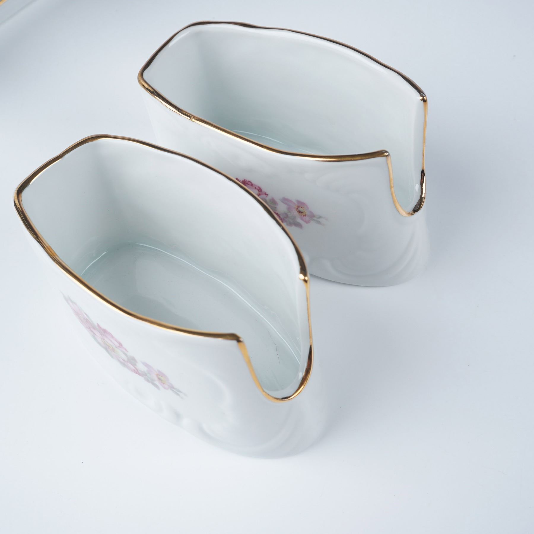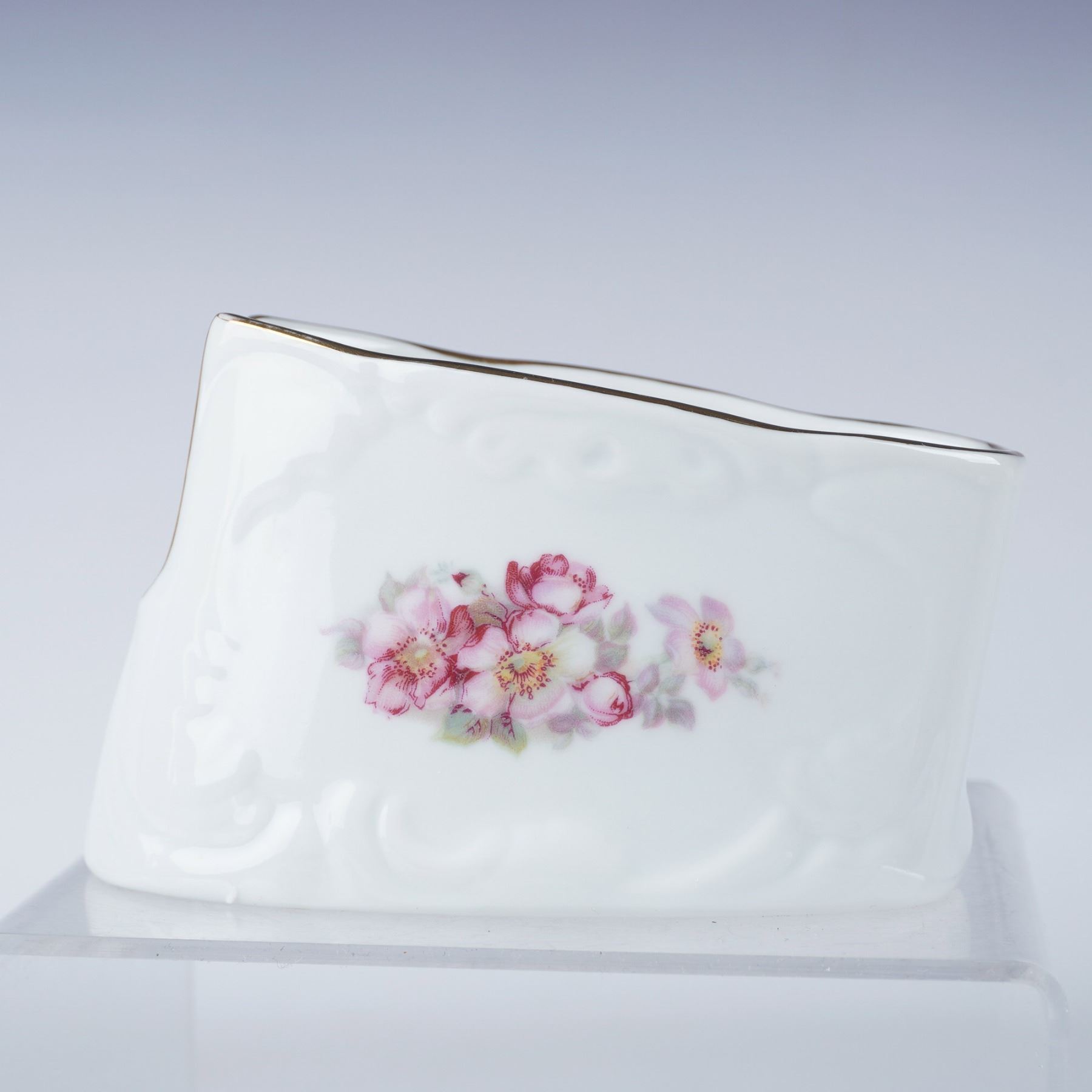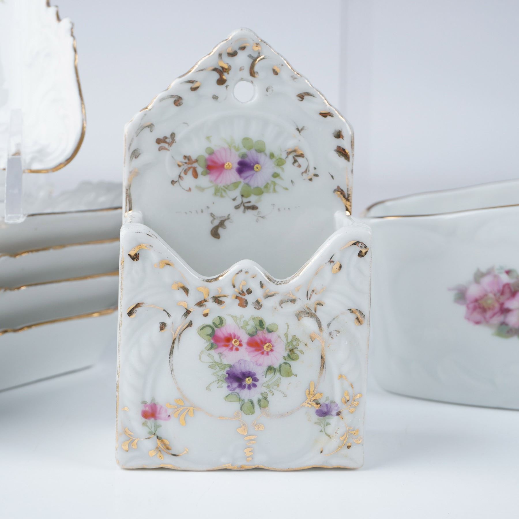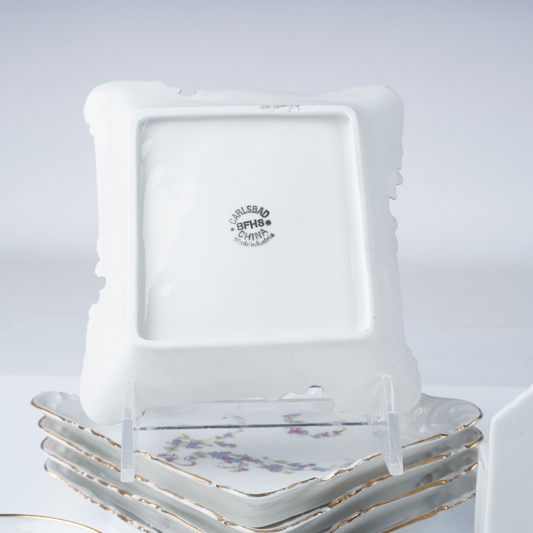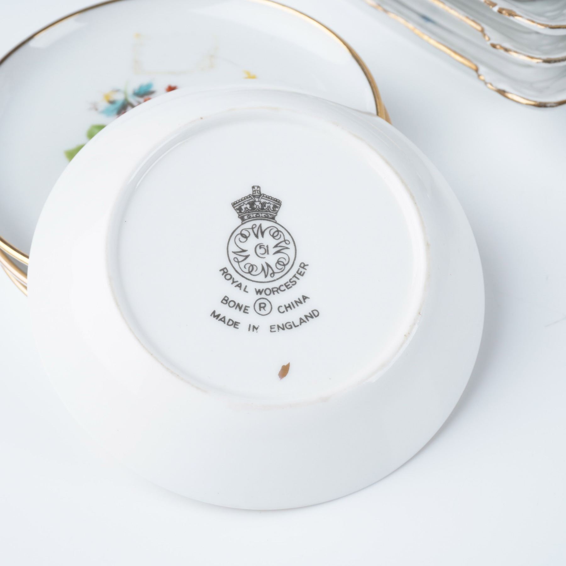 A 12-piece collection of porcelain tableware featuring floral motifs and gold trim, including four small round dishes, five square dishes, a decorative wall pocket, and a pair of spoon rests. The set includes backstamps from Carlsbad China (Austria), Royal Worcester (England), and Gerold Porzellan (West Germany), representing a mix of European porcelain craftsmanship. Each piece highlights fine craftsmanship and vintage charm, making this an excellent addition to any collection or display. Tallest item: 4.25"H.