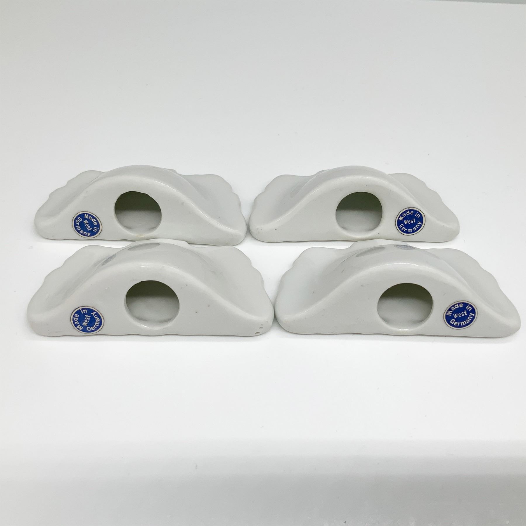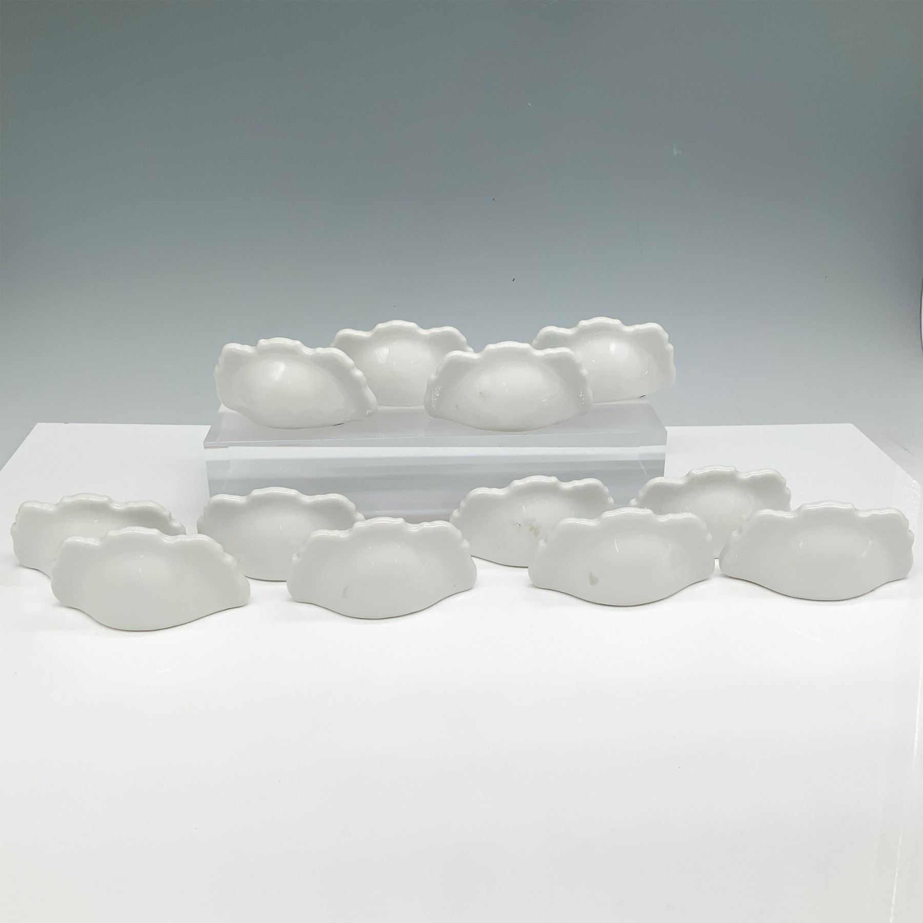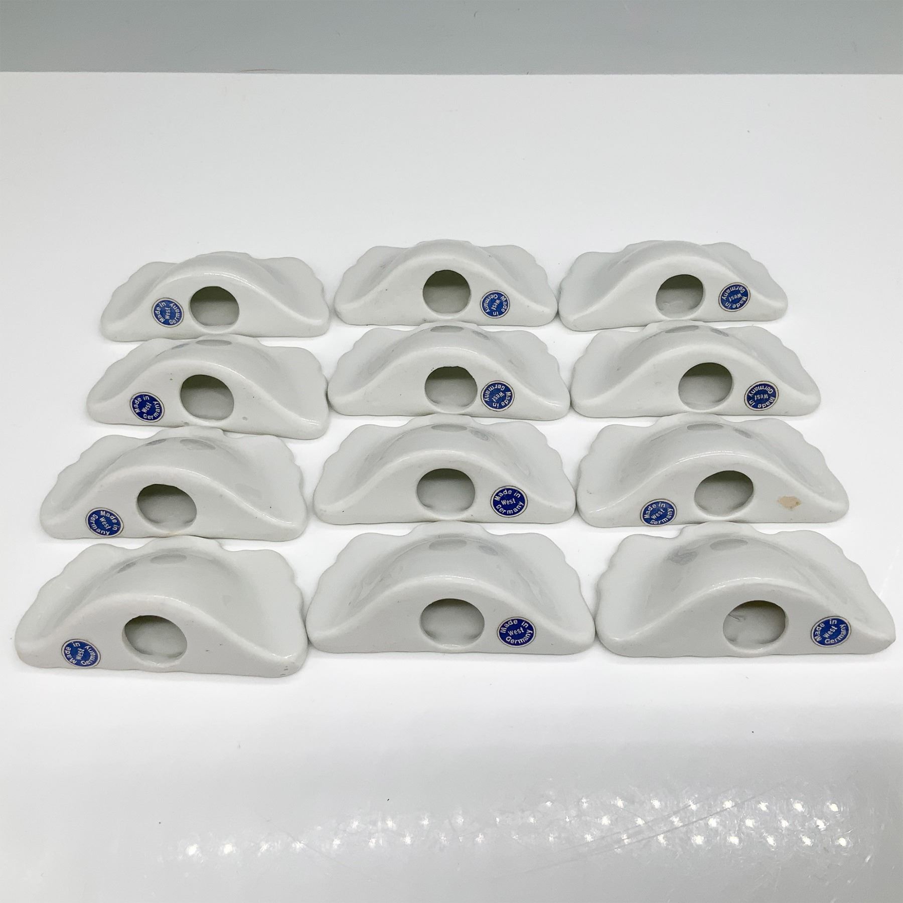 Set of 12 vintage porcelain place card holders, crafted in West Germany. Each piece features an elegant floral design with delicate pink and blue flowers on a white porcelain base. The holders have a scalloped edge and a refined aesthetic, perfect for adding a touch of vintage charm to a formal dining table or event. All pieces retain their original Made in West Germany stickers. A rare and beautiful set for collectors or those who enjoy classic European tableware.