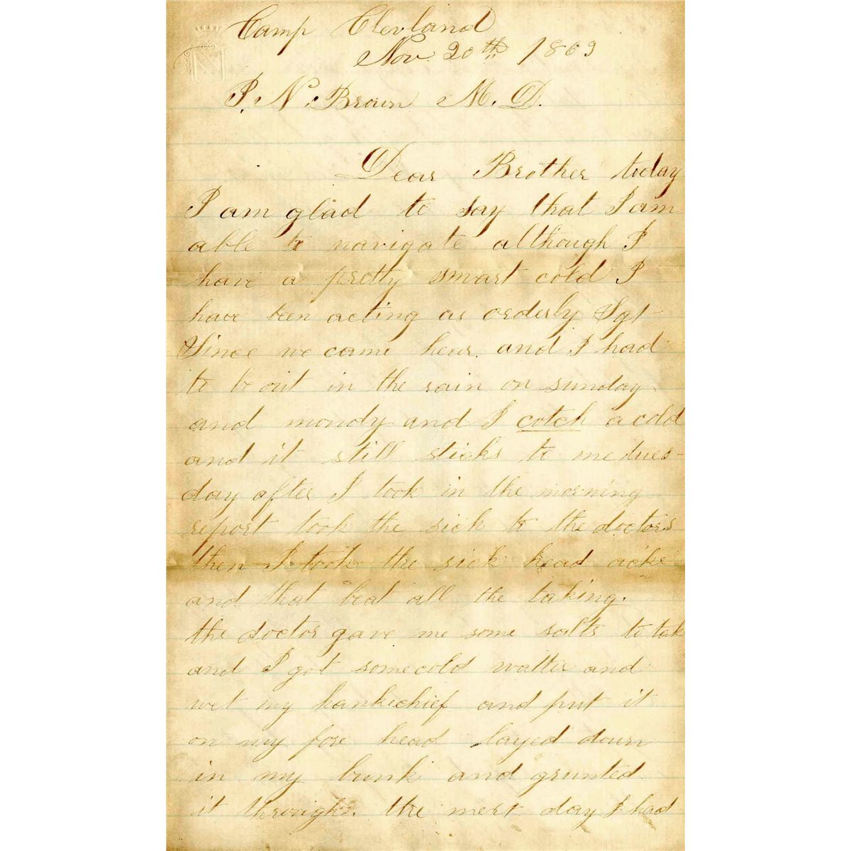 Letter from Quincy A. Brown of the 12th Ohio Infantry to his brother. Accompanied by cover. Written in ink and datelined ''Camp Cleveland / Nov. 20th 1863,'' letter reads in part: ''…I have been acting as orderly Sgt…The doctor gave me some salts to take and I got some cold water and wet my handkerchief and put it on my forehead, layed down in my bunk and grunted it through. The next day I had another attack of the headache. I've had a bad cough ever since. I am taking cough drops…We left Camp Dennison in the morning of the 11th arrived here in the evening. We found it pretty sloppy between here and Cleveland. I have drawn my uniform with the exception of my pants and Cavalry jacket. We have not been mustered into the regiment yet, we expect to be soon. We are Cavalry, armed with muskets. We have plenty of swearing and card playing here and old smoke pipes for a regiment of old women…We expect to move our quarters this evening. I had the honor of shaking the paw of old Johnny Brough. He came to Cleveland on the same train we came on. Saw Lake Erie and also had the honor of seeing General Rosecrans. Yesterday evening he came out to visit the hospital…I am now Commissary Sergeant, don't know whether for good or not…'' Quincy Brown mustered into the 12th Ohio Infantry on 9 November 1863 and was promoted to Sergeant before being transferred to the 9th Ohio Cavalry, Company L. He was discharged for disability on 12 June 1865. During his enlistment Brown saw action at Waynesboro, Aiken, Monroe's Cross-Roads, Averasboro and Bentonville. Letter measures 5'' x 8'' and runs 3pp. Toning, soiling at creases and dampstained edges, otherwise excellent condition.