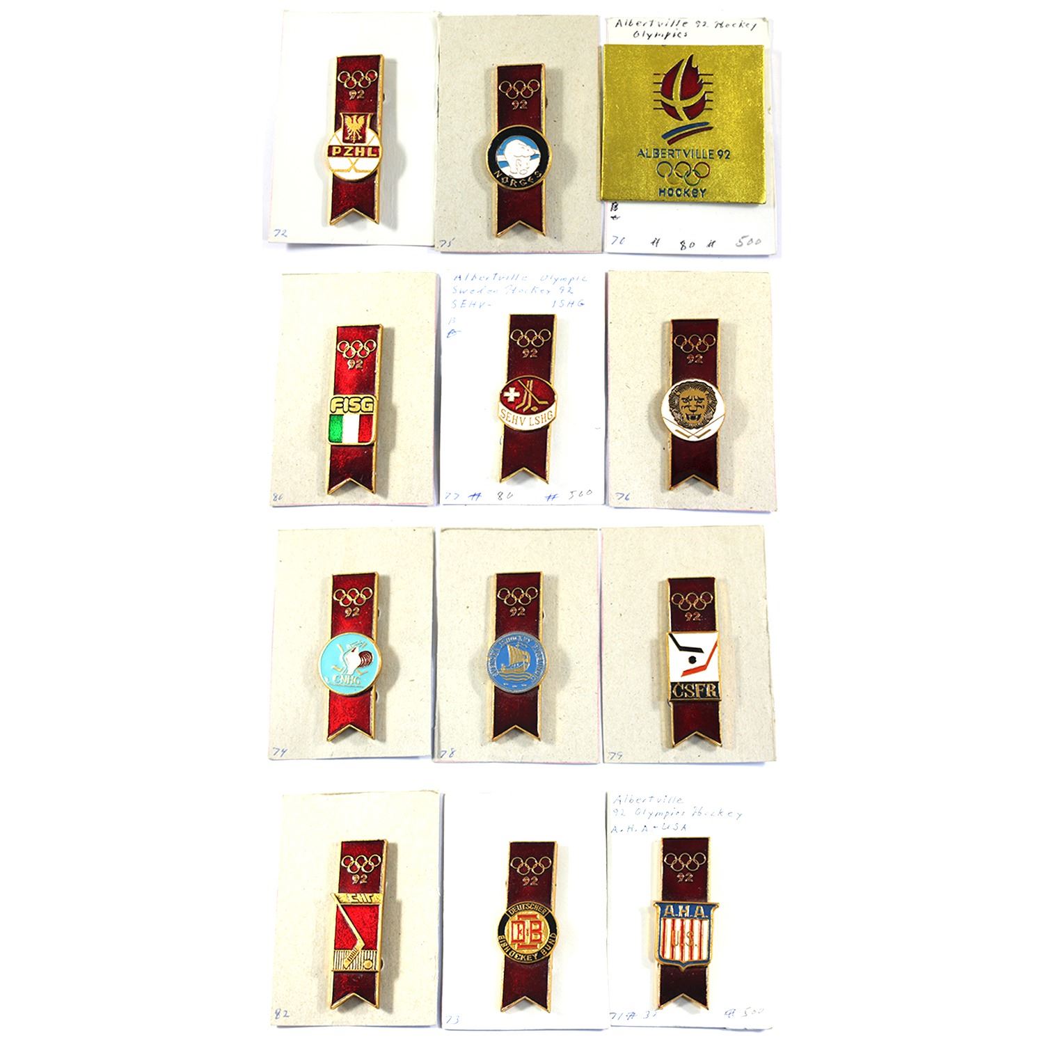 12x 1992 Albertville Winter Olympics Assorted Pins in Vintage Cracker Barrel Tin. Lot Includes: 7x Assorted Pins (6.5mm x 1.8mm), & Albertville '92 Hockey Pin (6mm x 6mm). 12pcs.
