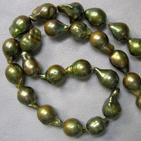 IRIDESCENT GREEN JAPANESE AKOYA PEARL STRAND. EACH PEARL MEASURES 12x10 MM APPROXIMATELY. BAROQUE. SOME BLEMISHES VISIBLE. LENGTH: 16 INCHES