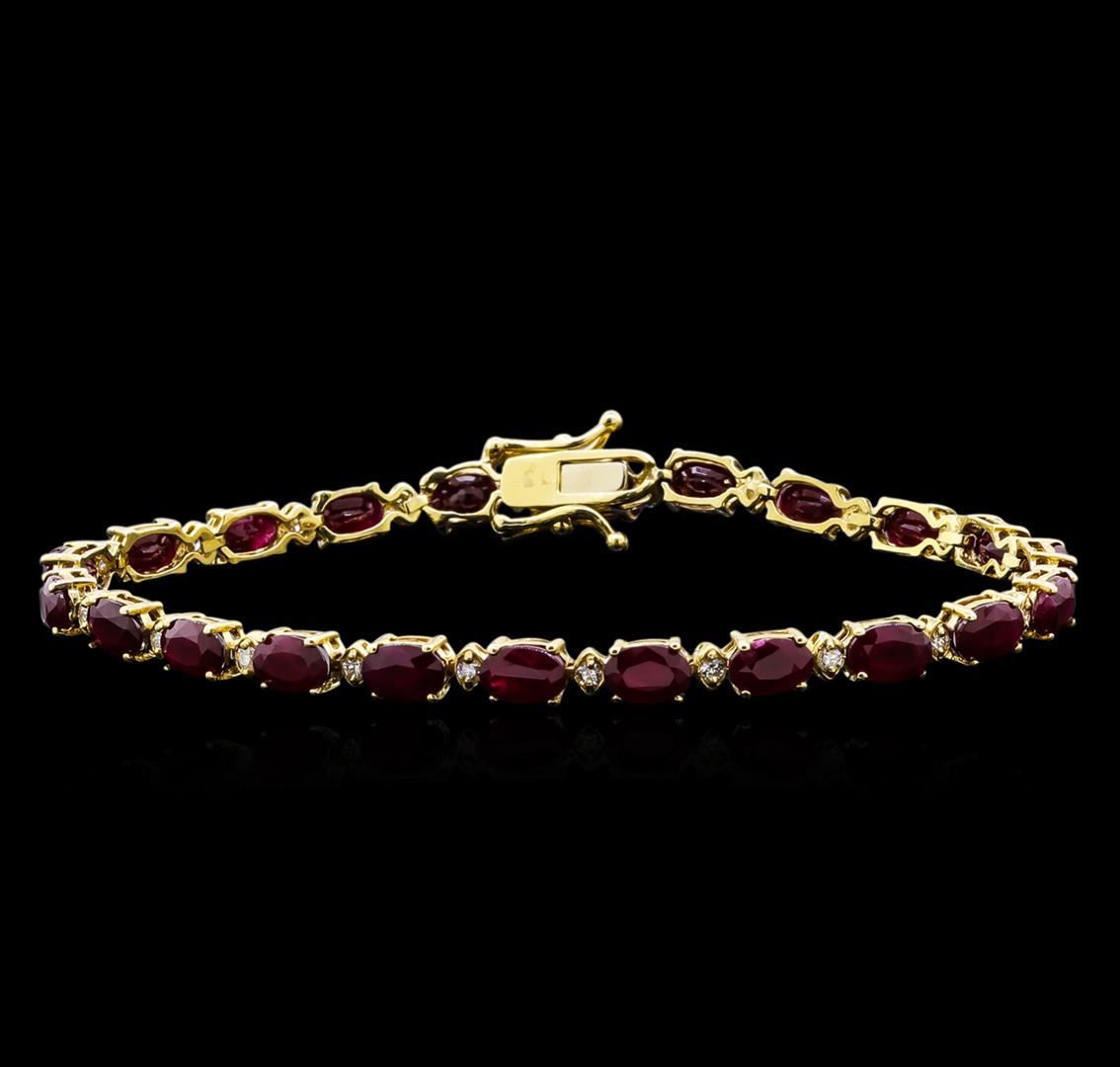 One 14KT yellow gold 13.00ct ruby and diamond bracelet. Metal: 14KT solid yellow gold. Face Measurements: 4 x 185mm. Size: 7.5. Finish: Bright polish. Total Item Weight: 9.20 grams. Markings: Stamped 14K. Country Made: USA. Containing: 22 oval Rubies with a total weight of 13.00ct. Measuring: 4 x 6mm. Color: Red. Treatment: None. Setting: Prong. Saturation: Moderately strong. Tone: Medium dark. Clarity: Type 2. Cut: Very good. The rubies are complemented by 22 round Diamonds with a total weight of 0.55ct. Measuring: 1.7mm. Treatment: None. Setting: Prong. Color Grade: G - H. Clarity: SI1 - SI2. Cut: Very good. Excellent workmanship. Gemstones graded in the setting. BHGL Appraised at $8,500.00.
