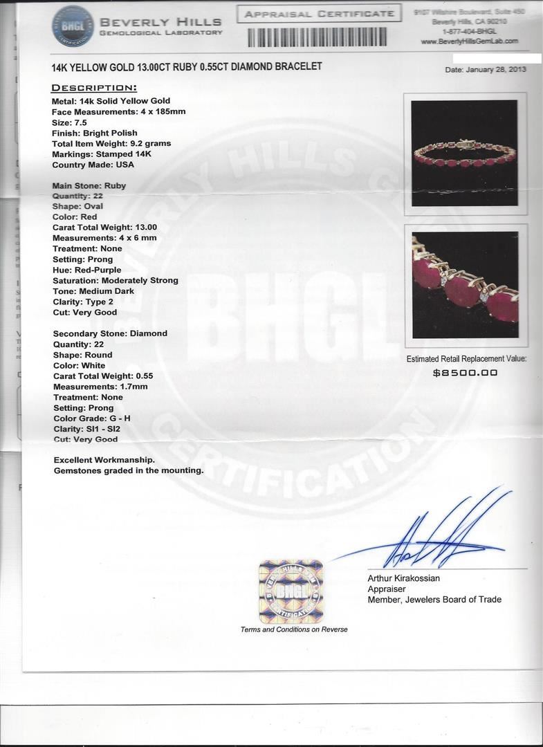One 14KT yellow gold 13.00ct ruby and diamond bracelet. Metal: 14KT solid yellow gold. Face Measurements: 4 x 185mm. Size: 7.5. Finish: Bright polish. Total Item Weight: 9.20 grams. Markings: Stamped 14K. Country Made: USA. Containing: 22 oval Rubies with a total weight of 13.00ct. Measuring: 4 x 6mm. Color: Red. Treatment: None. Setting: Prong. Saturation: Moderately strong. Tone: Medium dark. Clarity: Type 2. Cut: Very good. The rubies are complemented by 22 round Diamonds with a total weight of 0.55ct. Measuring: 1.7mm. Treatment: None. Setting: Prong. Color Grade: G - H. Clarity: SI1 - SI2. Cut: Very good. Excellent workmanship. Gemstones graded in the setting. BHGL Appraised at $8,500.00.