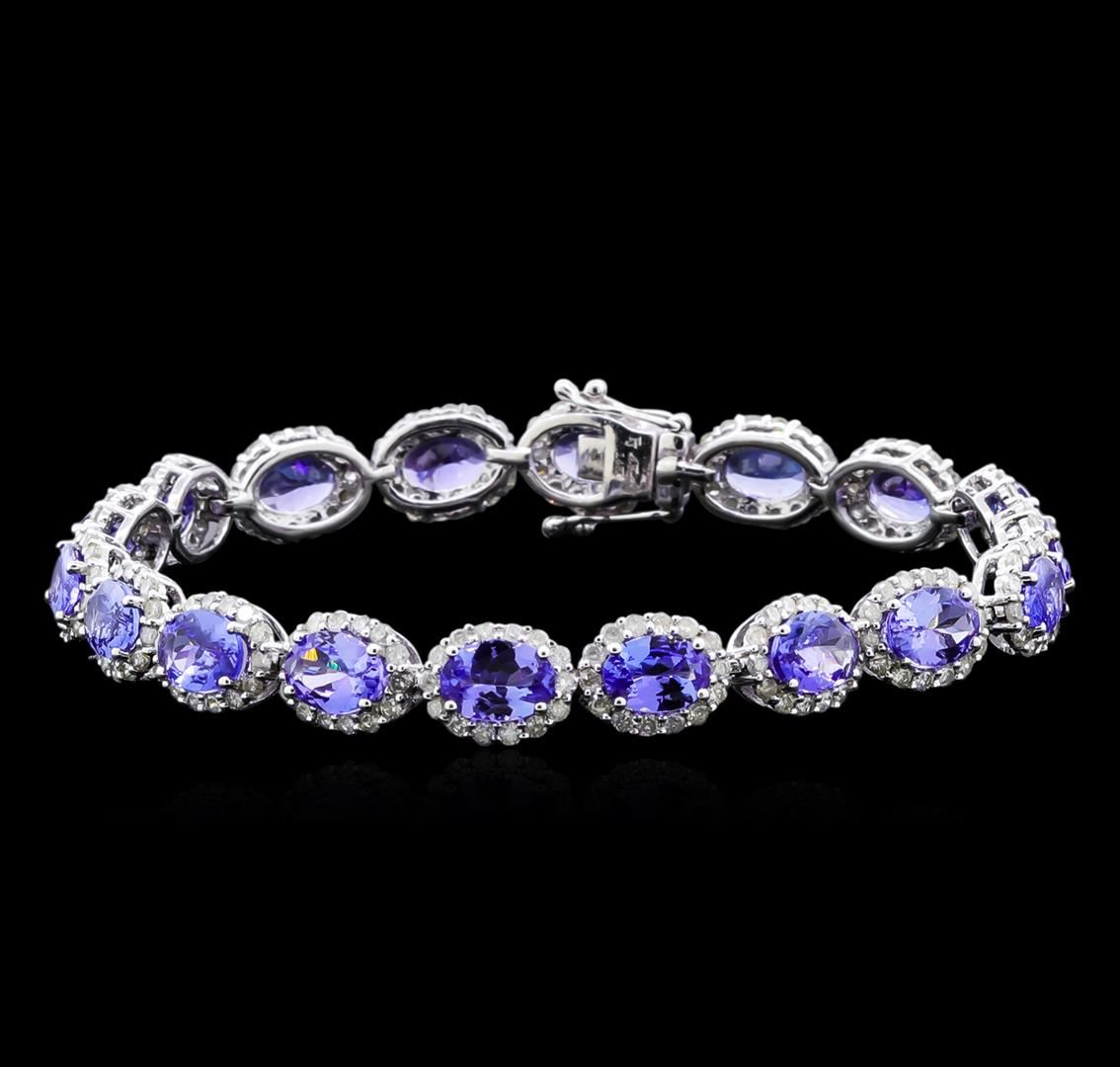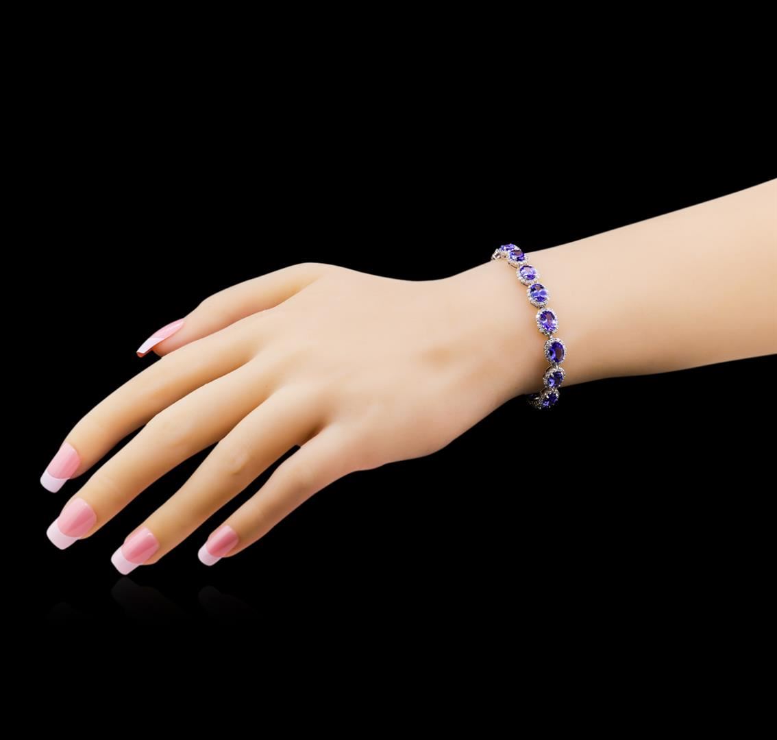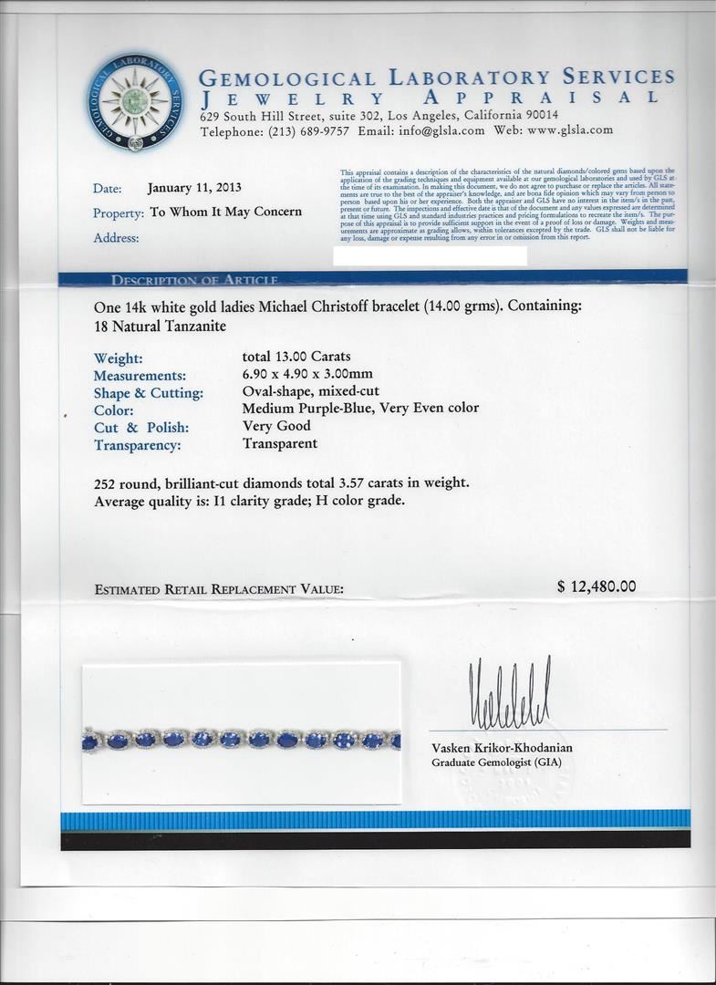 One 14KT white gold ladies Michael Christoff bracelet weighing a total of 14.00 grams. Containing: 18 Natural Tanzanites: Weight: Total 13.00ct. Measurements: 6.90 x 4.90 x 3.00mm. Shape & Cutting: Oval-shaped, mixed-cut. Color: Medium purple-blue, very even color. Cut & Polish: Very good. Transparency: Transparent. The tanzanites are complemented by 252 round, brilliant-cut diamonds with a total weight of 3.57ct. Clarity Grade: I1. Color Grade: H. GLS Appraised at $12,480.00.
