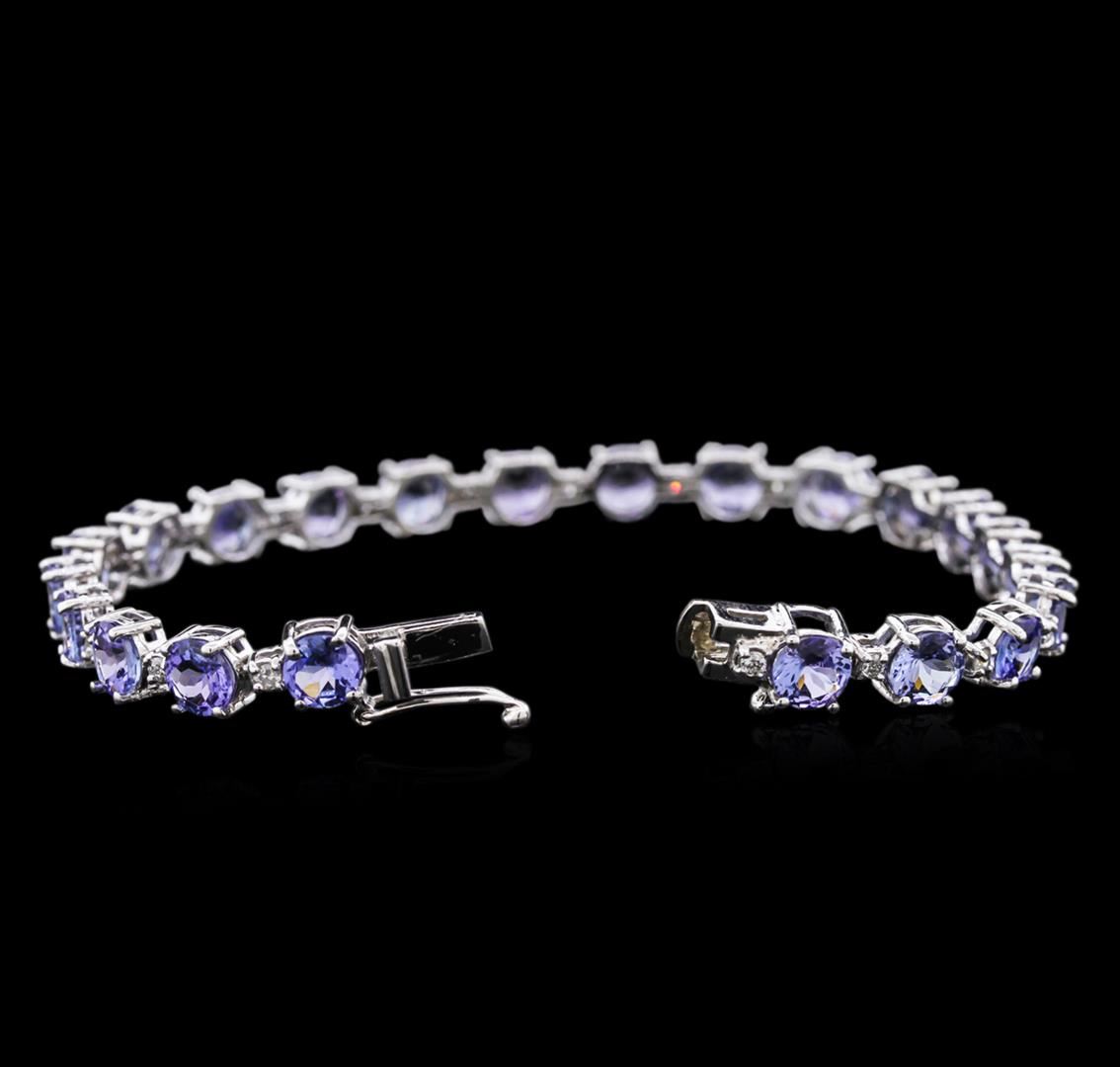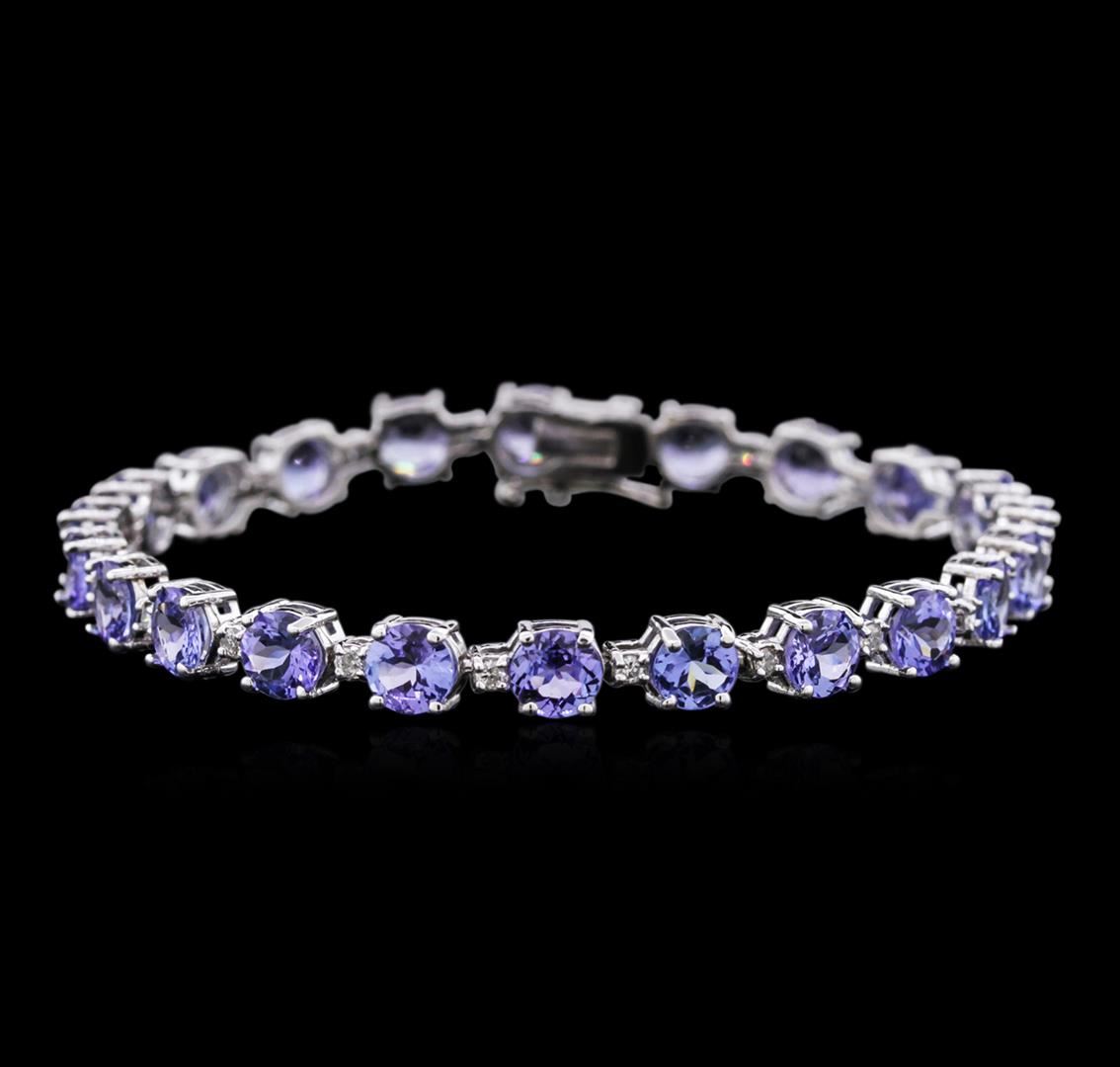 One electronically tested 14KT white gold ladies cast tanzanite and diamond bracelet with a hidden box clasp with safety closer with a bright polish finish. 7" in length. Identified with markings of "14K". Condition is new. Containing: Twenty-two prong set round modified brilliant cut natural tanzanites, measuring 5.50 - 5.50 x 3.58 mm, approximate. Total Weight of 13.00ct., clarity is eye clean, type I, medium light, very slightly grayish, violet color, (GIA V 4/3), cut is good. Colored gemstones are presumed to have been subjected to commonly used enhancement processes. All colored gemstones are graded in the mounting, unless otherwise stated.Twenty-Two prong set round brilliant cut diamonds, measuring 1.90 - 1.90 x 1.14mm (depth est.) approximate. Total Weight of 22 Stones = 0.55ct. Clarity: I-1 to I-2. Color: I - J, Cut is Good. Colored gemstones are presumed to have been subjected to commonly used enhancement processes. All diamonds and colored gemstones are graded in the mounting, unless otherwise stated. Total Weight of Colored Stones 13.00ct. Total Weight of Diamonds 0.55ct. Total Weight of Bracelet 11.70 grams. GGL Appraised at $4,965.00.