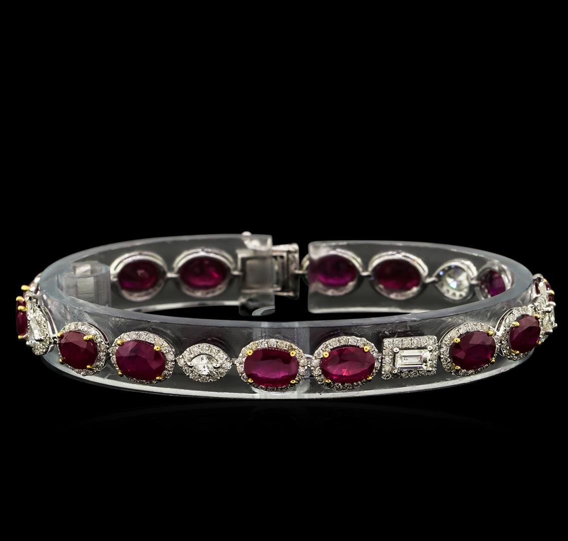 One electronically tested 18KT white gold lady's combination cast & assembled tennis bracelet with a tongue clasp with foldover safety with a bright polish finish. The featured ladies' bracelet measures 7.25 inches in length. Trademark is MICHA. Condition is new, good workmanship. Containing: Fourteen prong set oval modified brilliant cut natural rubies, measuring 7.00 x 5.10 x 3.15mm, approximate total weight of 13.02ct., clarity is moderately included, type II, medium dark, moderately strong, red color, (GIA R 6/4), cut is good. Colored gemstones are presumed to have been subjected to commonly used enhancement processes. Graded in the setting. Two prong set pear shaped cut diamonds, measuring 4.50 x 3.50 x 2.21mm (depth est.) approximate total weight of 2 Stones = 0.40ct. Graded in the setting. Clarity: SI-1 to SI-2. Color: H - I. Cut Good Two prong set emerald cut diamonds, measuring 4.80 x 2.80 x 1.87mm (depth est.) approximate total weight of 2 Stones = 0.45ct. Graded in the setting. Clarity: VS-1 to VS-2. Color: G - Very Good One prong set princess cut diamond, measuring 3.00 x 2.95 x 2.28mm (depth est.) approximate weight of 0.16ct. Graded in the setting. Clarity: VS-2. Color: Very Good One prong set marquise shaped cut diamond, measuring 5.10 x 2.60 x 1.64mm (depth est.) approximate weight of 0.13ct. Graded in the setting. Clarity: SI-1. Color: Very Good One prong set triangle brilliant cut diamond, measuring 4.00 x 3.85 x 1.90mm (depth est.) approximate weight of 0.17ct. Graded in the setting. Clarity: SI-2. Color: Good Three Hundred Fifty-Eight prong set round brilliant cut diamonds, measuring 1.30 - 1.20 x 0.75mm (depth est.) approximate total weight of 358 Stones = 2.49ct. Graded in the setting. Clarity: SI-1 to I-1. Color: G - I. Cut Good. Total Weight of Colored Stones 13.02ct. Total Weight of Diamonds 3.80ct. Total Weight of Bracelet 11.10gm. GAS Appraised at $32,130.00.