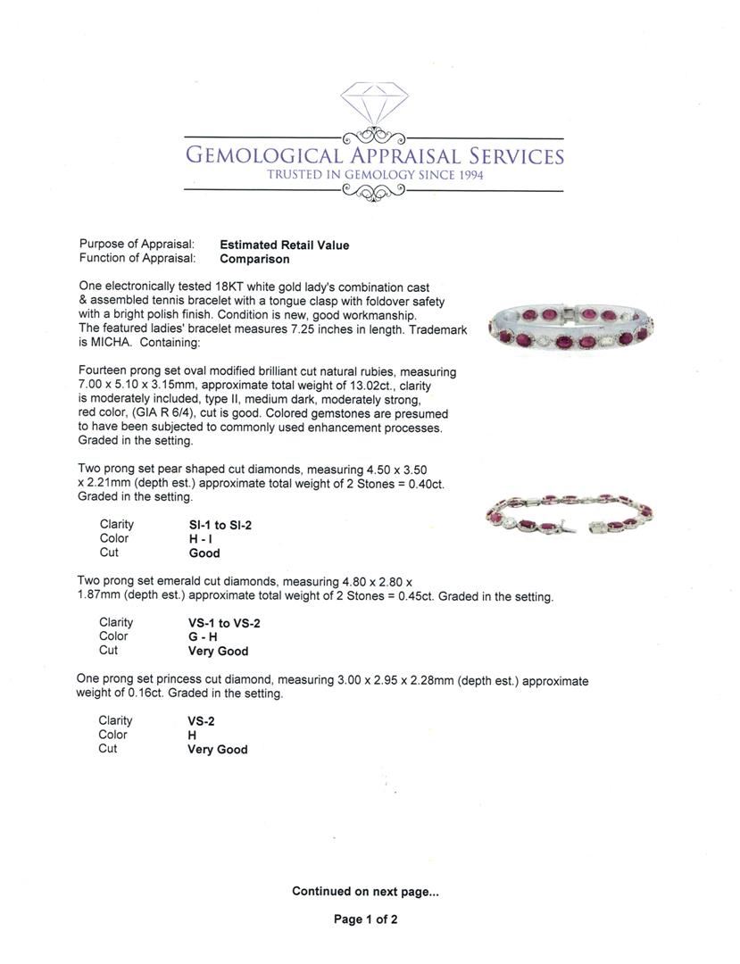 One electronically tested 18KT white gold lady's combination cast & assembled tennis bracelet with a tongue clasp with foldover safety with a bright polish finish. The featured ladies' bracelet measures 7.25 inches in length. Trademark is MICHA. Condition is new, good workmanship. Containing: Fourteen prong set oval modified brilliant cut natural rubies, measuring 7.00 x 5.10 x 3.15mm, approximate total weight of 13.02ct., clarity is moderately included, type II, medium dark, moderately strong, red color, (GIA R 6/4), cut is good. Colored gemstones are presumed to have been subjected to commonly used enhancement processes. Graded in the setting. Two prong set pear shaped cut diamonds, measuring 4.50 x 3.50 x 2.21mm (depth est.) approximate total weight of 2 Stones = 0.40ct. Graded in the setting. Clarity: SI-1 to SI-2. Color: H - I. Cut Good Two prong set emerald cut diamonds, measuring 4.80 x 2.80 x 1.87mm (depth est.) approximate total weight of 2 Stones = 0.45ct. Graded in the setting. Clarity: VS-1 to VS-2. Color: G - Very Good One prong set princess cut diamond, measuring 3.00 x 2.95 x 2.28mm (depth est.) approximate weight of 0.16ct. Graded in the setting. Clarity: VS-2. Color: Very Good One prong set marquise shaped cut diamond, measuring 5.10 x 2.60 x 1.64mm (depth est.) approximate weight of 0.13ct. Graded in the setting. Clarity: SI-1. Color: Very Good One prong set triangle brilliant cut diamond, measuring 4.00 x 3.85 x 1.90mm (depth est.) approximate weight of 0.17ct. Graded in the setting. Clarity: SI-2. Color: Good Three Hundred Fifty-Eight prong set round brilliant cut diamonds, measuring 1.30 - 1.20 x 0.75mm (depth est.) approximate total weight of 358 Stones = 2.49ct. Graded in the setting. Clarity: SI-1 to I-1. Color: G - I. Cut Good. Total Weight of Colored Stones 13.02ct. Total Weight of Diamonds 3.80ct. Total Weight of Bracelet 11.10gm. GAS Appraised at $32,130.00.
